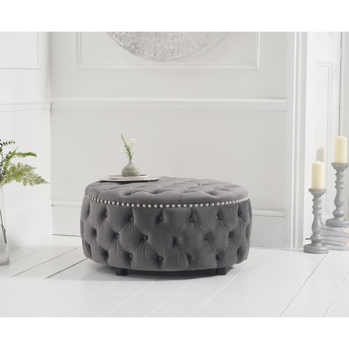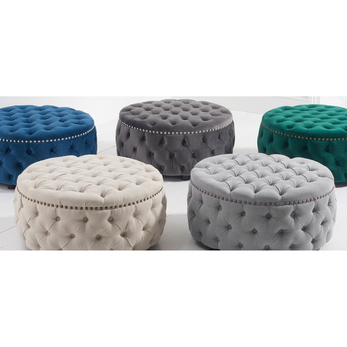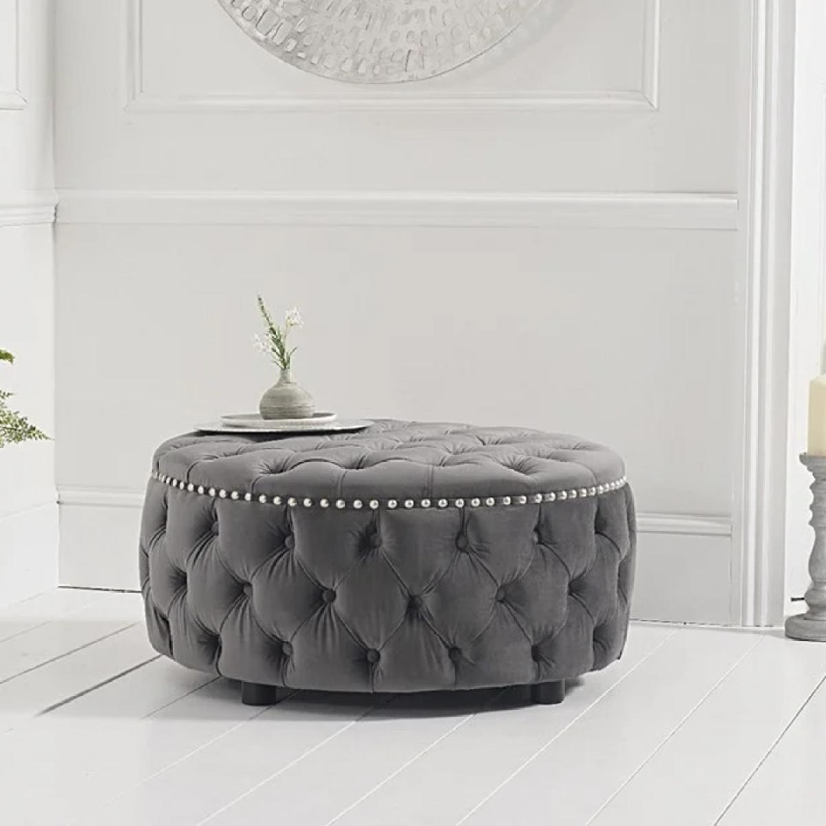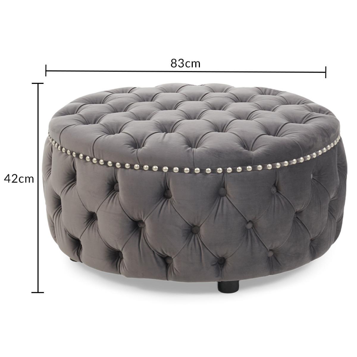 So chic for an additional touch of elegance and plush texture in your living room, the Flora Round Footstool in our gorgeous lush Grey Velvet upholstery boasts an all over deep-buttoned design and a contemporary metal studded trim. Flat to the top, with short and sturdy solid wood legs for a luxe, low-to-the-floor style. Lush velvet adds a luxurious and super-soft touch Contemporary metal studs and a classic deep-buttoned design make for a completely unique piece. Low to the floor for effortless leg-resting. We Love: combining with our Grey Velvet Flora Chaise Sofa (right or left facing) to create the perfect living room set-up. Also available in: Green Velvet (Round and Square), Blue Velvet (Round and Square), Grey Linen (Round and Square), Cream Linen (Round and Square).