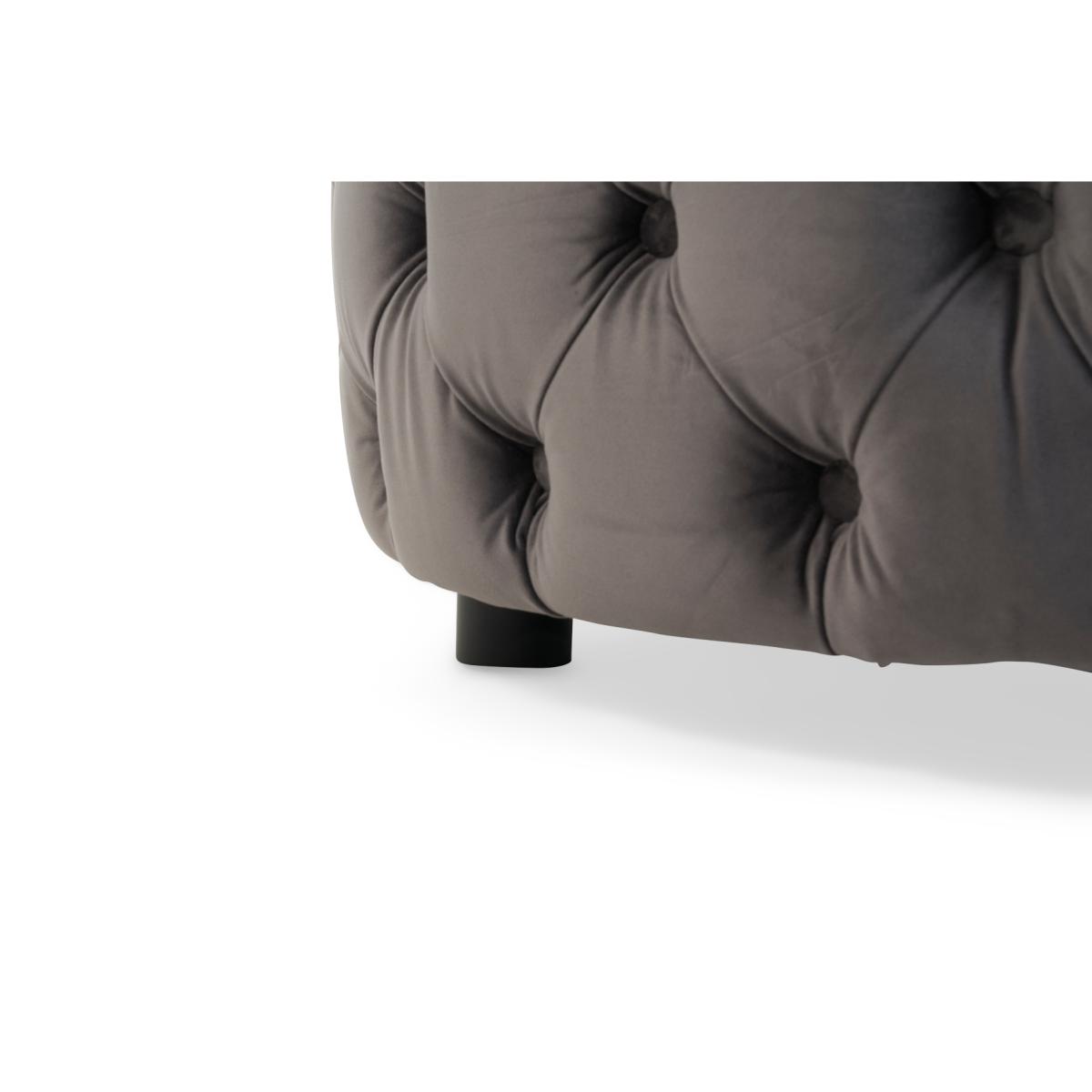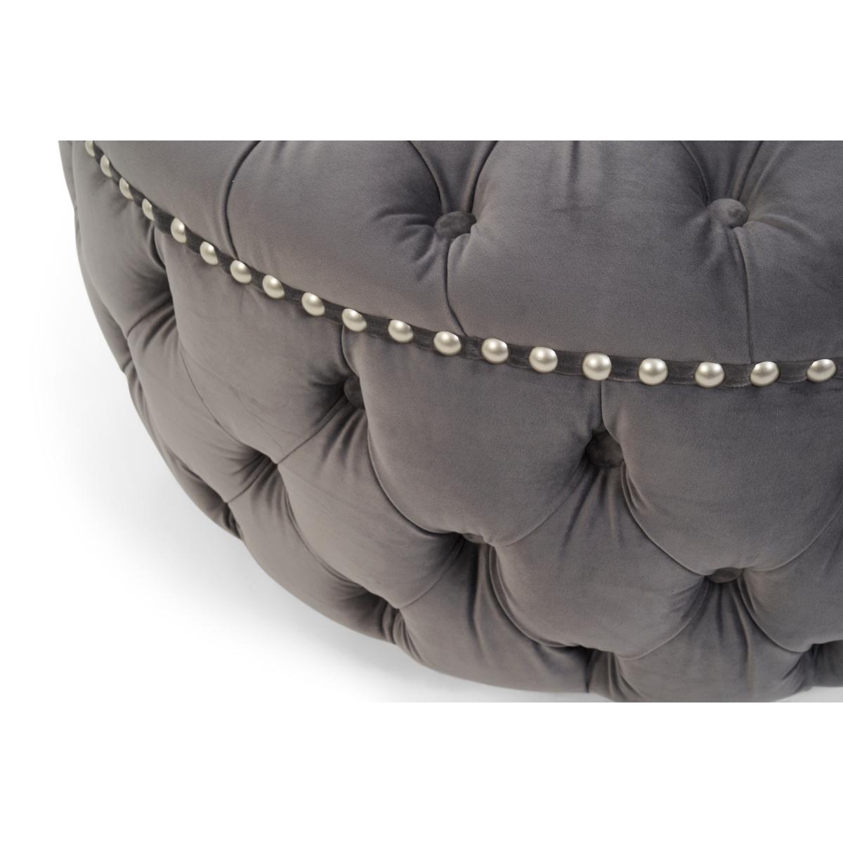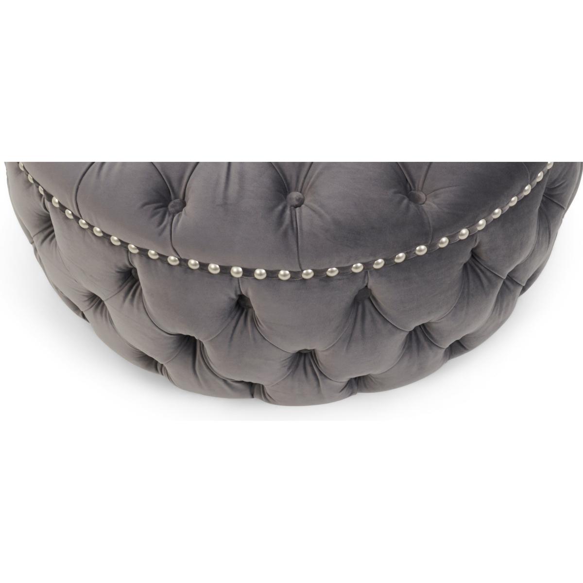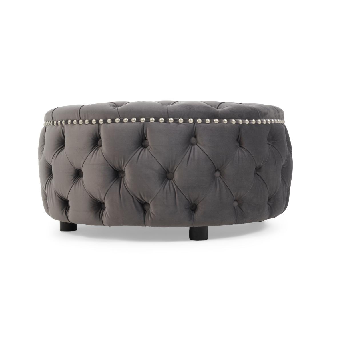 So chic for an additional touch of elegance and plush texture in your living room, the Flora Round Footstool in our gorgeous lush Grey Velvet upholstery boasts an all over deep-buttoned design and a contemporary metal studded trim. Flat to the top, with short and sturdy solid wood legs for a luxe, low-to-the-floor style. Lush velvet adds a luxurious and super-soft touch Contemporary metal studs and a classic deep-buttoned design make for a completely unique piece. Low to the floor for effortless leg-resting. We Love: combining with our Grey Velvet Flora Chaise Sofa (right or left facing) to create the perfect living room set-up. Also available in: Green Velvet (Round and Square), Blue Velvet (Round and Square), Grey Linen (Round and Square), Cream Linen (Round and Square).