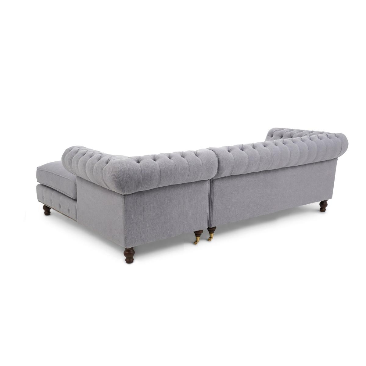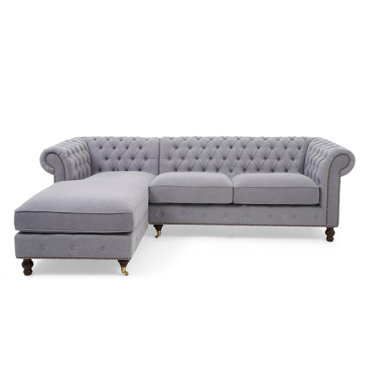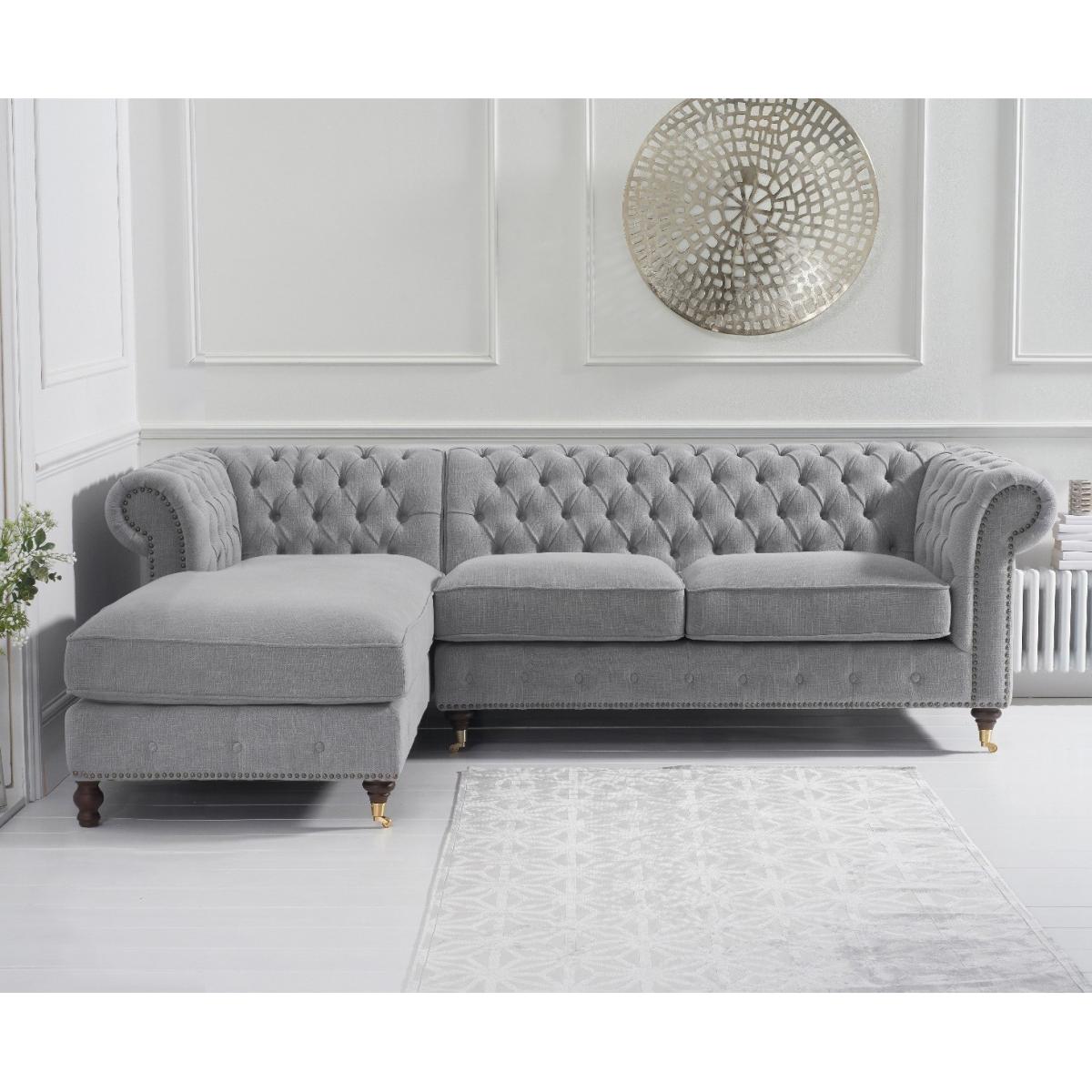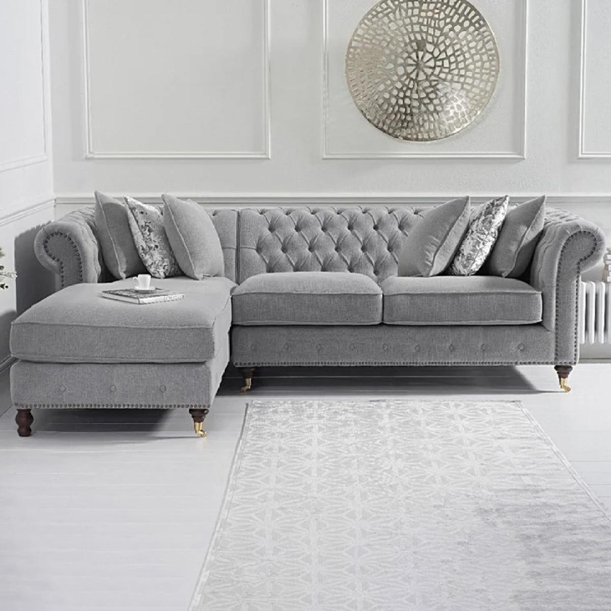The ultimate in comfort-meets-luxury, the elegant Grey Medium Flora Chaise Sofa boasts all the charm of the classic Chesterfield, with subtle details to add a modern touch. Upholstered in our smooth, cool linen, with scrolled statement arms trimmed in contemporary metal studs, a deep-buttoned back and plump, foam-filled cushioned seats. Upholstered in smooth, light linen for asoft and cool touchon the skin. Comes complete with 5matching scatter cushionsto style, and lounge on. The ultimate in everydaycosy comfortwith deep, foam-filled seats. Trimmed inshining Bronze metal studsfor a contemporary finish. A deep-buttoned back and arms add tonal texture andclassic Chesterfield charm. Low wooden legs withmatching metal feetadd support and modern metallic detail. Seats 6 +for a sofa truly fit for a full family home