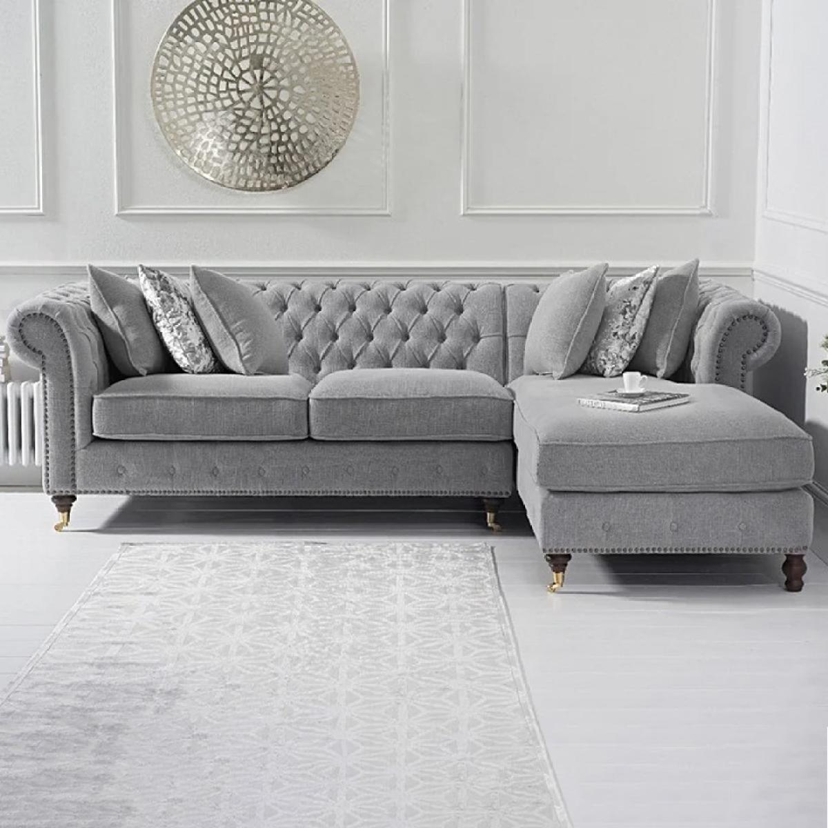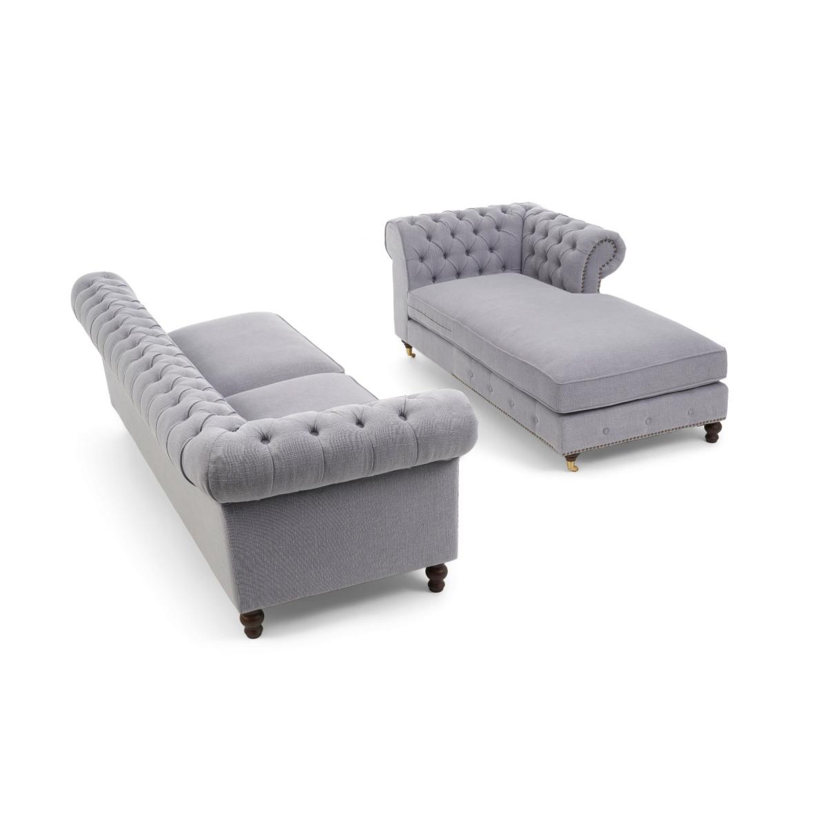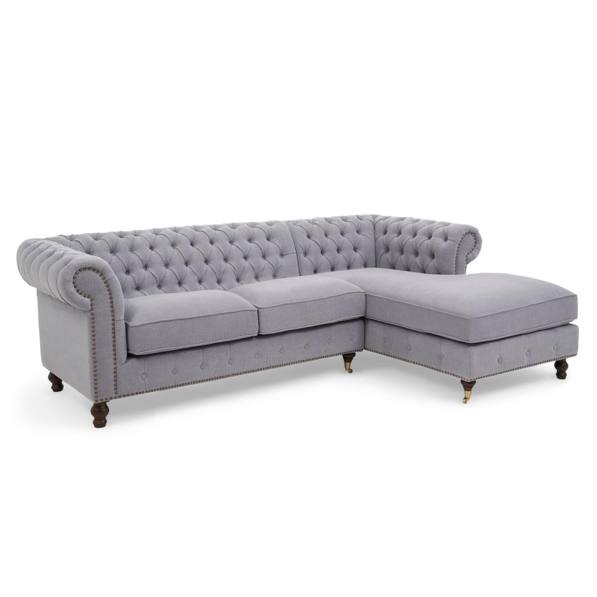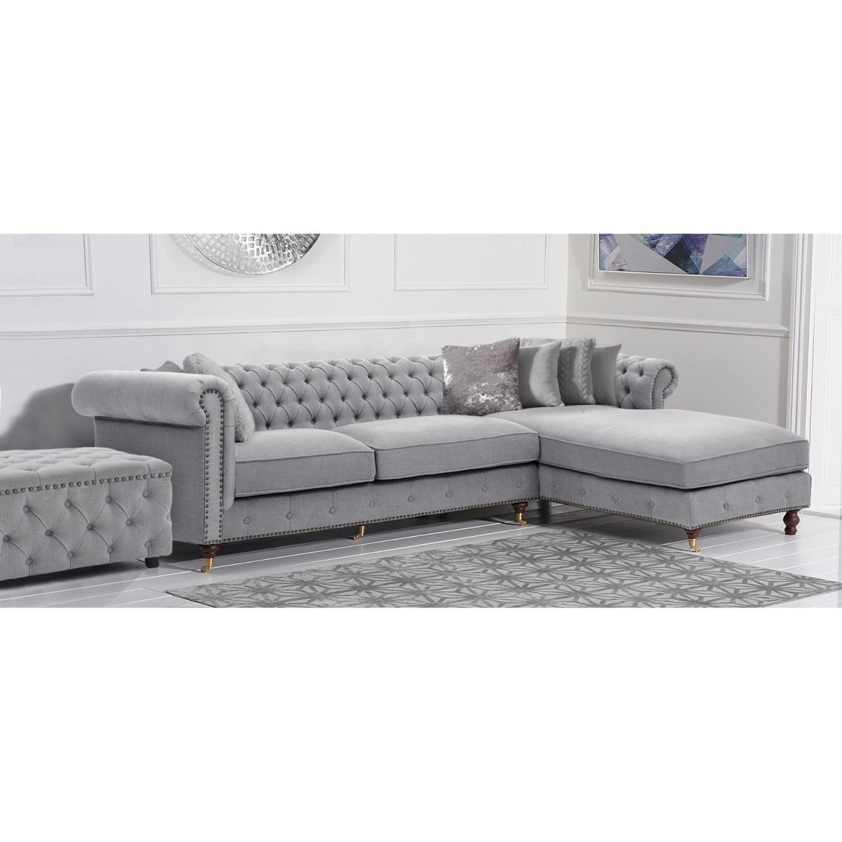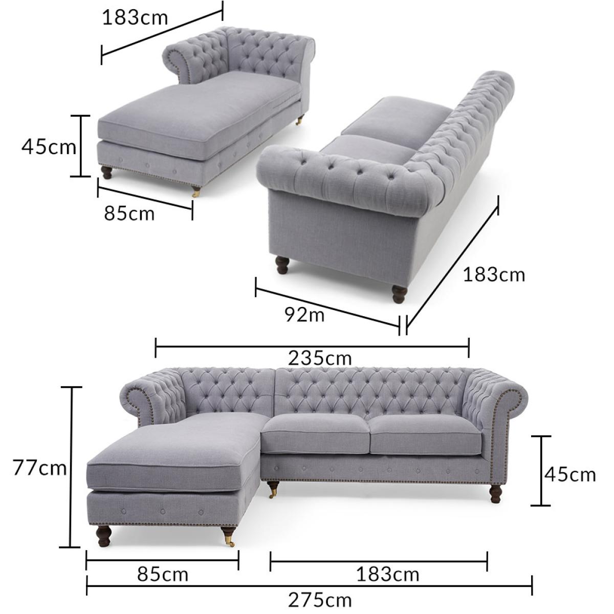 Elegant, timeless and the ultimate in comfort-meets-luxury, the Flora Medium Chaise in our light Grey Linen fabrication boasts all the classic stylings of the much-loved Chesterfield, with a chic chaise addition and fresh details for a modern feel. Right facing, with scrolled statement arms trimmed in subtle metal studs, a deep-buttoned back and plump, foam-filled cushioned seats. Upholstered in smooth, light linen for asoft and cool touchon the skin. The ultimate in everydaycosy comfortwith deep, foam-filled seats. Comes complete with 5matching scatter cushionsto style, and lounge on. Trimmed inshining Bronze metal studsfor a contemporary finish. A deep-buttoned back and arms add tonal texture andclassic Chesterfield charm. Low wooden legs with matching metal feet add support and modern metallic detail. Seats 6 +for a sofa truly fit for a full family home.