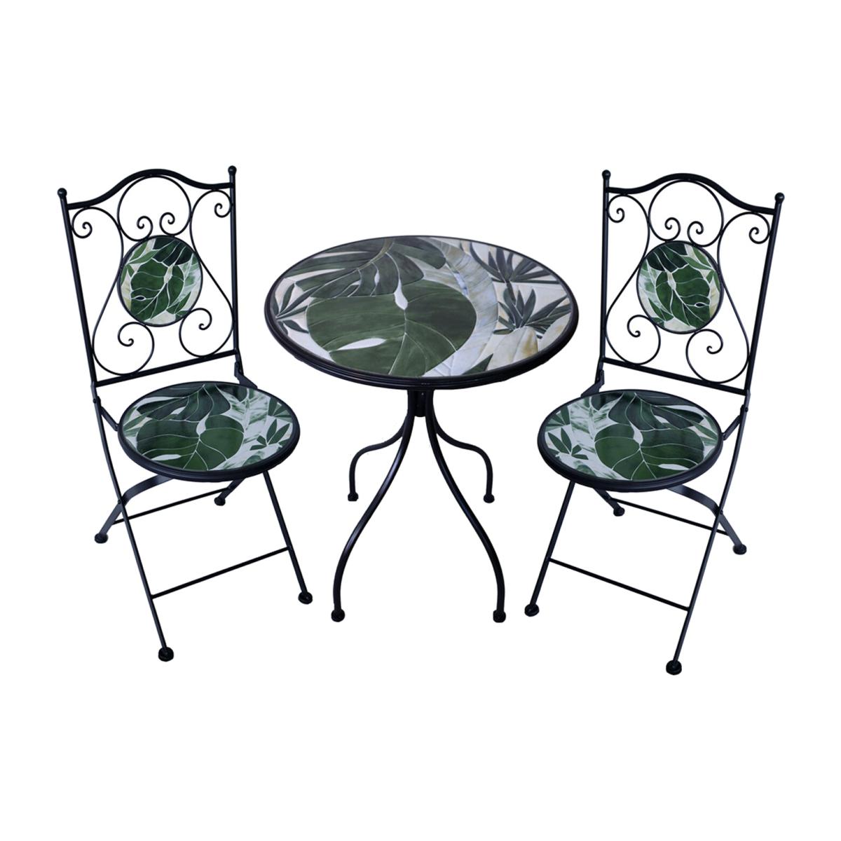 Bring charm and functionality to your outdoor space with the Flora Mosaic Bistro Set. Super stylish, this set features decorative plant motifs on its tabletop and seats, combining artistic appeal with outdoor suitability. Its sturdy black wrought iron frame offers stability, while the foldable feature ensures easy storage. Perfect for balconies, courtyards, patios and more, it makes a great choice for tea-drinking or simply unwinding. Flora Mosaic Bistro Set