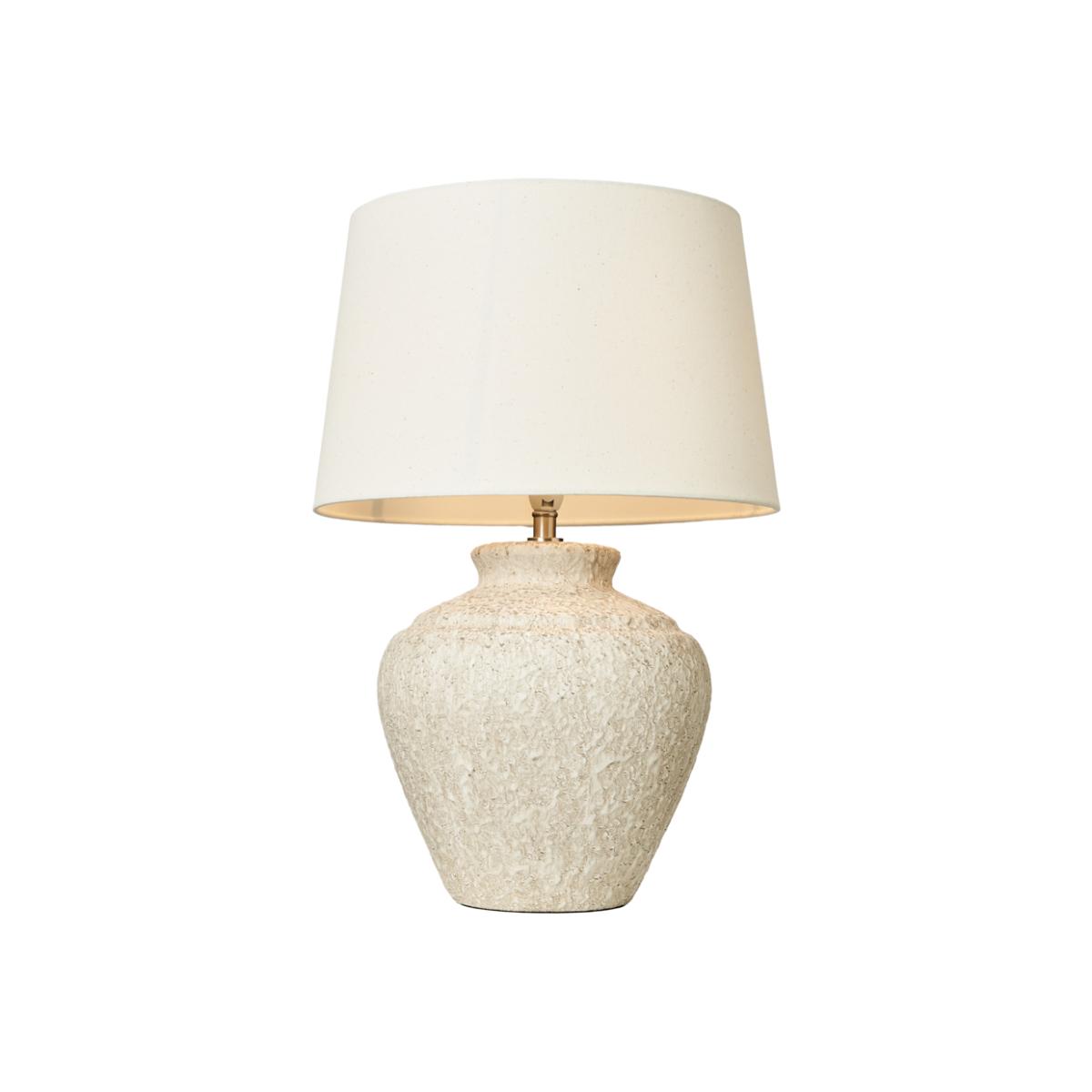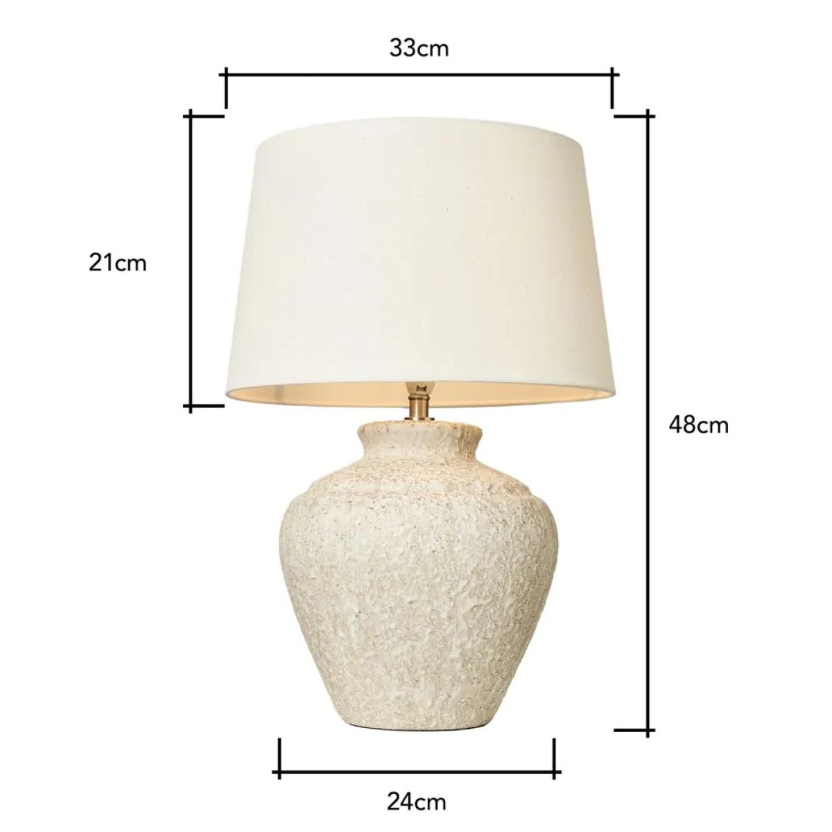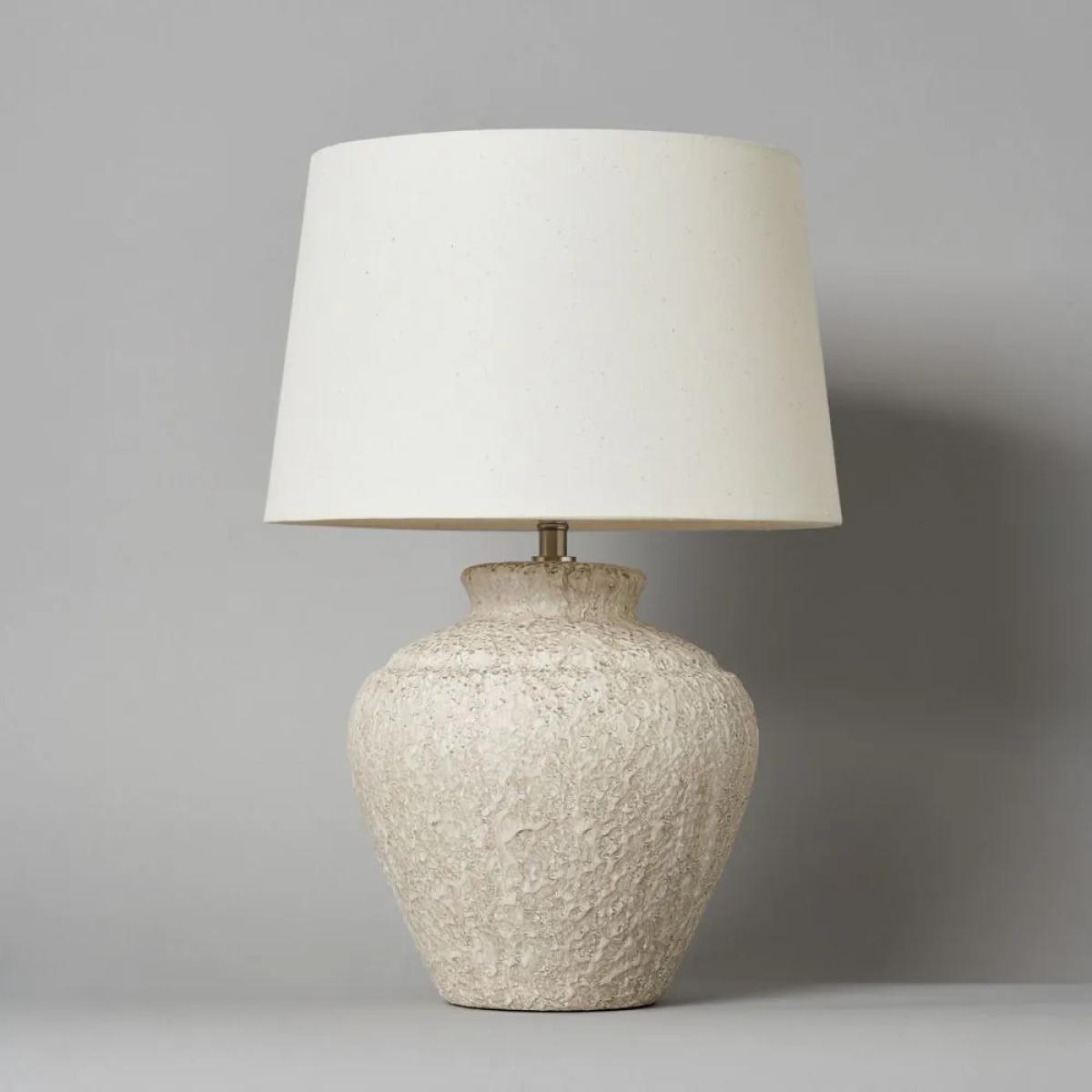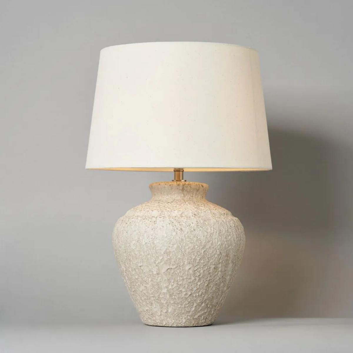 Infuse your home with a touch of nature using the Flora Stone Effect Table Lamp in Natural. Crafted with a weathered ceramic vase-shaped base, this bedside lamp creates a warm and inviting ambience. The neutral fabric tapered shade diffuses light beautifully, making it a stylish yet functional piece.
