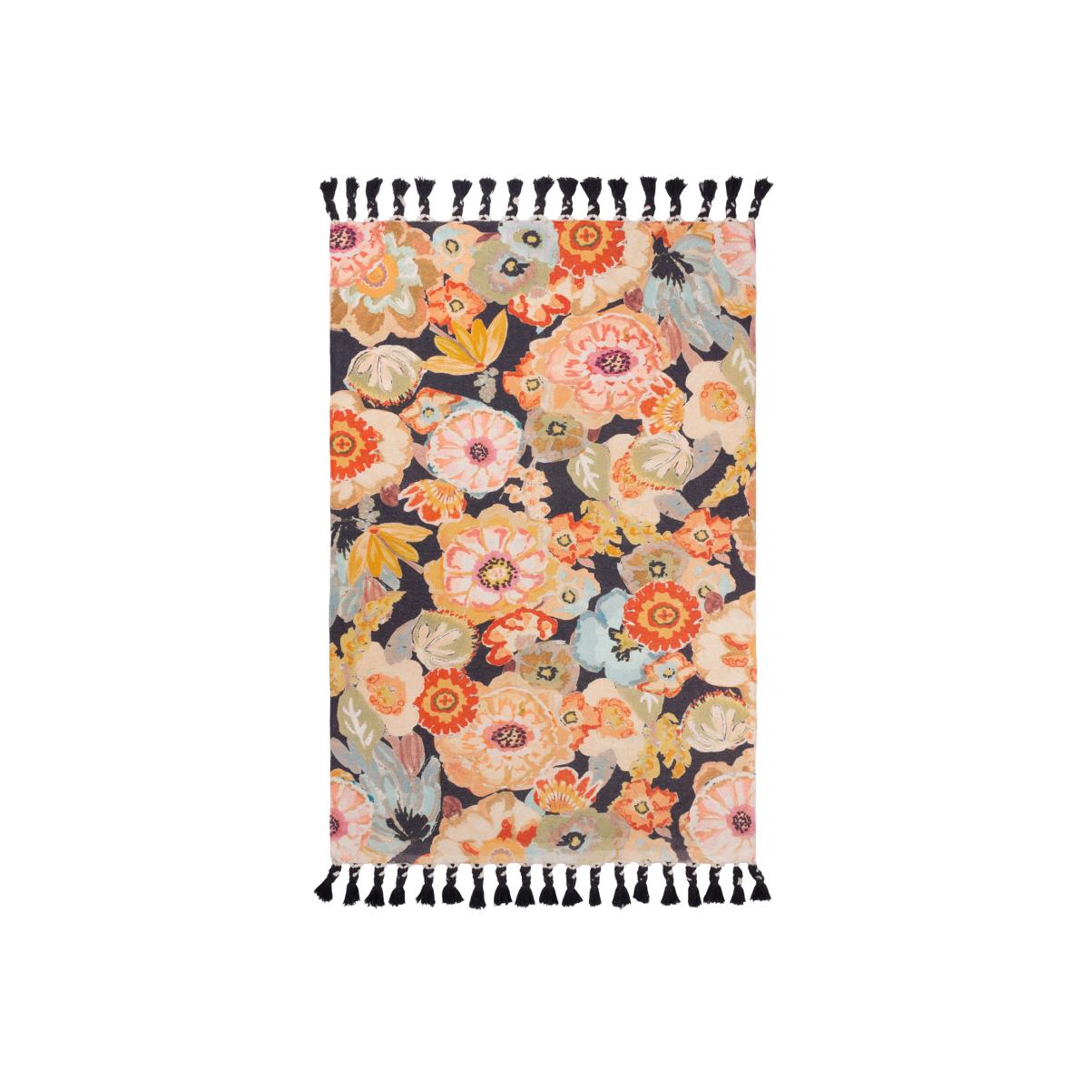 The Florage rug, made of soft woven cotton and immaculately printed, features a deep-toned bed of classic garden florals. This design provides a sophisticated way to depict a flower collage and is finished with a unique dual-sided braided tassel trim, making it ideal for a jewel hunter who enjoys furnishing their homes with unique and beautiful artworks.