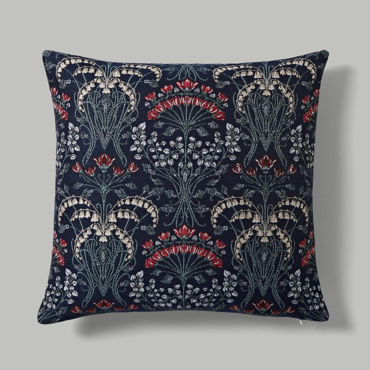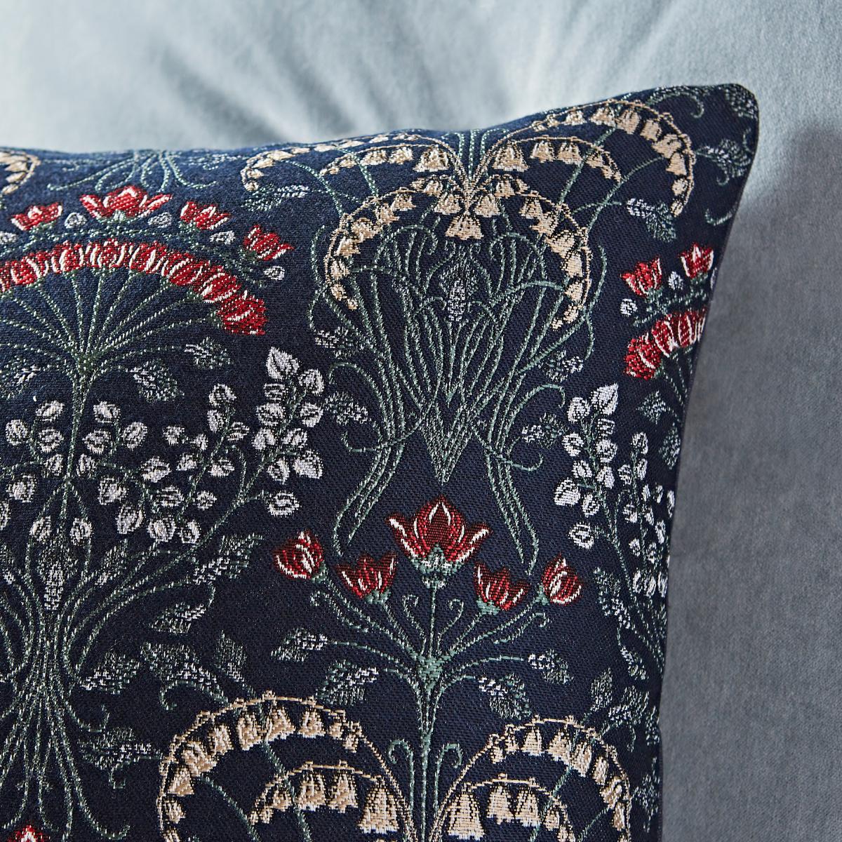 * Tapestry design * Zip closure * Polyester fibre filling This cushion features an intricate damask floral pattern in a rich navy color, which adds depth and a sense of luxury to your decor. The detailed tapestry work showcases the fine craftsmanship, making it not just a cushion but a statement piece.