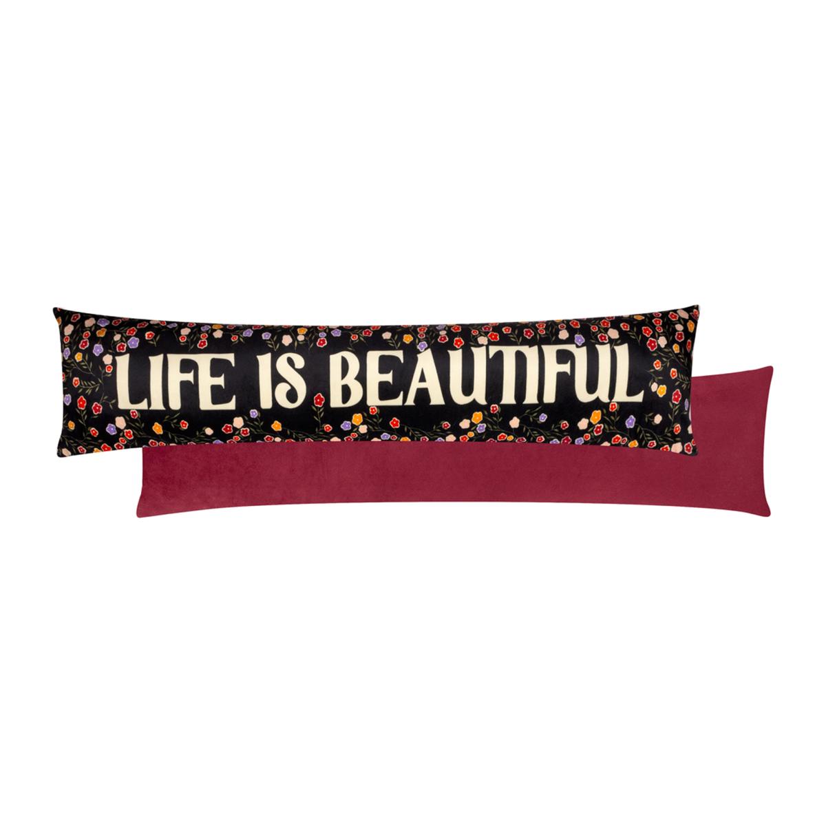 The La Vida draught excluder is a celebration of life and was designed to complement the La Vida duvet cover set. The powerful motto 'Life Is Beautiful' is surrounded by warm blooms and set on a dark velvet base. This pattern, with its contrasting soft, plain velvet back and zip closure, is the ideal addition to your house this season.