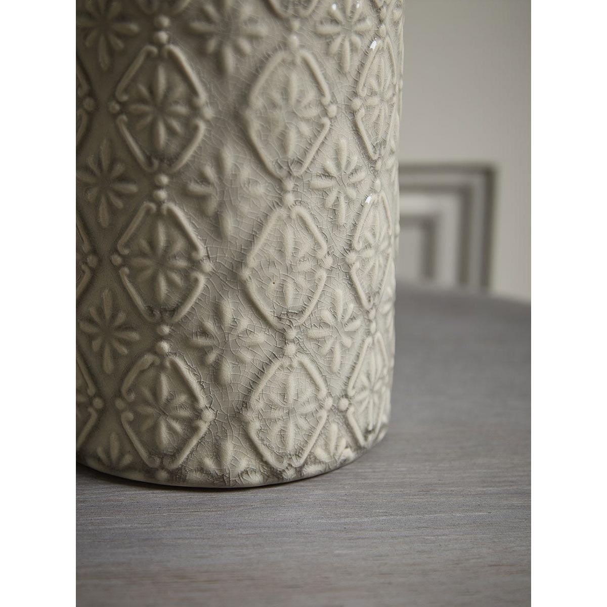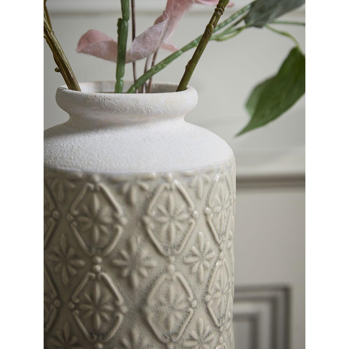A vase in neutral tones is enhanced by an intricate floral pattern with fine lines and dots creating a detailed design. In a simple shape with a wide bottle neck, the top has a stark contrast from the glazed base, with a matte and textured finish creating visual impact in a subtle way.