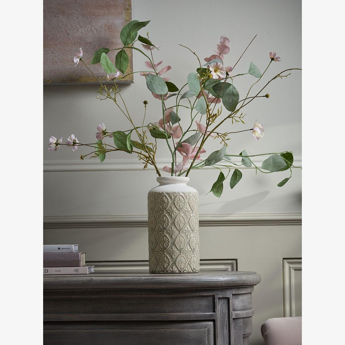I really like the floral glazed vase for its understated charm and versatility. Its glazed finish adds a subtle shine that elevates both contemporary and traditional interiors, making it a great focal point on sideboards, consoles, or even in a minimalist space. I’d suggest pairing it with seasonal stems or simple greenery for a fresh look, but it also works well with dried botanicals for a longer-lasting display. For practical styling, place it at varying heights alongside other decorative objects, or use it as a standalone piece for a clean, sophisticated touch. Its neutral tones make it adaptable across different colour schemes, providing a timeless addition that can be easily integrated into many interiors.