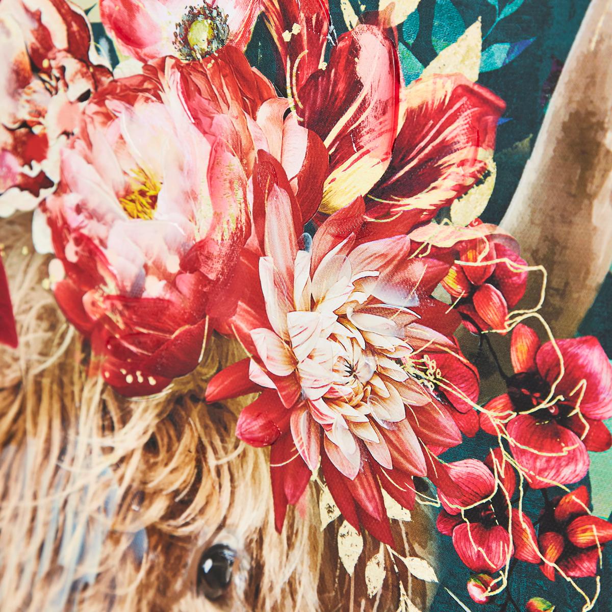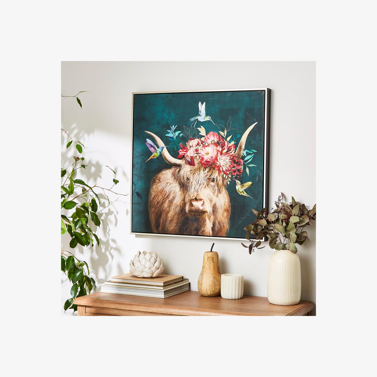 * Playful Highland Cow design * Crown of flowers * Multicoloured * Great for modern decor * Hand painted Add a touch of character to your home with this beautifully hand-painted Highland Cow framed canvas. Featuring a playful design with a delicate crown of flowers, this piece blends rustic charm with a modern artistic twist. The vibrant multicoloured palette brings warmth and personality, making it a striking addition to any space. Framed for a polished finish, it’s perfect for brightening up living rooms, bedrooms, or hallways. A great choice for modern décor.