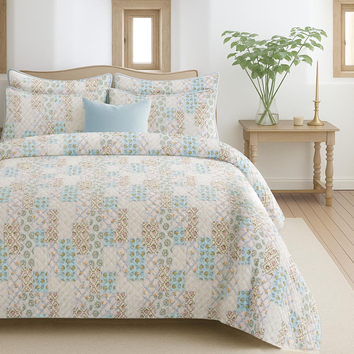 Bring a touch of country charm to your bedroom with this beautifully embossed floral patchwork duvet cover set. Featuring a delicate mix of soft pastel tones and intricate floral motifs, this design creates a warm, inviting look inspired by classic handcrafted quilts. The subtle embossed texture adds depth and a luxurious feel to your bedding, while the plain baby blue reverse offers a calming contrast for a versatile and refreshing look. Perfect for adding a cosy, homely touch to any decor, this easy-care set is soft, durable, and machine washable for everyday comfort.