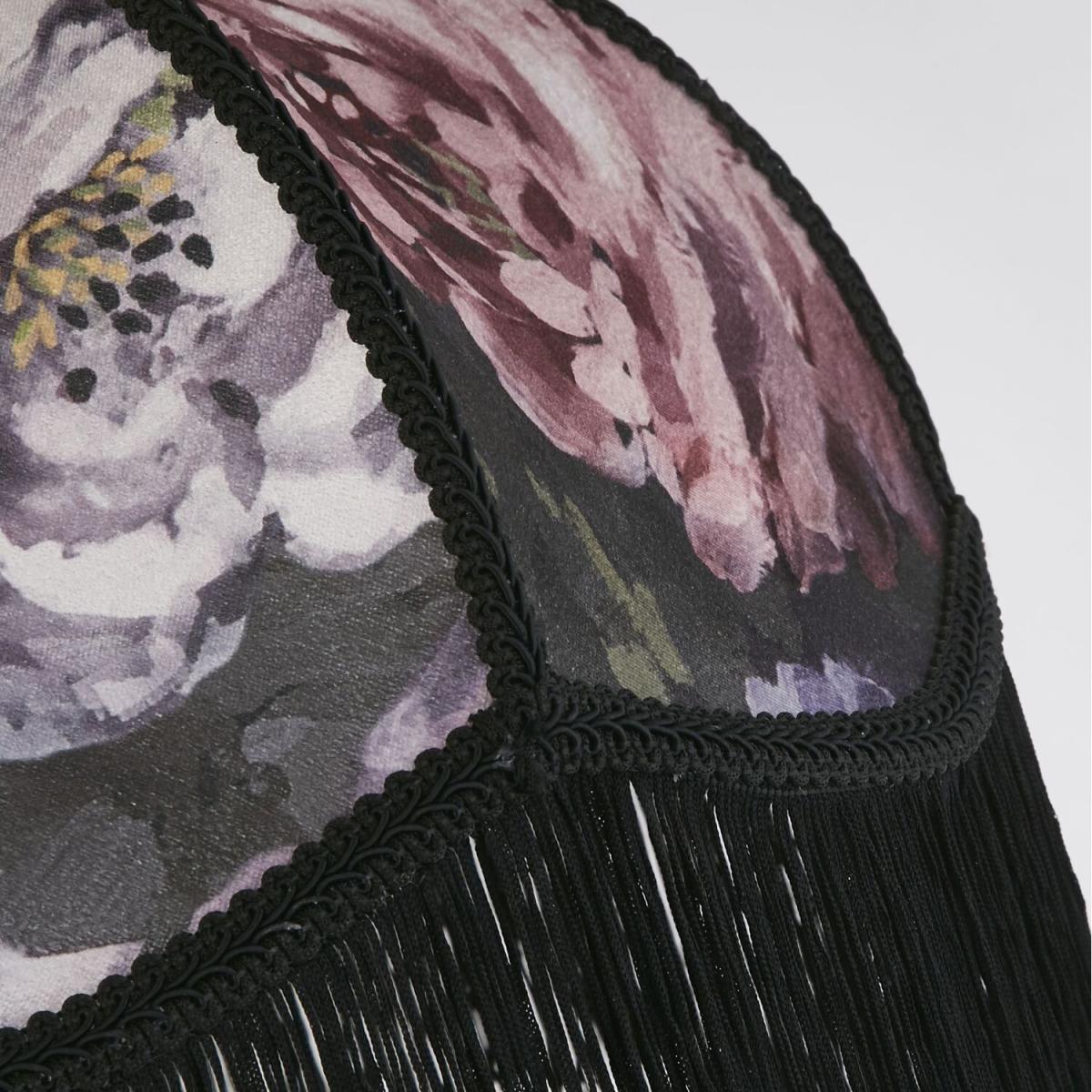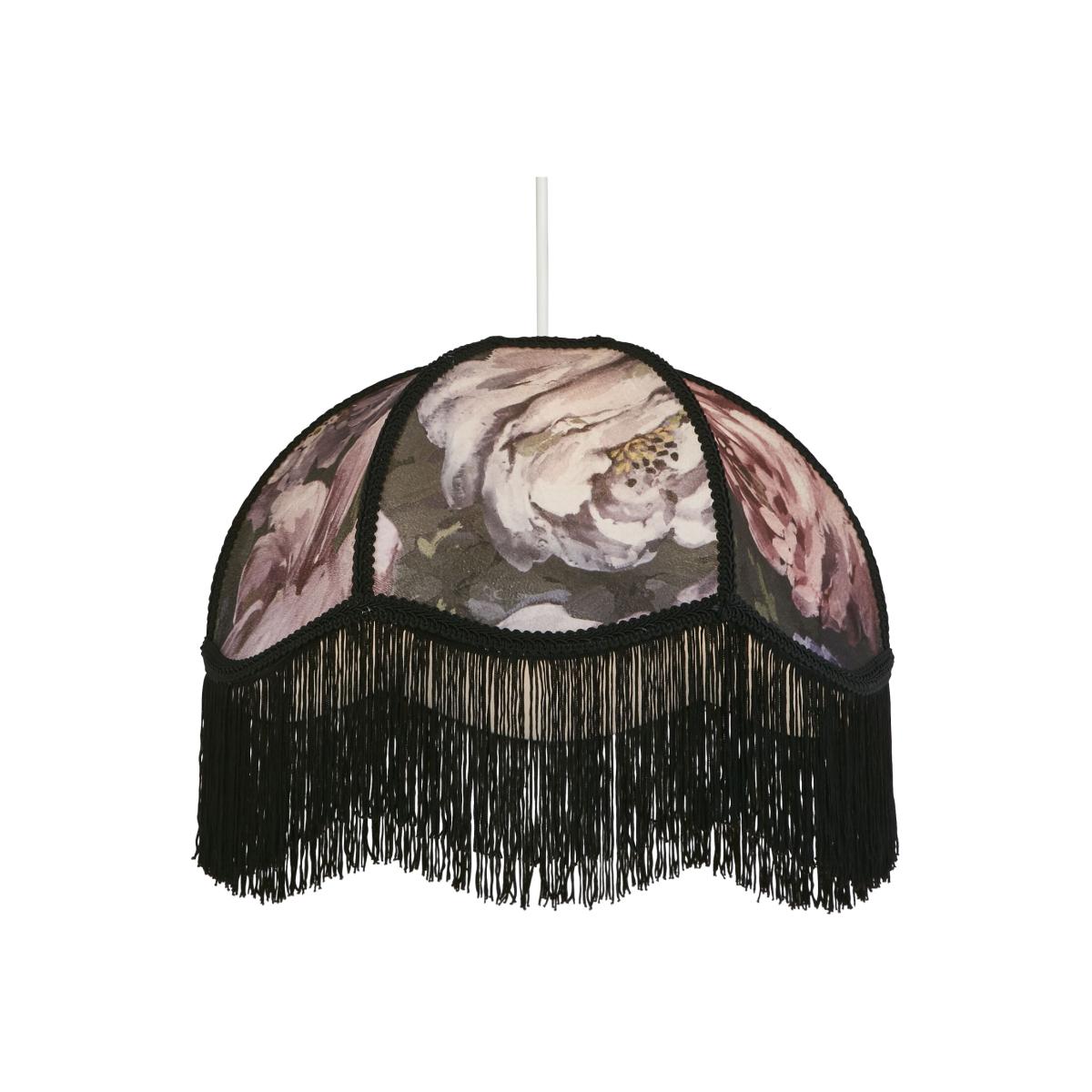 Designed to be used with existing fittings, this shade will add a modern vintage look to any room. The dark floral fabric shade has contrasting black fringing to create a centre piece in any room.