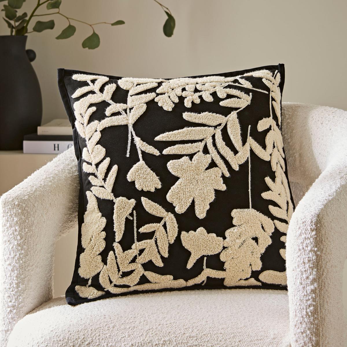 * Embroidered detail* 100% feather filled* Zip to secure filling insert * Machine washable Whether you're styling your bedding or couch, this Floral cushion features a black and white embroidered detailing which is filled with a comforting feather filling. This cushion is machine washable and is finished with a secure zip closure.