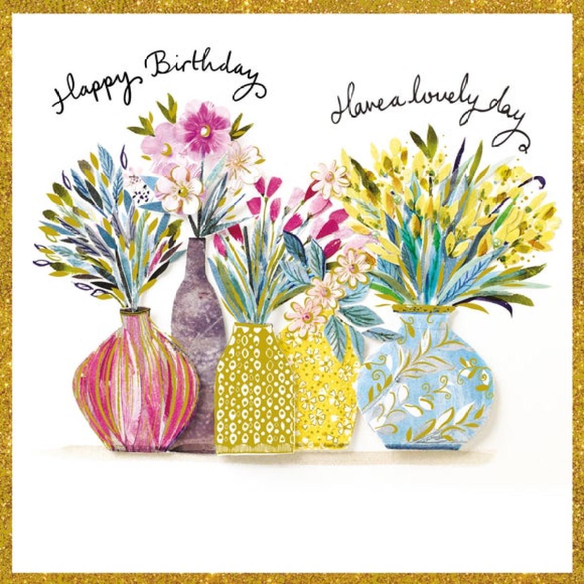 * Features five patterned vases with flowers * Gold glitter border adds a touch of shine * Designed to brighten someone’s special day Bright and cheerful, this card is a lovely way to send birthday wishes. With five colourful vases filled with flowers and foliage, it’s full of thoughtful detail. The handwritten-style messages add a warm touch, while the gold glitter border brings a bit of sparkle. A great pick for anyone who enjoys florals and a pop of colour.