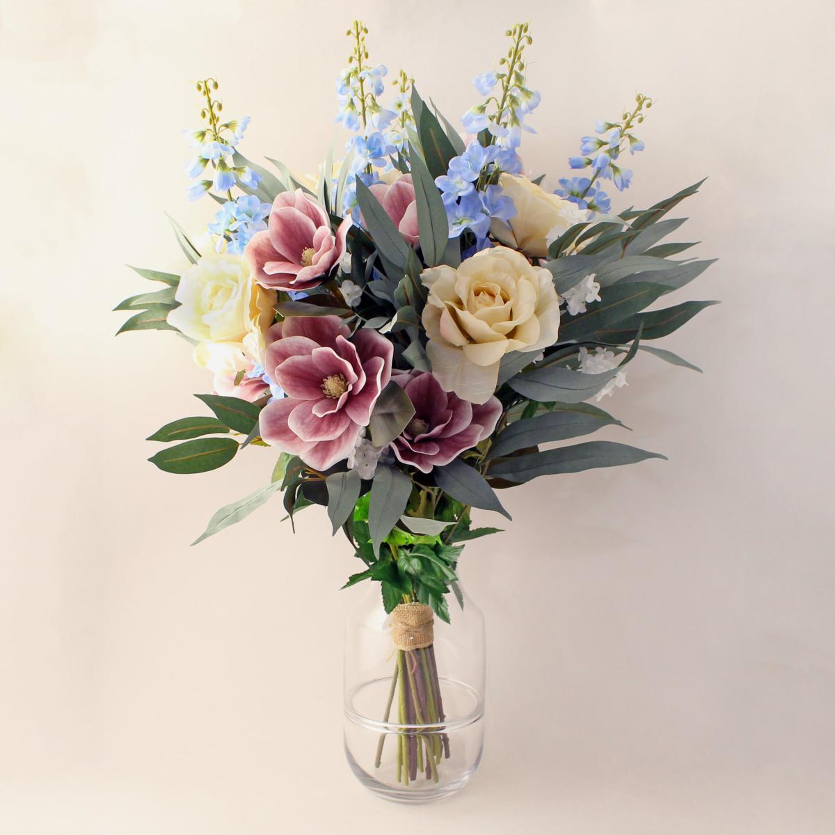 A spectacular arrangement of a seasonal spring bouquet featuring roses, delphiniums, and magnolias. This would be a great gifting idea as this bouquet has been hand-tied by florists in the UK, is presented with recyclable kraft paper wrap and delivered in a specialised bouquet box ensuring this lovely item safe and secure. Vase not included.