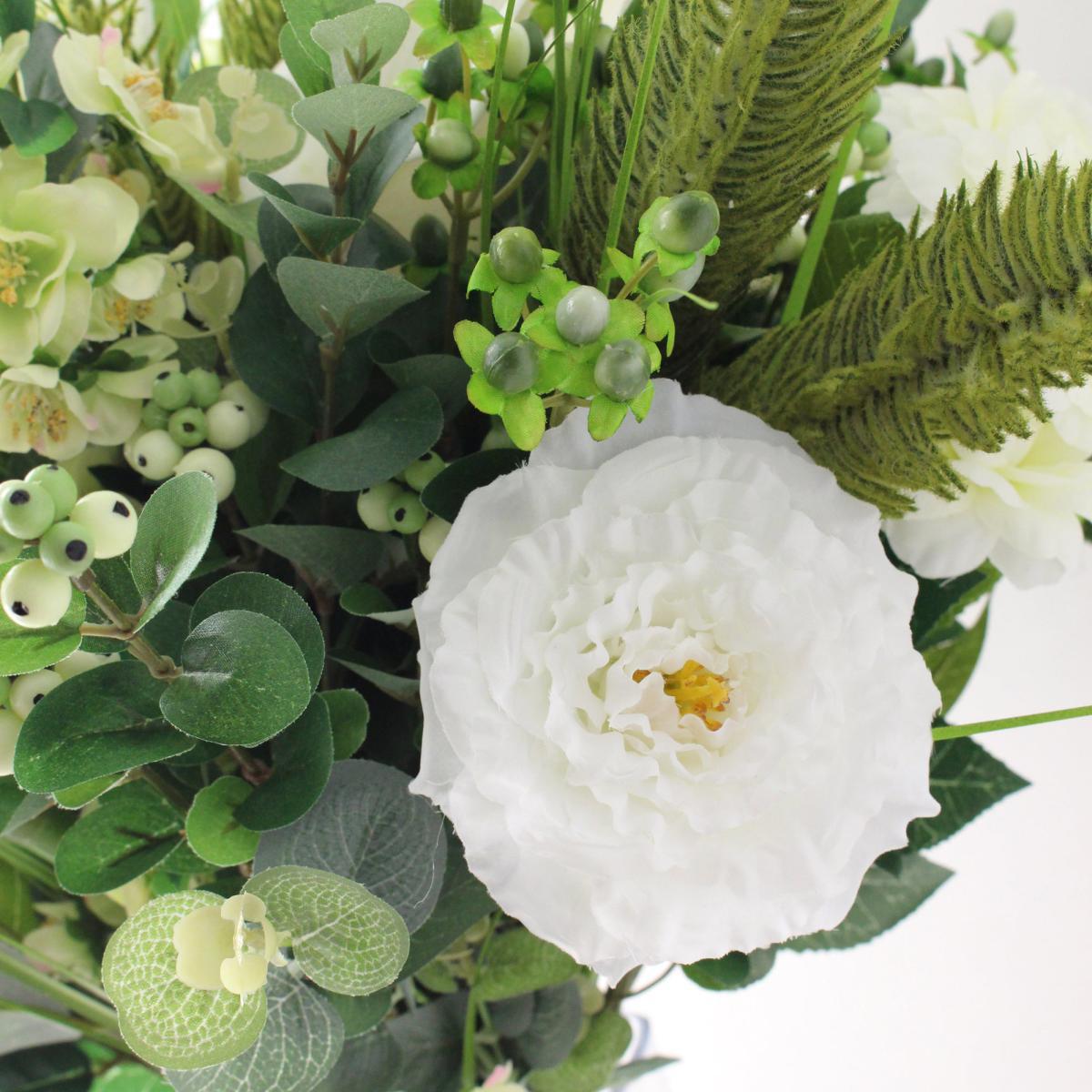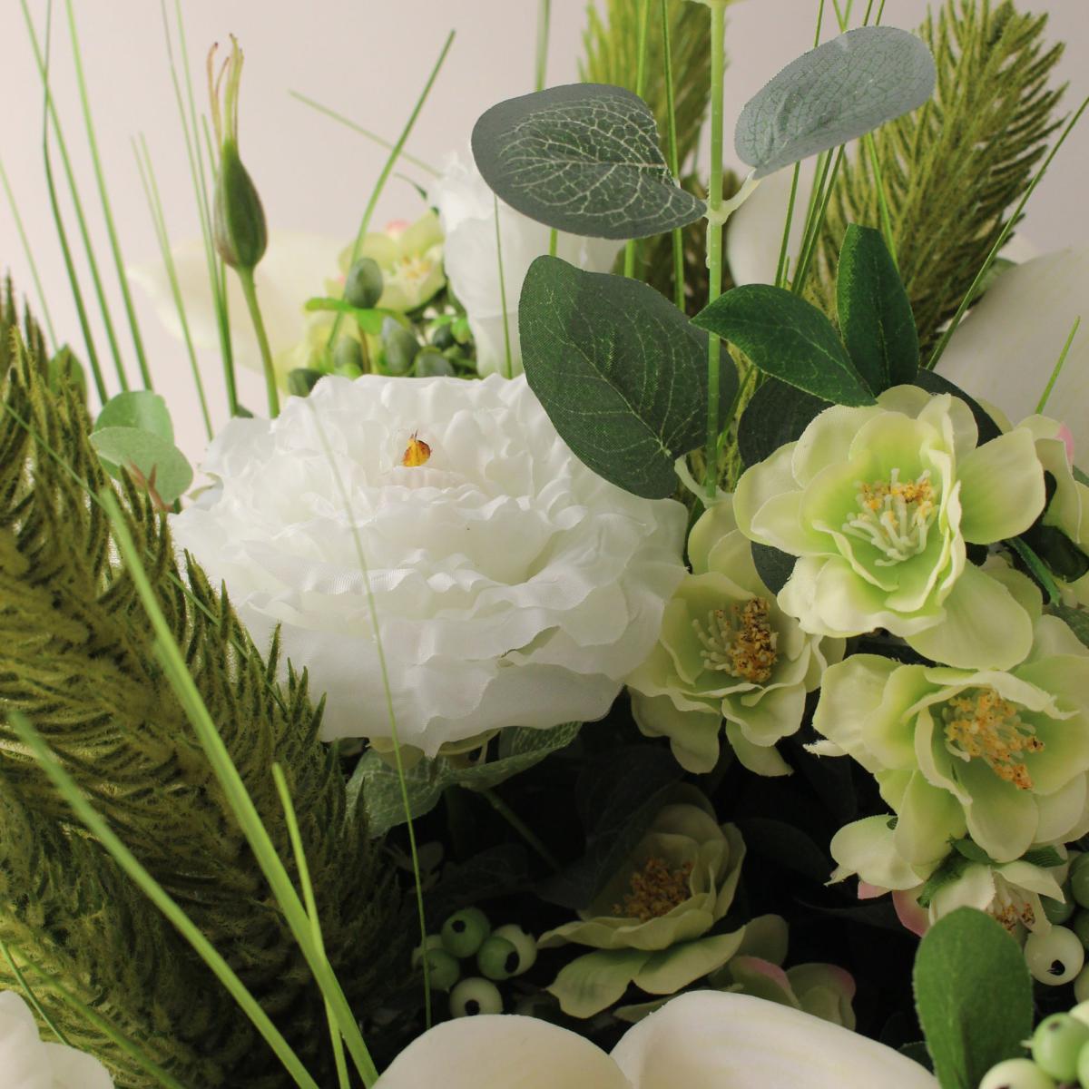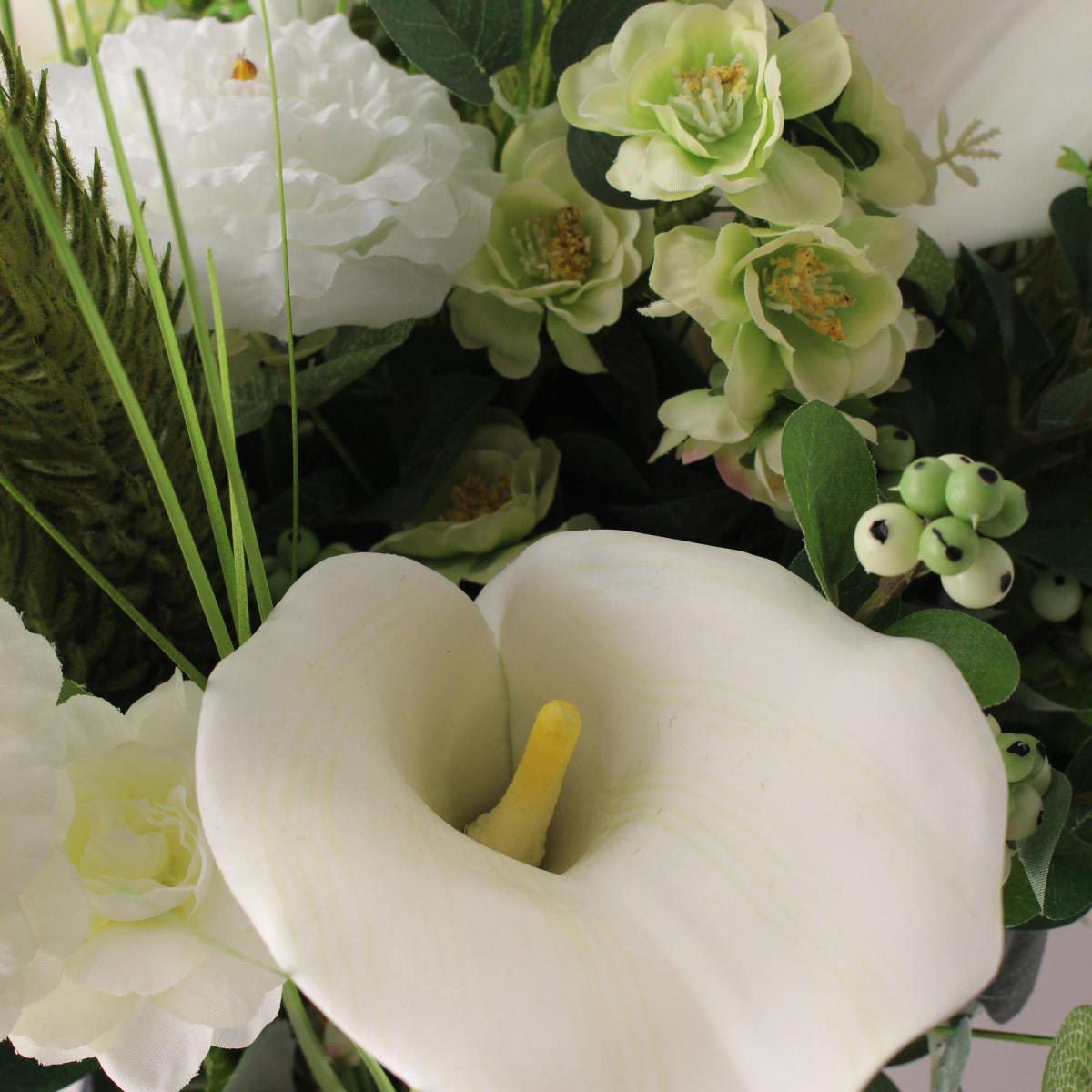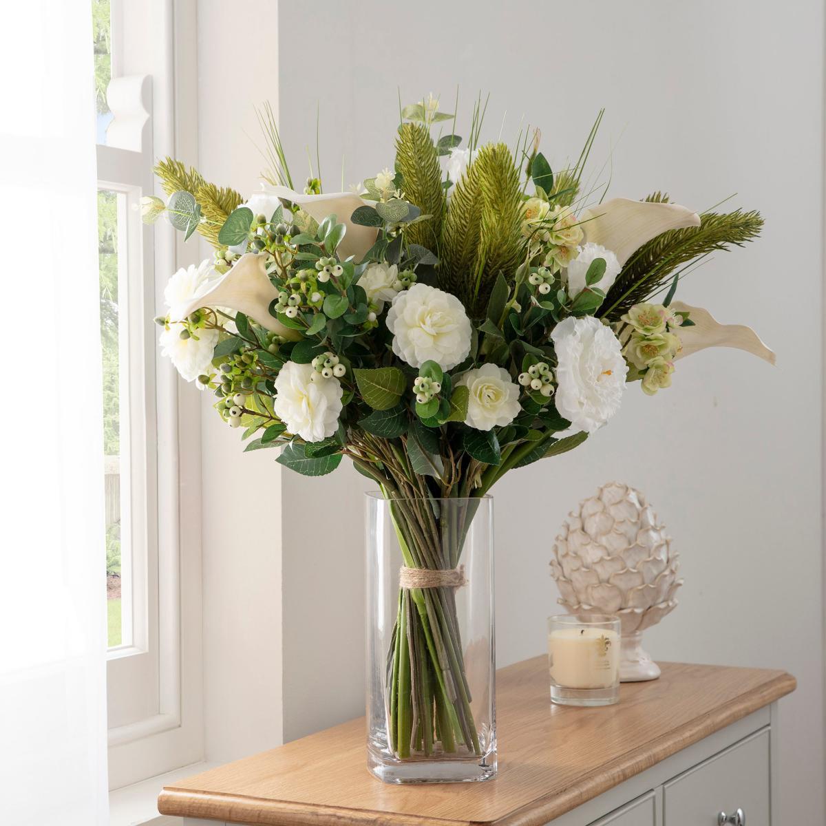I love this bouquet for its clean, elegant look that works beautifully in contemporary or minimalist interiors. The white Calla lilies and subtle green accents bring a fresh, sophisticated vibe without overwhelming the space. It’s ideal for dressing up sideboards, coffee tables, or dining tables where low-maintenance greenery is appreciated. For styling, try pairing it with neutral tones and sleek accessories to enhance its modern appeal, or place it amidst soft textures like linen throws or plush cushions for a relaxed yet refined aesthetic. The 63cm height makes it versatile-standing out on a low surface or filling a tall vase in a corner. Practical tip: because it’s artificial, it’s perfect for spaces with limited natural light, or where real flowers might not last.
