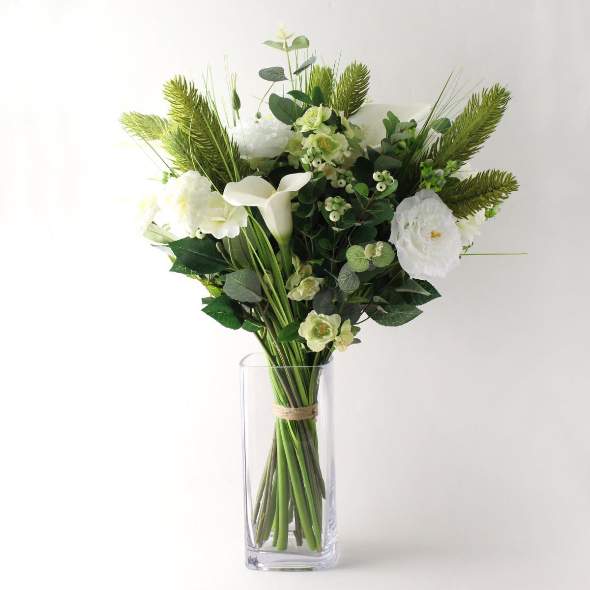 Our elegant realistic bouqets consit of Calla Lily, Eustoma, Snowberry, Eucalyptus, Blossom, Camelia, Hypericum and Grass flowers. These would be perfect to display in your home or as a gift. Please note: Vase not included.
