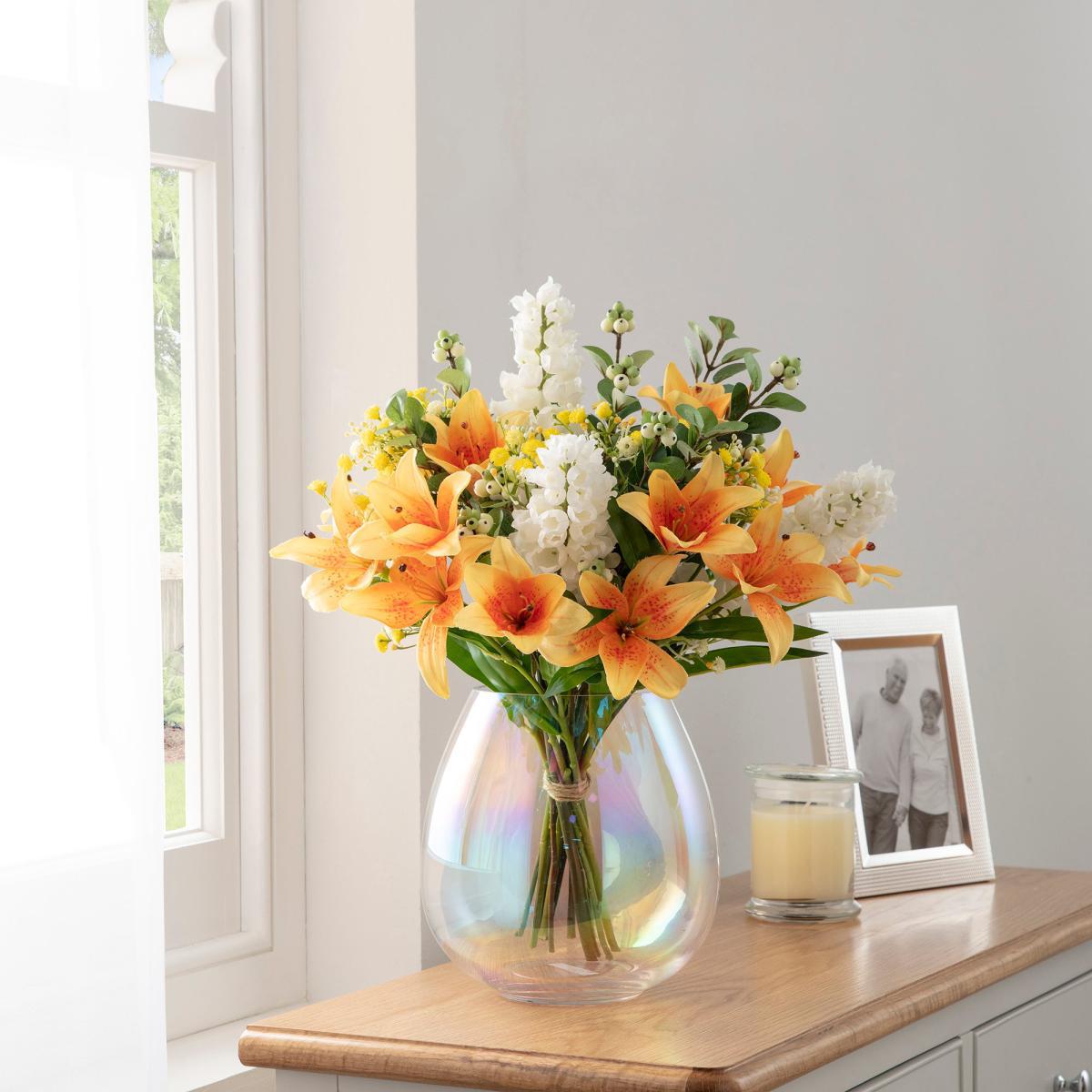 I love how this flower arrangement brings a bright, sunny touch to any space. The vibrant yellow tones of the tiger lilies make it perfect for adding energy to a neutral living room or a welcoming hallway. Its 63cm height allows it to command presence on a console table or sideboard without overwhelming the space. Practical styling tips include pairing it with minimalist decor for contrast or grouping it with other colourful blooms for a lively, floral display. Because it’s artificial, it’s maintenance-free and ideal for spaces with limited natural light or areas where real flowers might not thrive long-term. Overall, a versatile piece that adds colour and sophistication to both modern and traditional interiors.