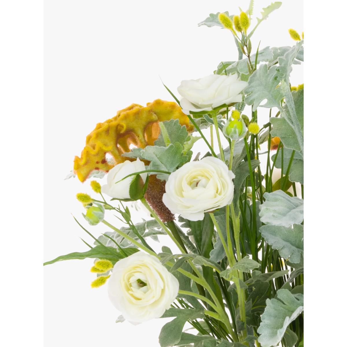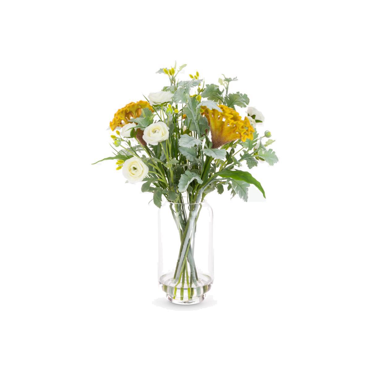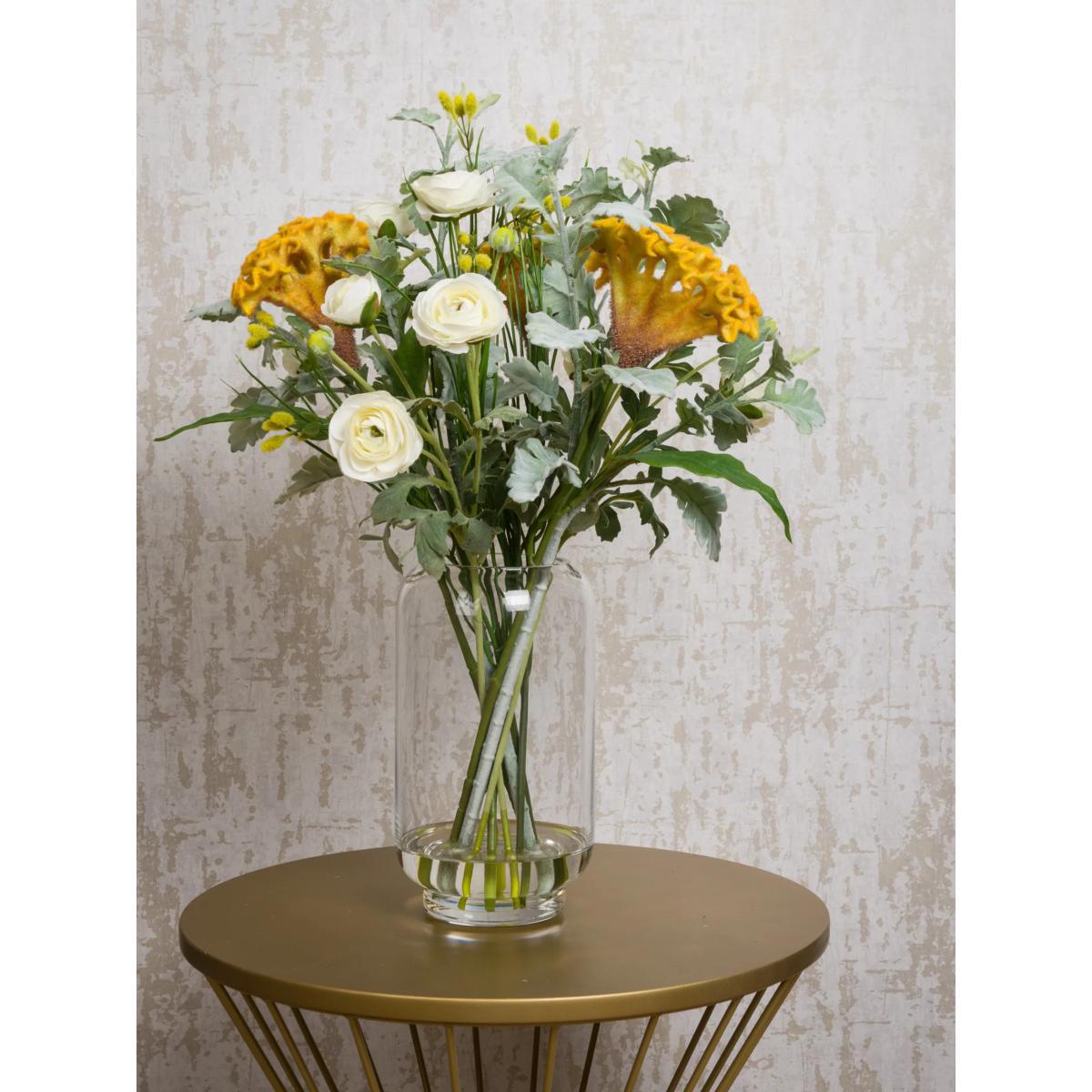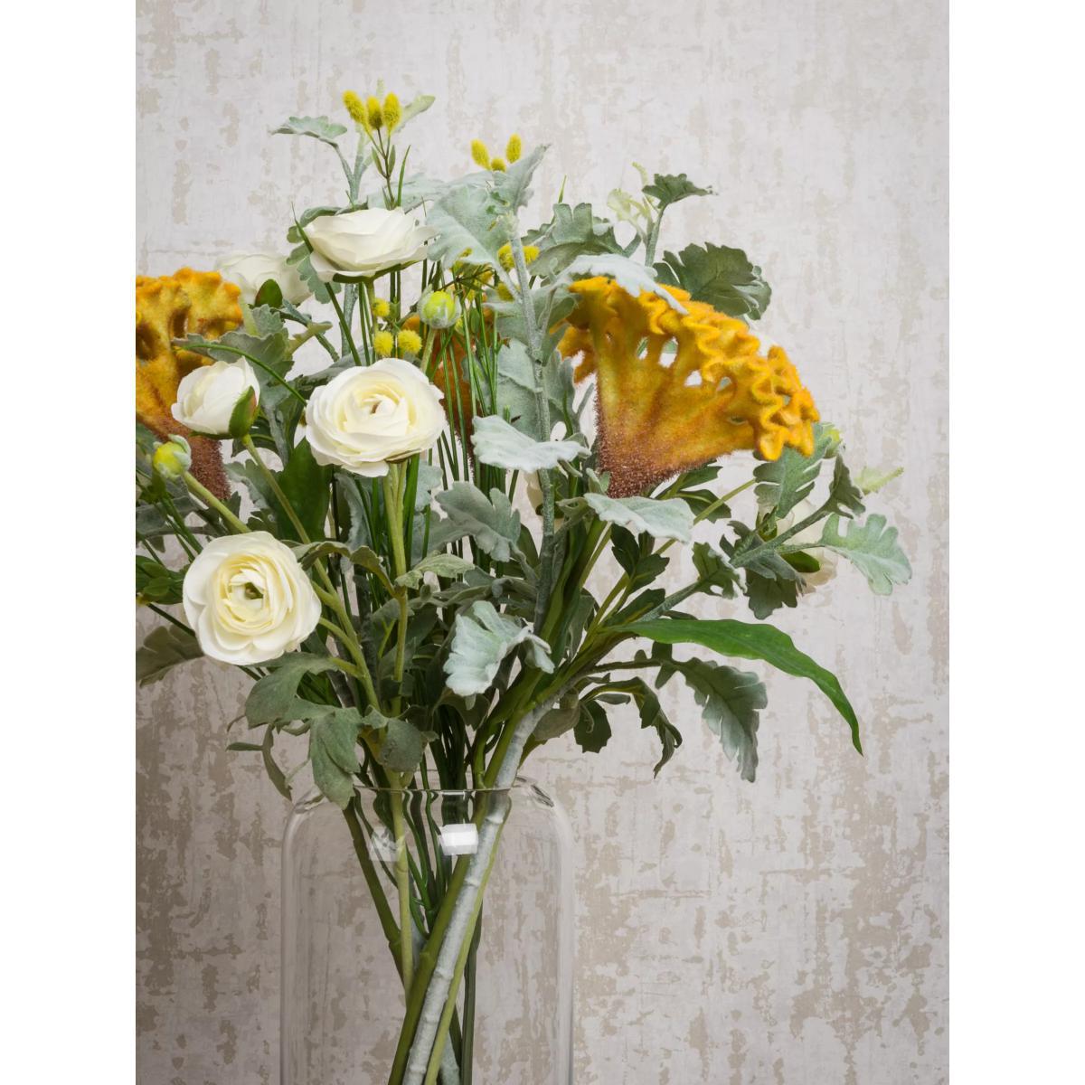 This realistic arrangement features ranunculus stems and the eye-catching celosia bloom. The flocked stems lend a velvety softness to its appearance, making a special feature for your home. This arrangement will look stunning on any surface. The stems are set in clear resin for a ready-made arrangement.