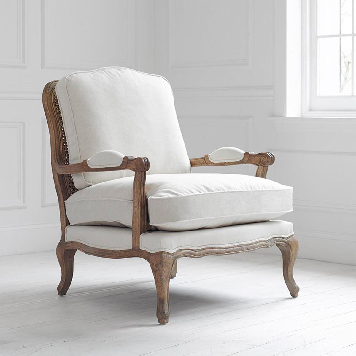 I’m a fan of this country armchair for its mix of classic carving and a light, neutral cushion that slots easily into both traditional and more pared-back schemes. The gold-washed finish on the timber frame adds just a touch of warmth without feeling overly ornate, so it works equally well in a modern farmhouse living room or a soft Scandinavian bedroom corner. For styling, layer a linen or wool throw in muted tones over one arm to introduce texture, and position the chair beside a simple side table topped with a ceramic lamp or a stack of design books. If you’re looking to ground it, place a natural-fibre rug underneath and pick up the gold frame in small accents - think brass candlesticks or a mirror frame - to create a cohesive look.