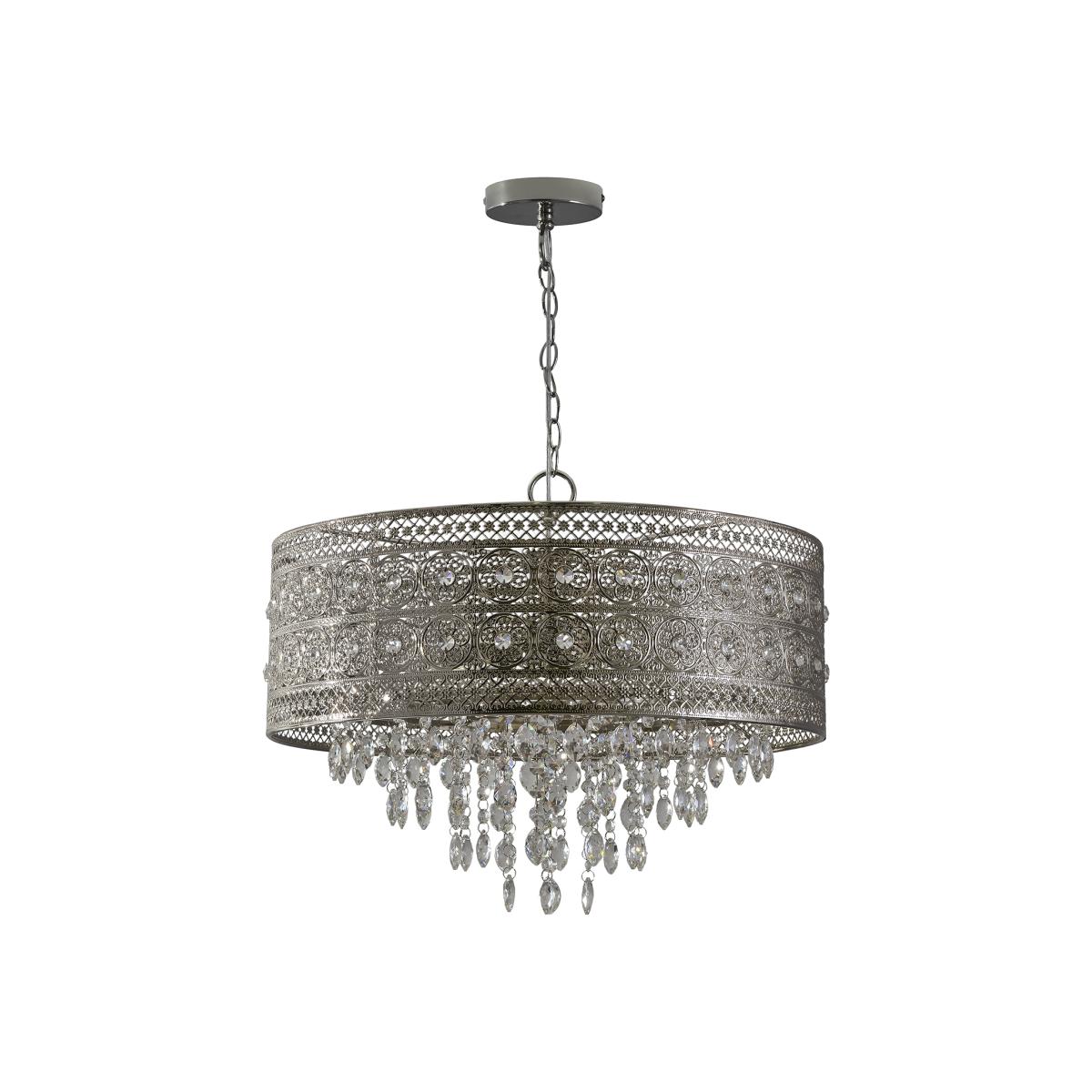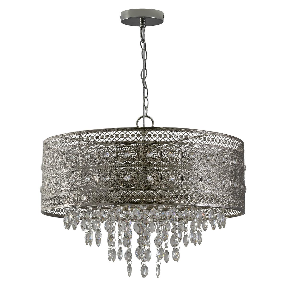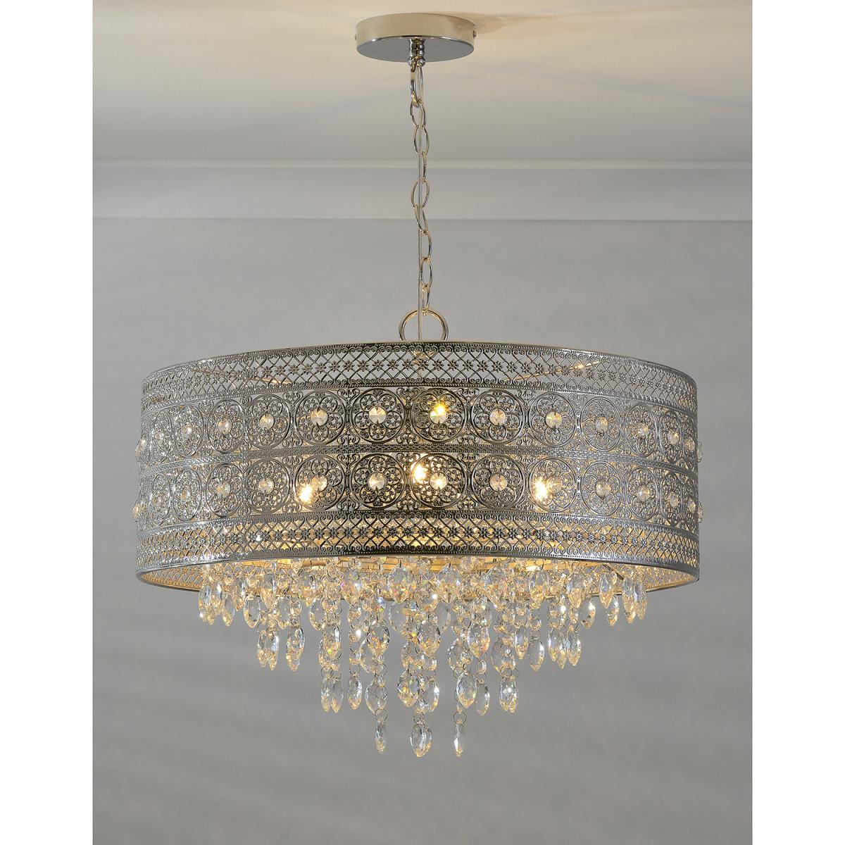 A stunning fusion of vintage and modern design, the Florence Crystal 3 Light Flush Fitting features a chrome shade with an intricate and exotic cut-out pattern. Clear crystals adorn the shade and cascade down within, glistening as the light of its bulbs shines through them to create a stunning focal point.