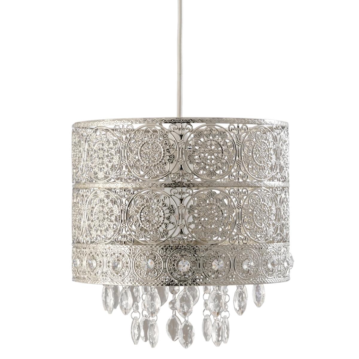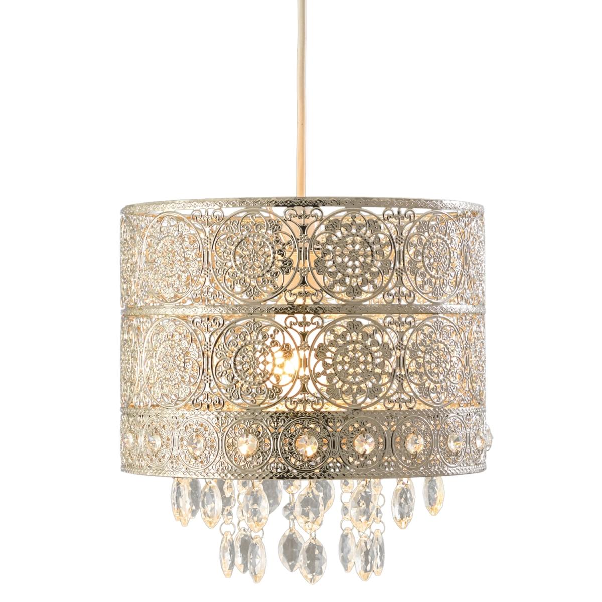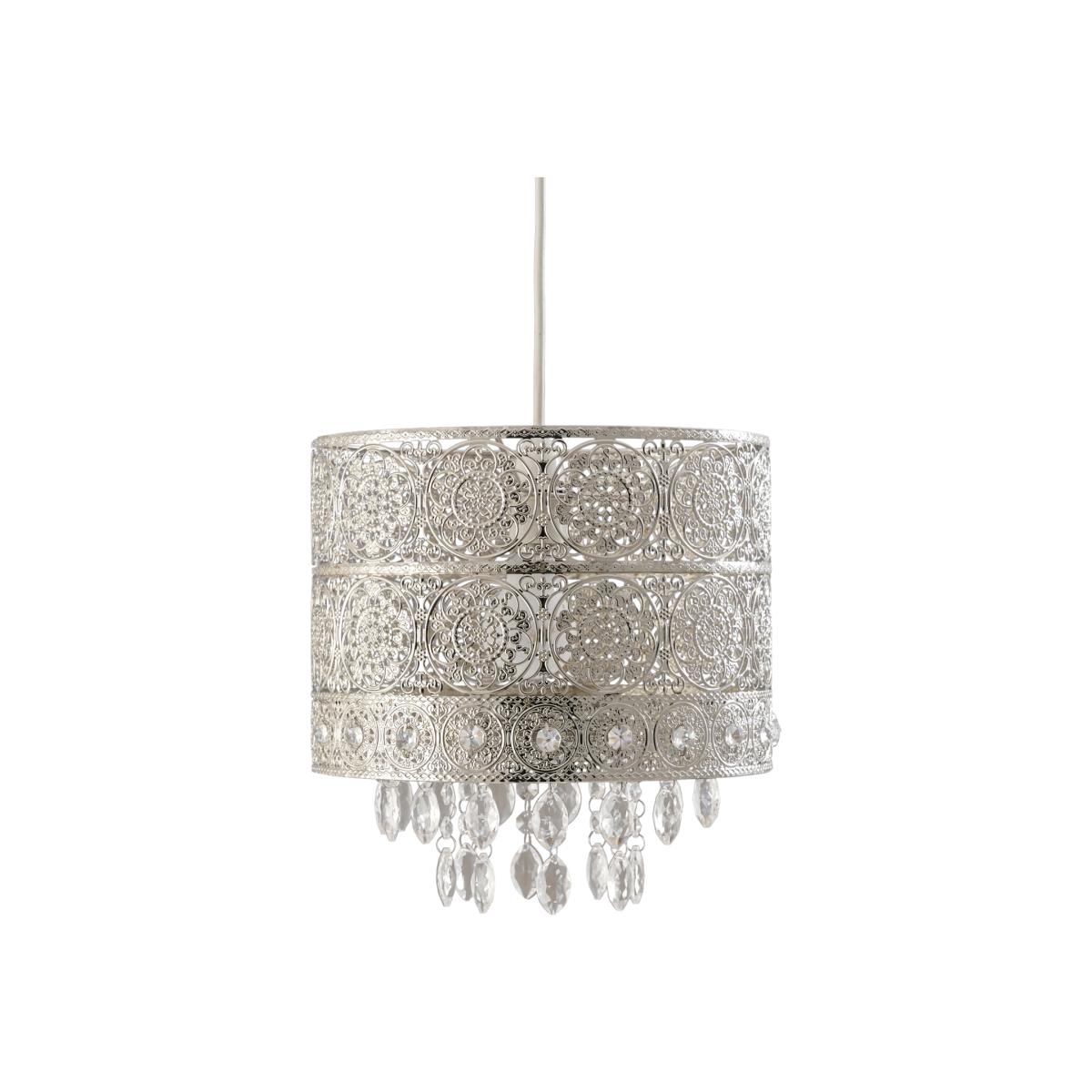 Give your home some Eastern finesse with the Florence Crystal Pendant lampshade, boasting a gorgeous repeating design in a reflective nickel finish. Complete with crystal adornments that delicately hang below the shade, this pendant will cast a beautiful pattern on your walls and ceiling.