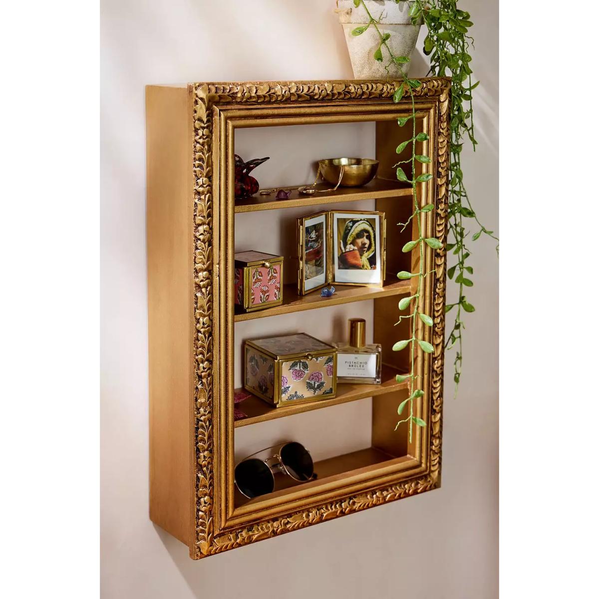 Charming antique-inspired wall shelf. This mango wood shelf features intricate trim detailing with four tiers to display your figurines, trinkets and other collectables. **Content + Care** \- 80% Mango wood, 20% MDF \- Wipe clean **Size** \- Dimensions: L: 33.7cm x W: 11.4cm x H:50.2cm \- Dimensions between shelves: L: 30.5cm x W: 10.2cm x H: 10.8cm \- Shipping package dimensions: L:33.7cm x W: 11.4cm x H: 50.2cm