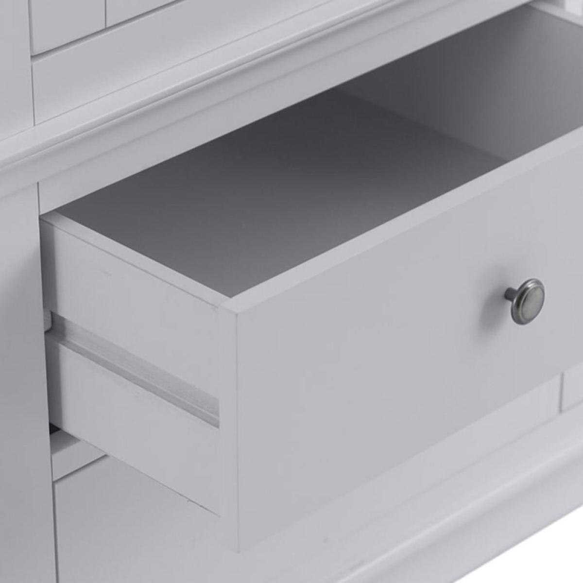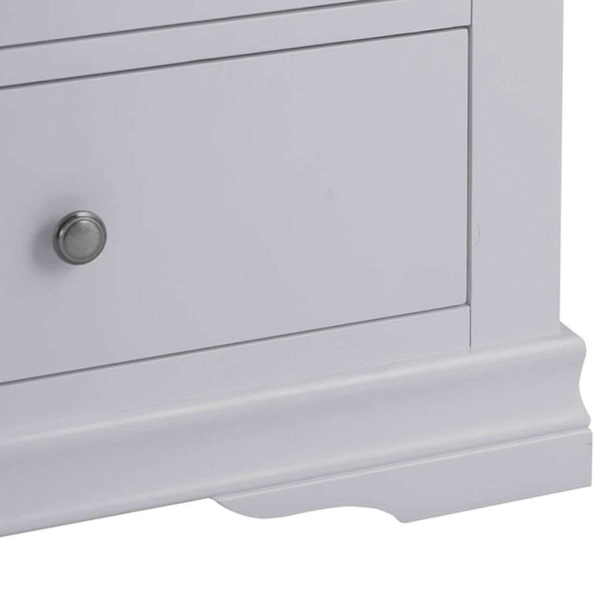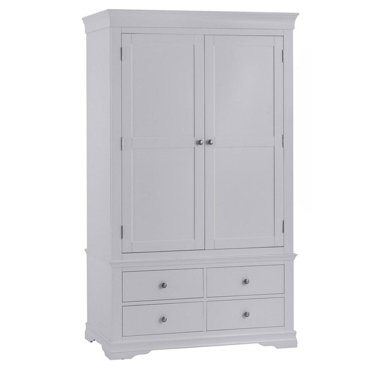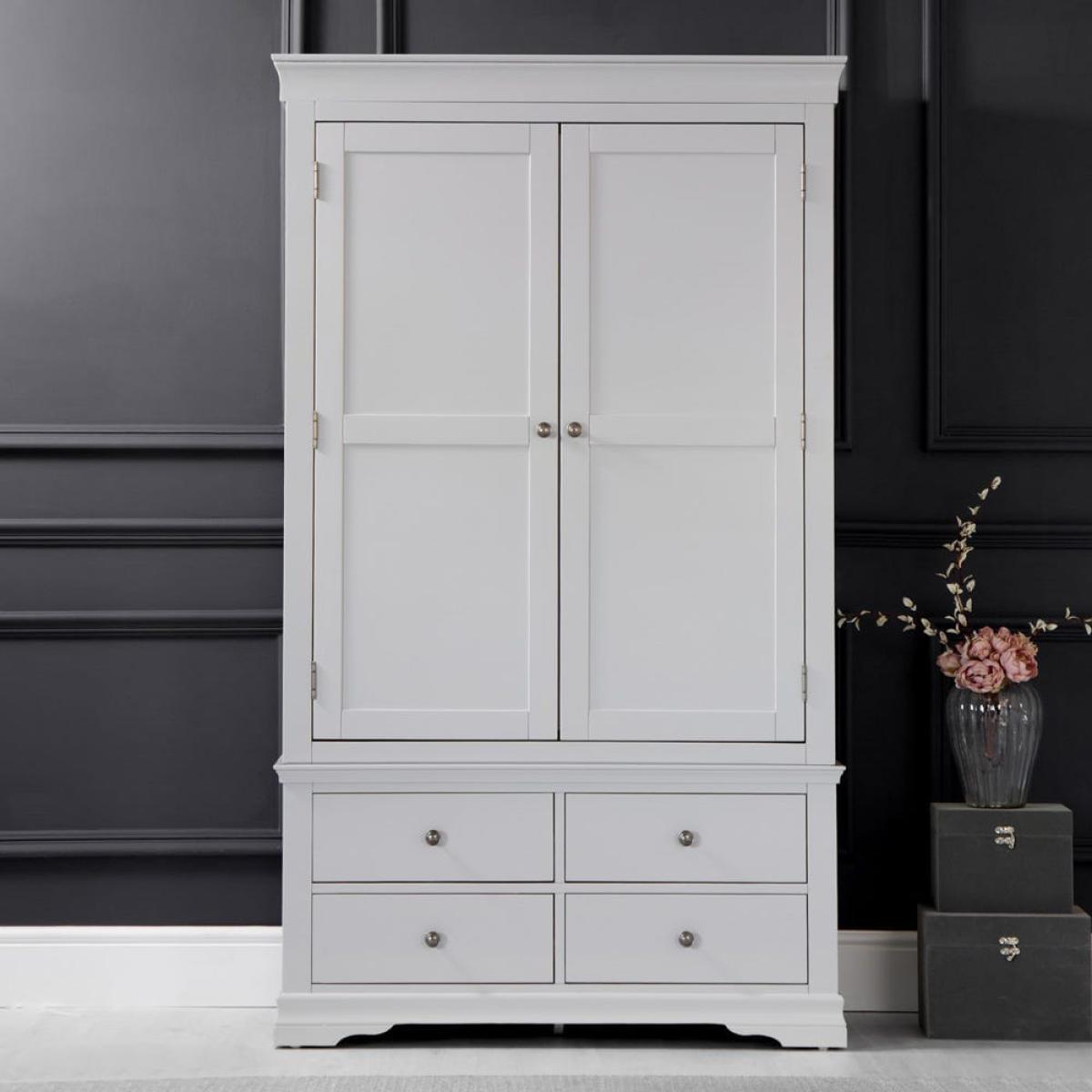 Whatever the occasion, the Florence grey painted two door wardrobe with drawers is a home for all outfits. At 200cm high, this tall wardrobe makes a majestic yet calming statement in your bedroom, with its soft grey finish. The stylish bracket feet are typical of Georgian and Edwardian furniture, but this wardrobe is brought into the 21st-century with contemporary touches like the round pewter handles of the drawers and doors. The roomy wardrobe space is large enough for hanging longer items from the rail like suits and dresses. Fill the four deep drawers with shoes and accessories.