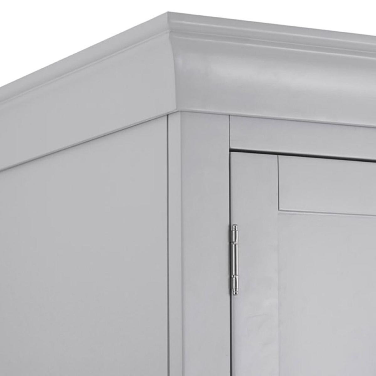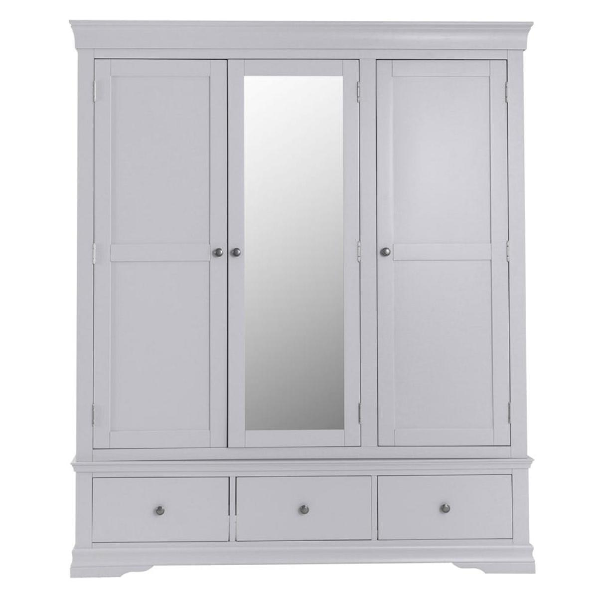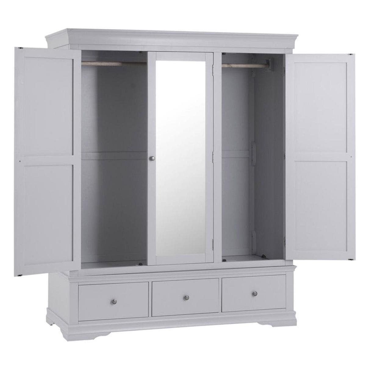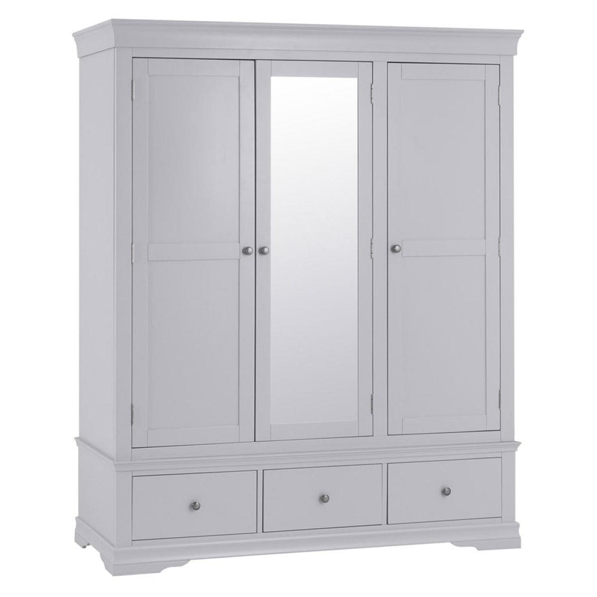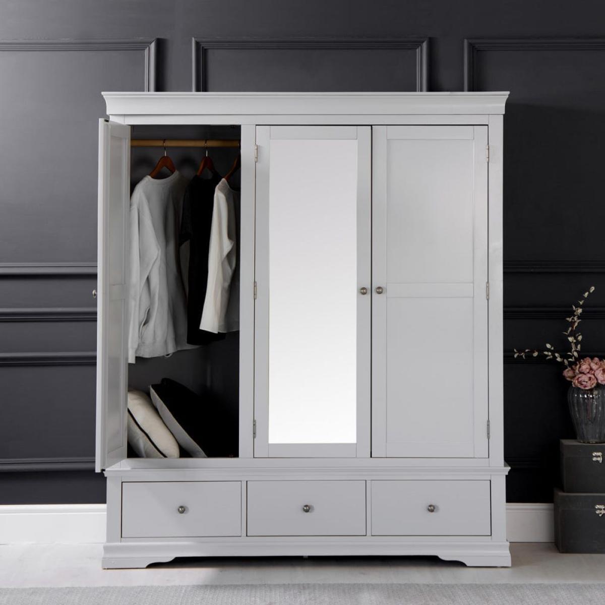 Dare to go the extra mile on clothes storage space with the Florence grey painted three door wardrobe with mirror. Standing on period-style bracket feet, this 170cm-wide wardrobe is an impressive bedroom centrepiece. You’ll find plenty of hanging space behind its triple doors for all your glad rags – and a convenient mirror on the central door so you can check you’re looking the part once you’ve put them on. The neutral grey paint is brilliantly complemented by bold features such as the pewter handles and cornice detailing along the top. This is a wardrobe built to suit both contemporary and classic interiors.