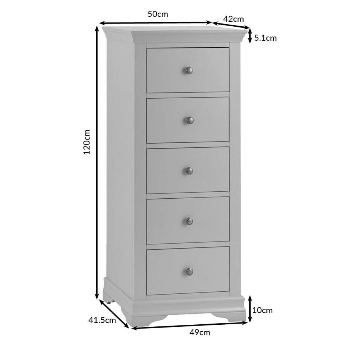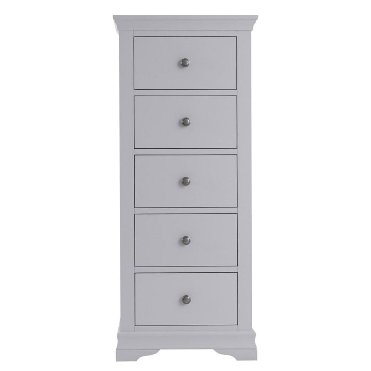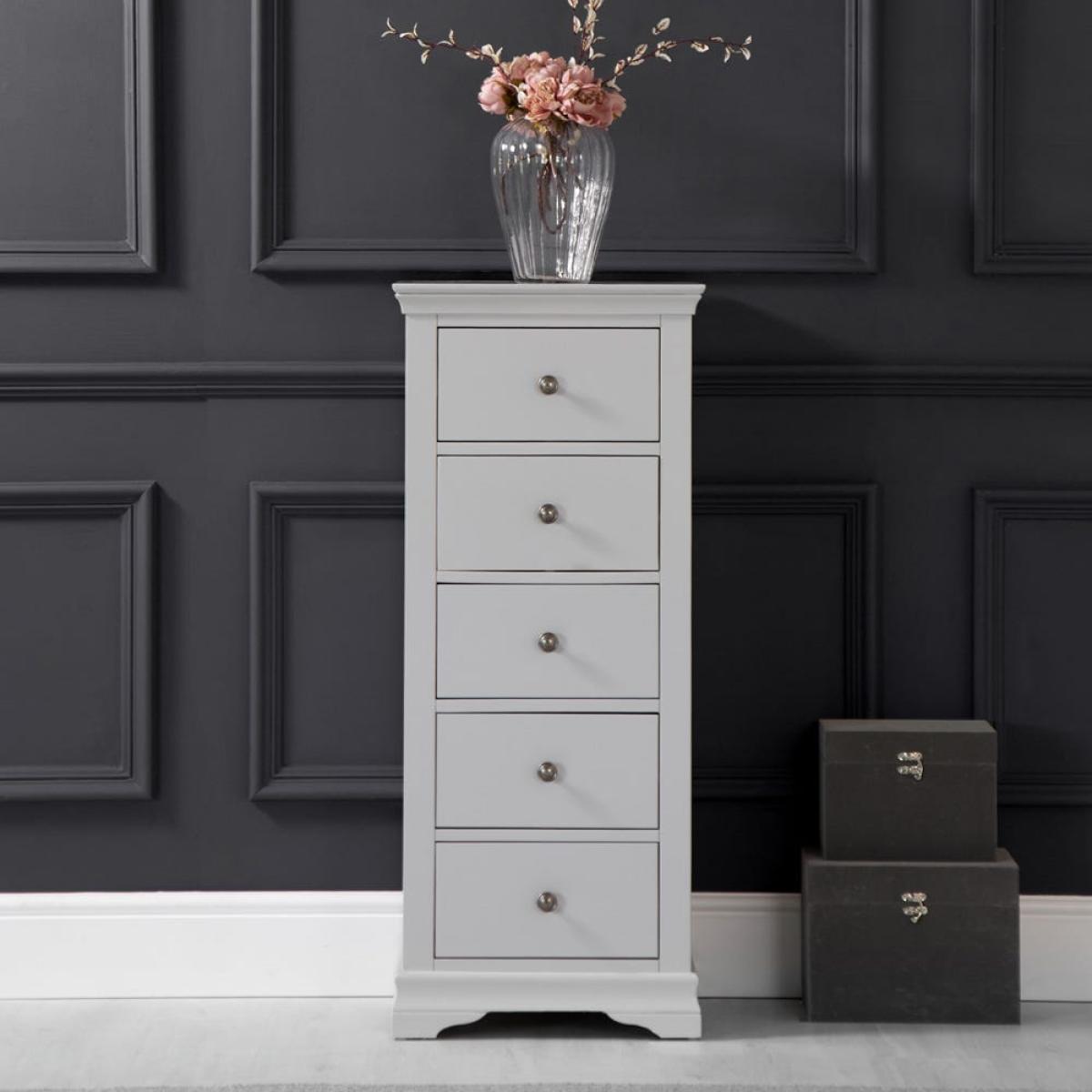 Narrow and elegant, the Florence grey painted five drawer tallboy is a practical addition to your bedroom furnishings. With its minimalist pewter handles and subtle cornice edging, this tallboy has an unfussy look that will enhance your sleeping space with calming grey tones. The 50cm-wide top surface makes a handy perch for a framed photograph, and maybe a sweetly scented diffuser to create the perfect sleeping ambiance. It arrives fully assembled, so all you have to do is decide where it looks best before filling the five drawers with your clothes and accessories.