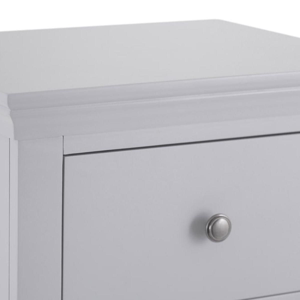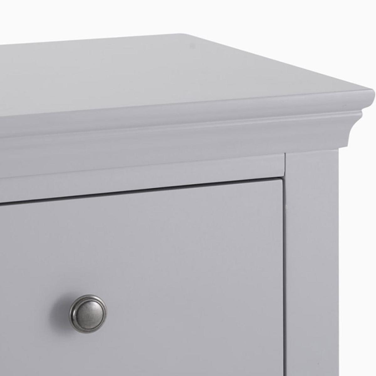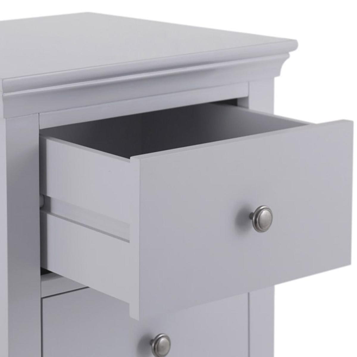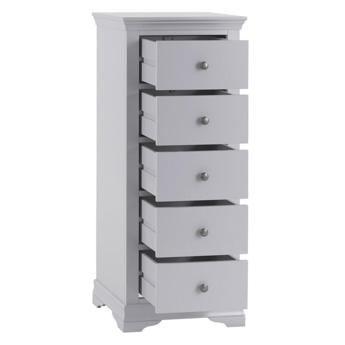 Narrow and elegant, the Florence grey painted five drawer tallboy is a practical addition to your bedroom furnishings. With its minimalist pewter handles and subtle cornice edging, this tallboy has an unfussy look that will enhance your sleeping space with calming grey tones. The 50cm-wide top surface makes a handy perch for a framed photograph, and maybe a sweetly scented diffuser to create the perfect sleeping ambiance. It arrives fully assembled, so all you have to do is decide where it looks best before filling the five drawers with your clothes and accessories.
