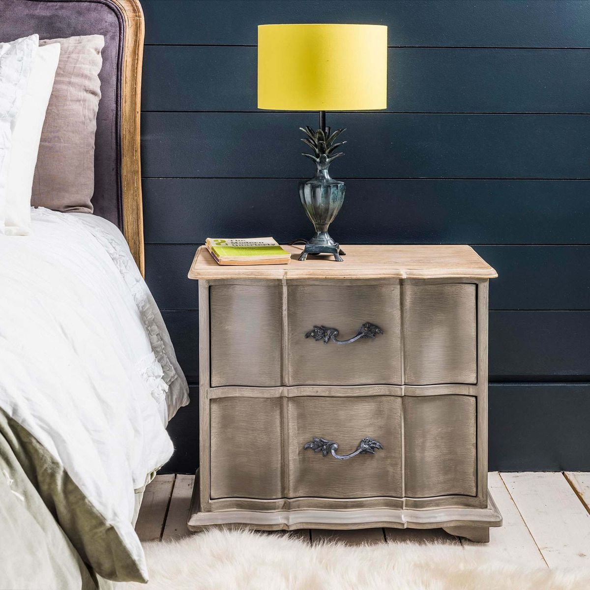 The perfect pair to our bestselling Florence chest of drawers, this carved mango bedside is stained with a soft grey wash for a touch of French style. Each of the two drawers is finished with an ornate handle as an added flourish.