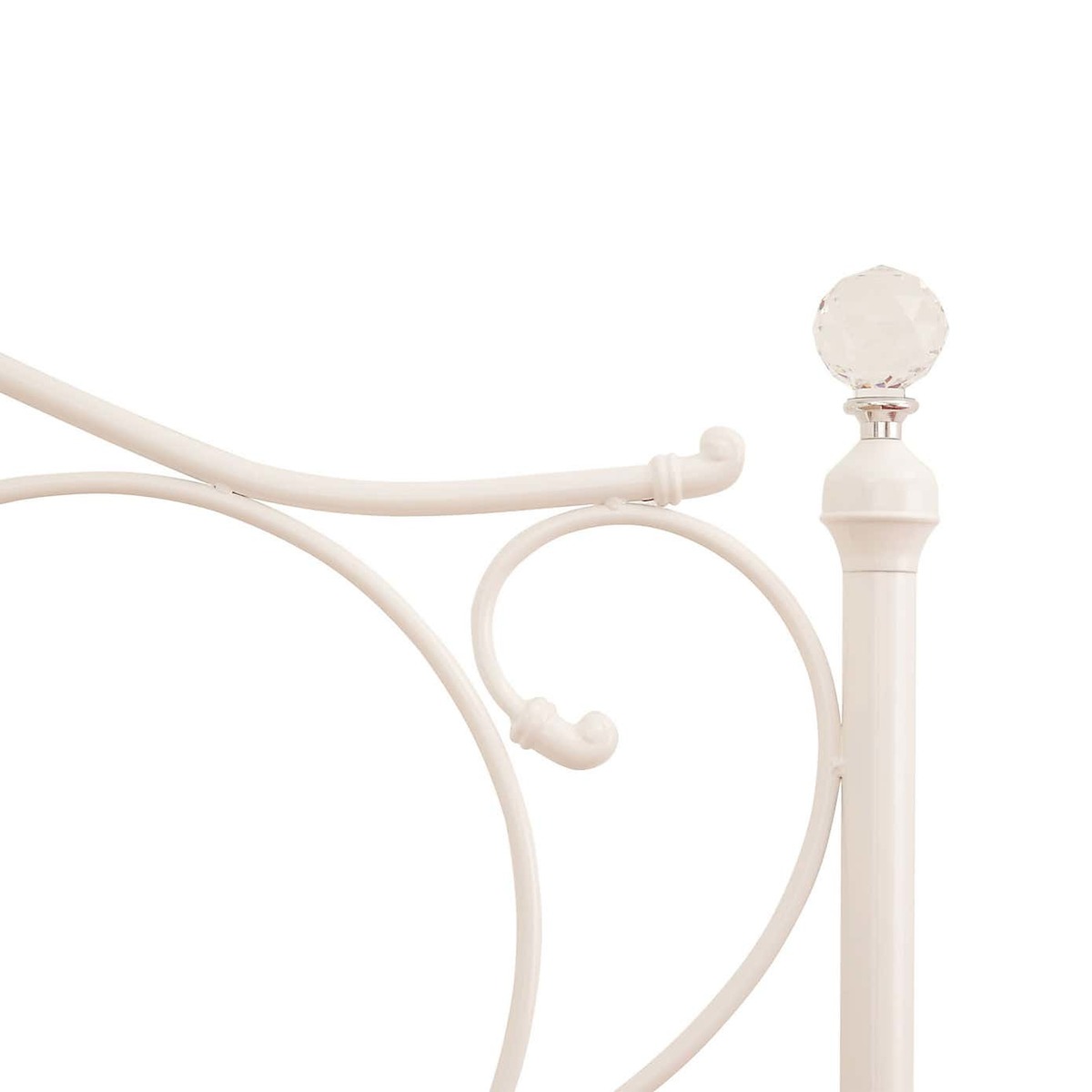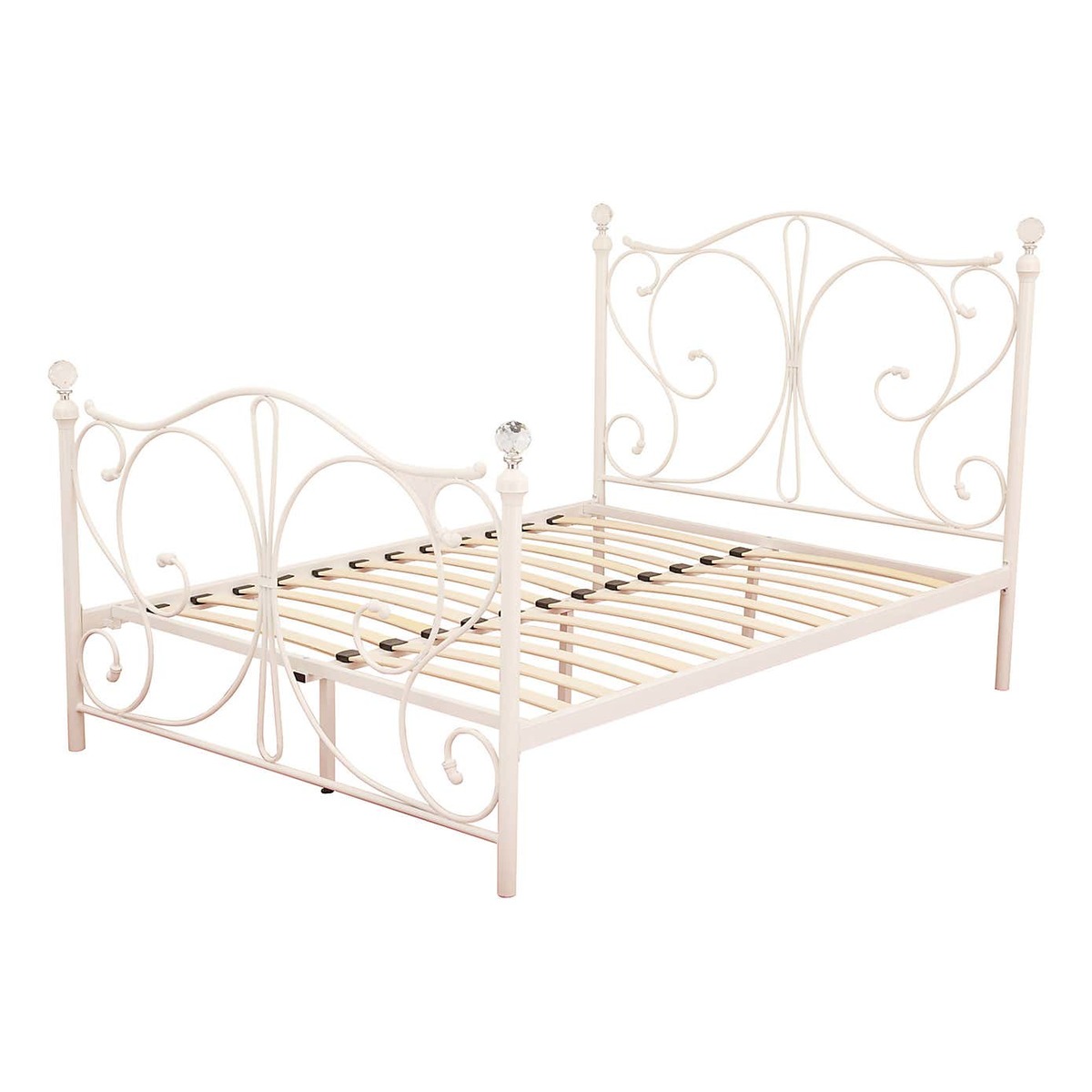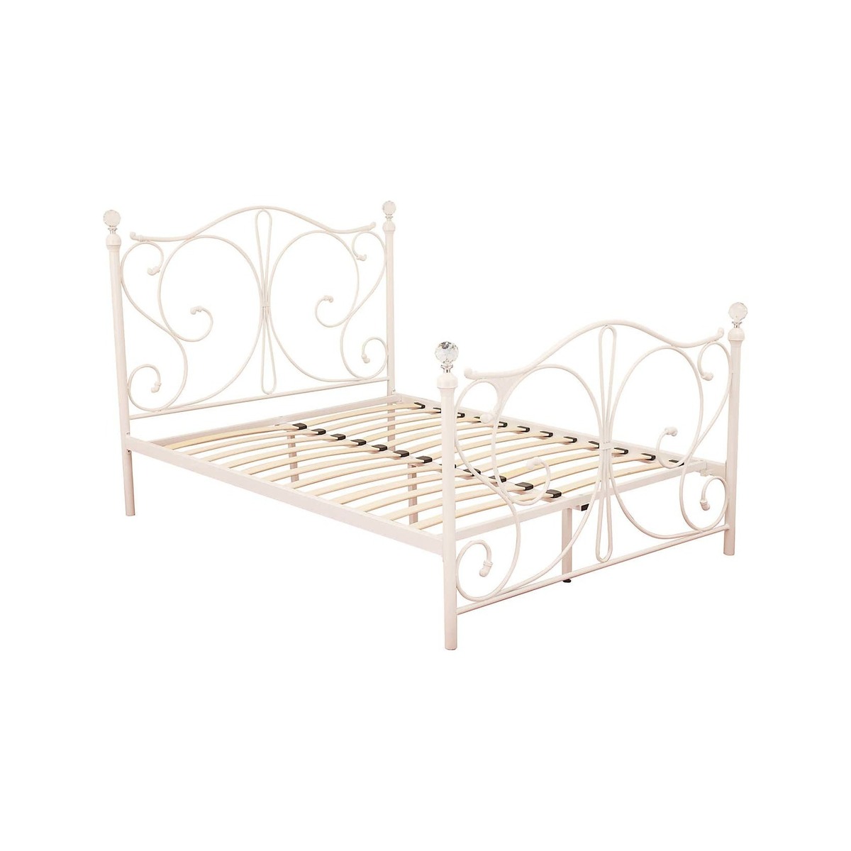 A beautiful bed frame featuring an attractive ornate headboard and foot end with crystal ball bed knobs.
