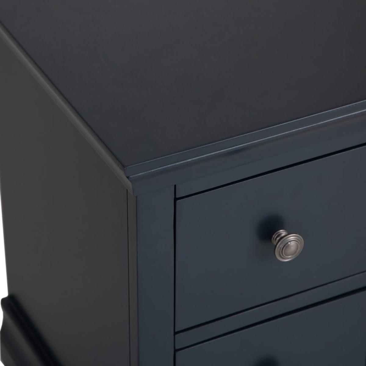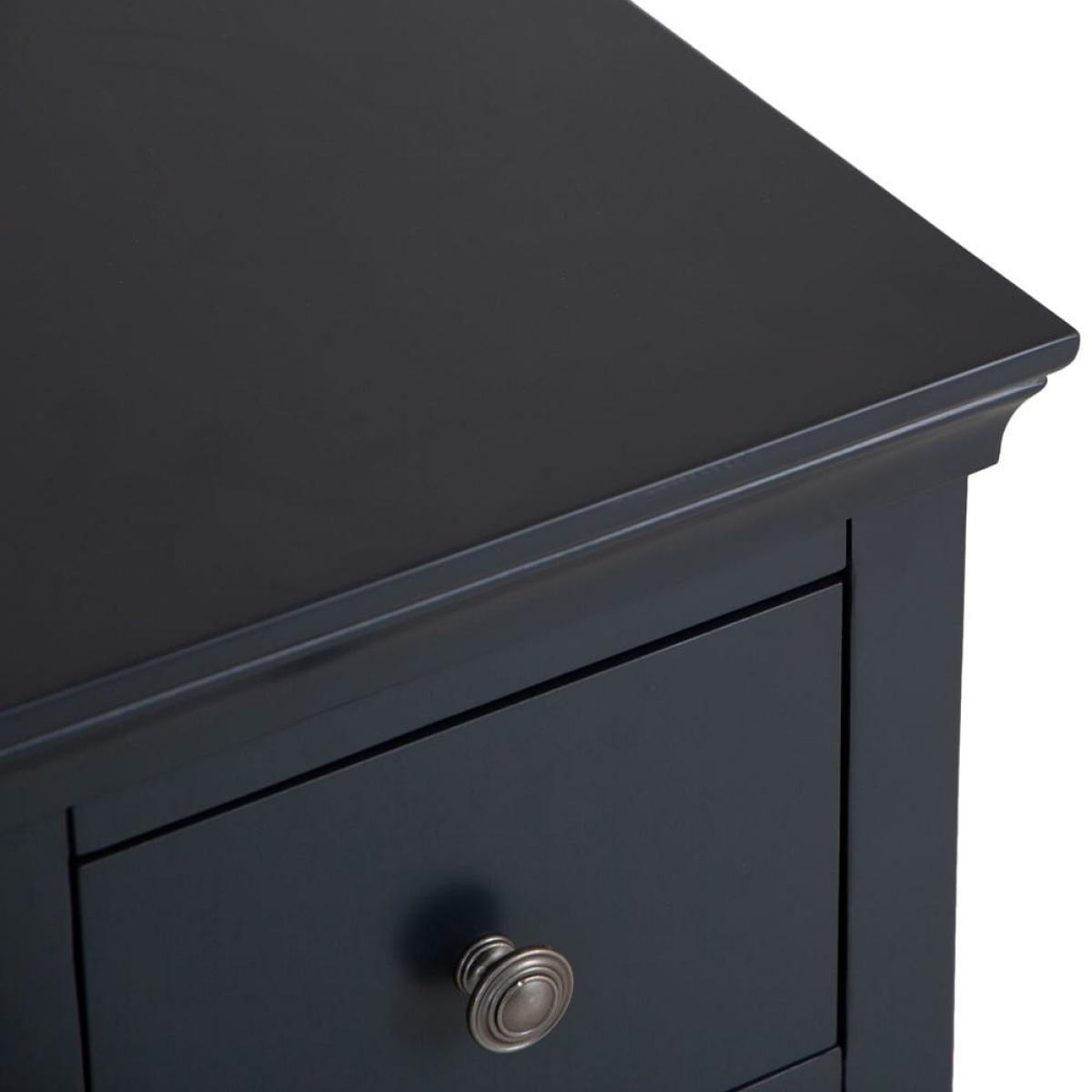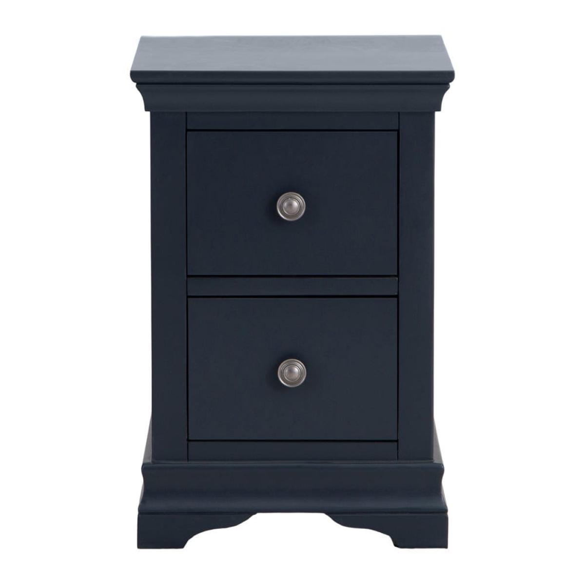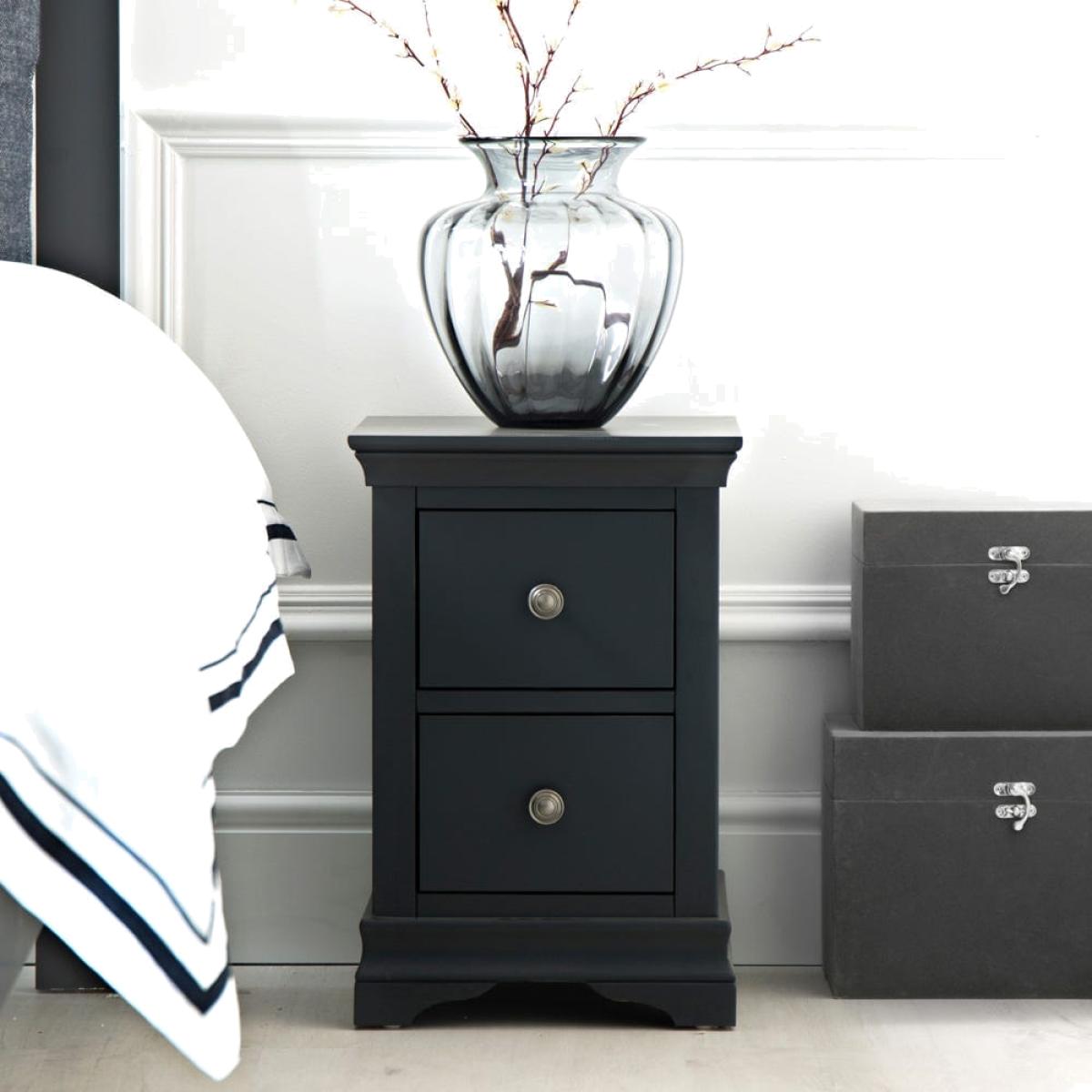 Invite the serenity of a moonlit evening into your sleeping space with the Florence midnight grey painted bedside cabinet. Stood upon graceful bracket feet, this compact piece evokes Georgian and Edwardian era furniture with artisan cornice edgework. But the smart deep grey finish and round pewter handles mean it’ll work with 21st-century interiors too. Fill the double drawer with your favourite bedtime reading materials and place a lovely lamp on top to read them by. At just 36cm wide, why not complete your bed with a pair of these compact bedside cabinets?.
