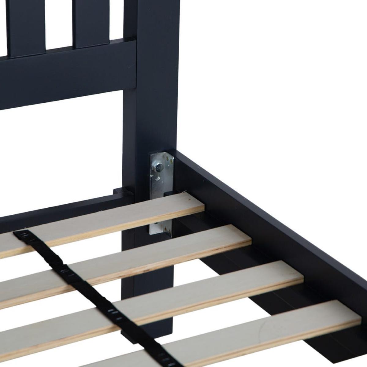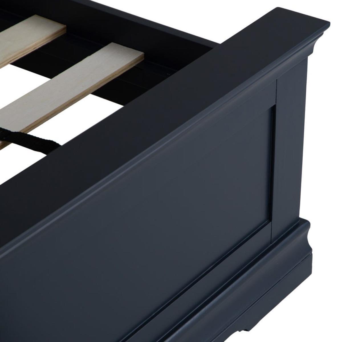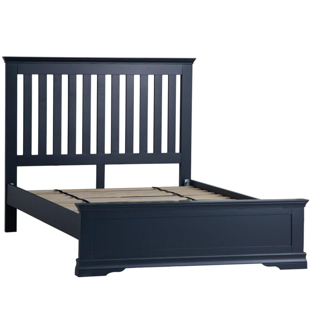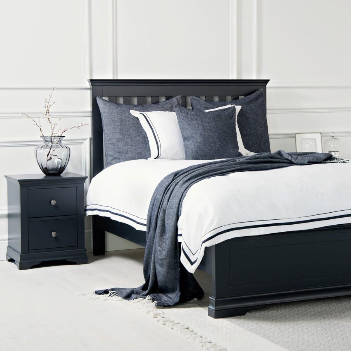Make your bed the centrepiece of your room when you choose our Florence midnight grey painted king size bed frame. It has a solid wood frame, backed on one side with a large slatted headboard and a sturdy footbed at the other. Its king size means there’s space for everyone in the family - including any bed-loving pets who also want to cuddle. This bed frame mixes a modern dark grey colour - which goes with both muted and bright decor - with a traditional design. Regal cornice detailing and grand bracket feet go well with its streamlined structure to create a frame that looks great anywhere.