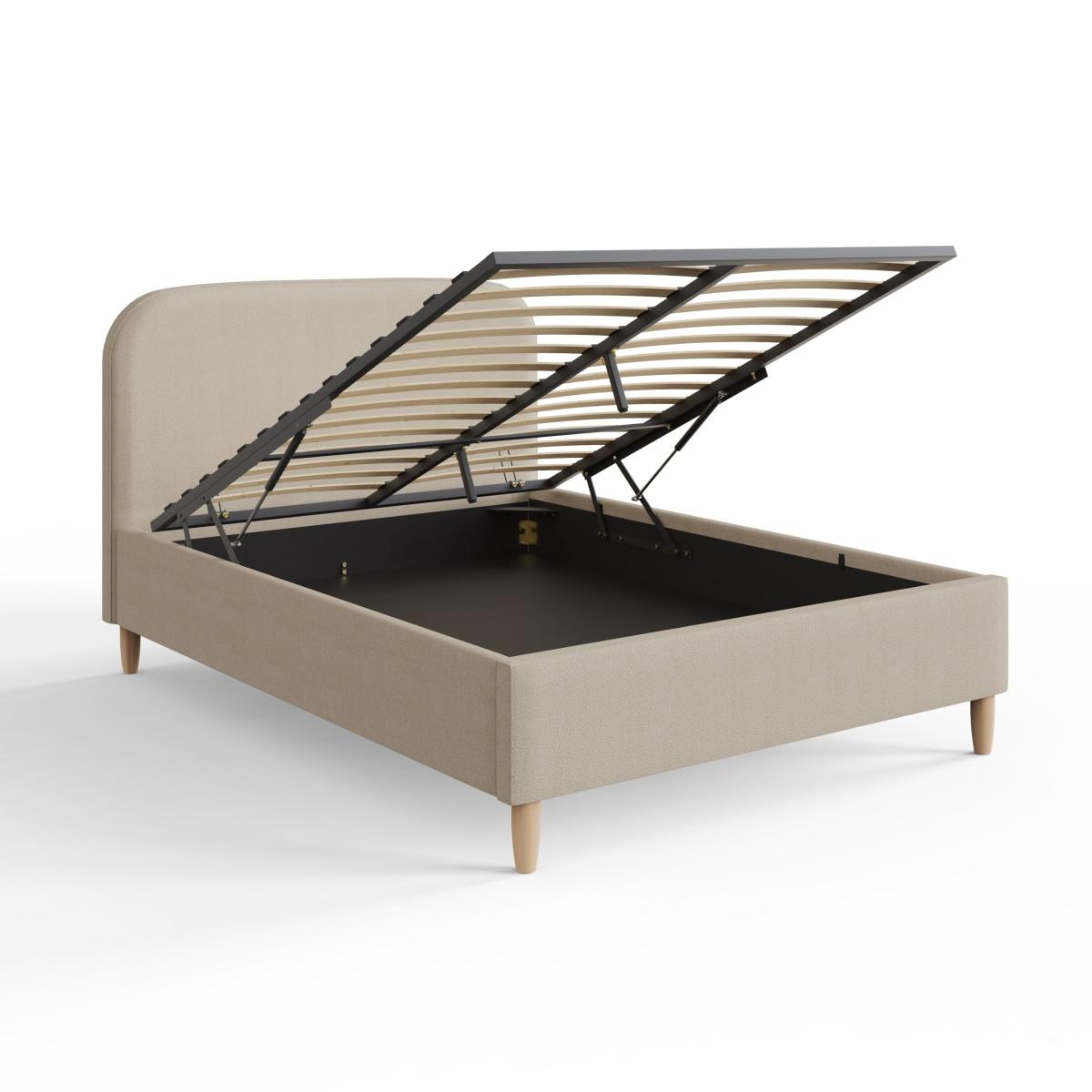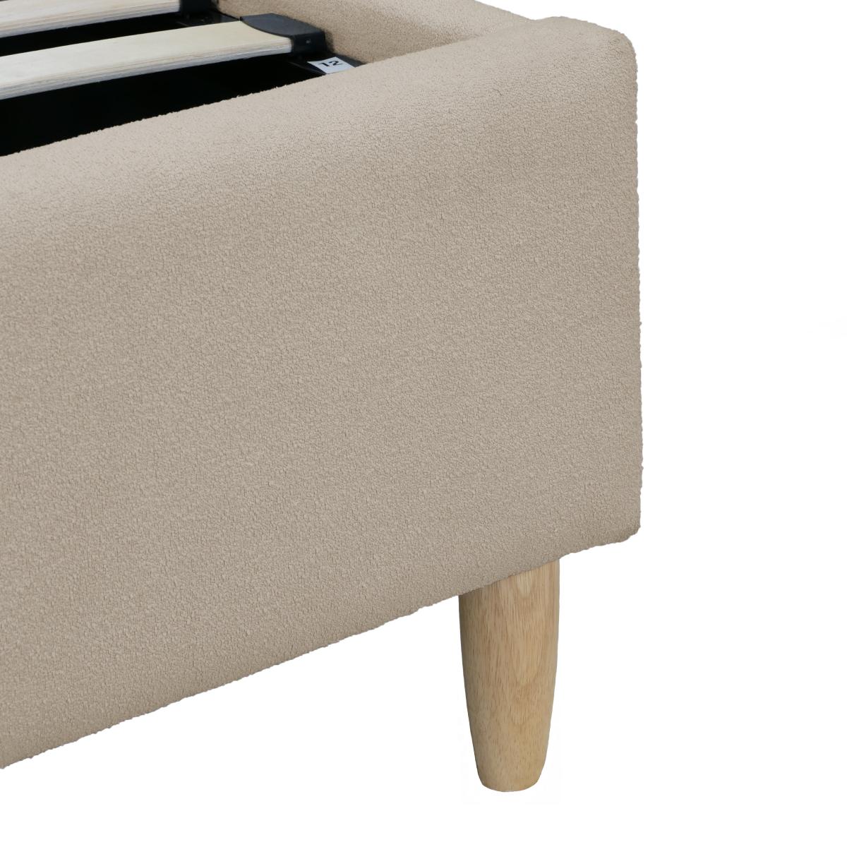 * Classic boucle fabric finish with solid wood legs* Slatted base - for added support and comfort* Timeless and beautiful cushioned headboard* End opening ottoman that opens to reveal ample under bed storage space Transform your bedroom into a haven of comfort and beauty with this Ottoman Bed Frame. Upholstered in luxurious Boucle fabric, this bed not only offers a pleasant touch but is also remarkably easy to care for and highly durable, ensuring it remains a stunning addition to your bedroom for years to come. One of the standout features of this ottoman bed frame is its clever ottoman storage solution. With this innovative feature, you can conveniently store your extra cushions and bedding within arm's reach, making it a practical and space-saving solution all in one. Say goodbye to clutter and hello to a beautifully organized bedroom. Crafted with wooden legs, the bed exudes a sense of spaciousness, while the low foot end adds a contemporary and effortlessly stylish touch to the overall frame. The style of this frame effortlessly blends into any modern decor, adding an elegant flair to your sleeping sanctuary.