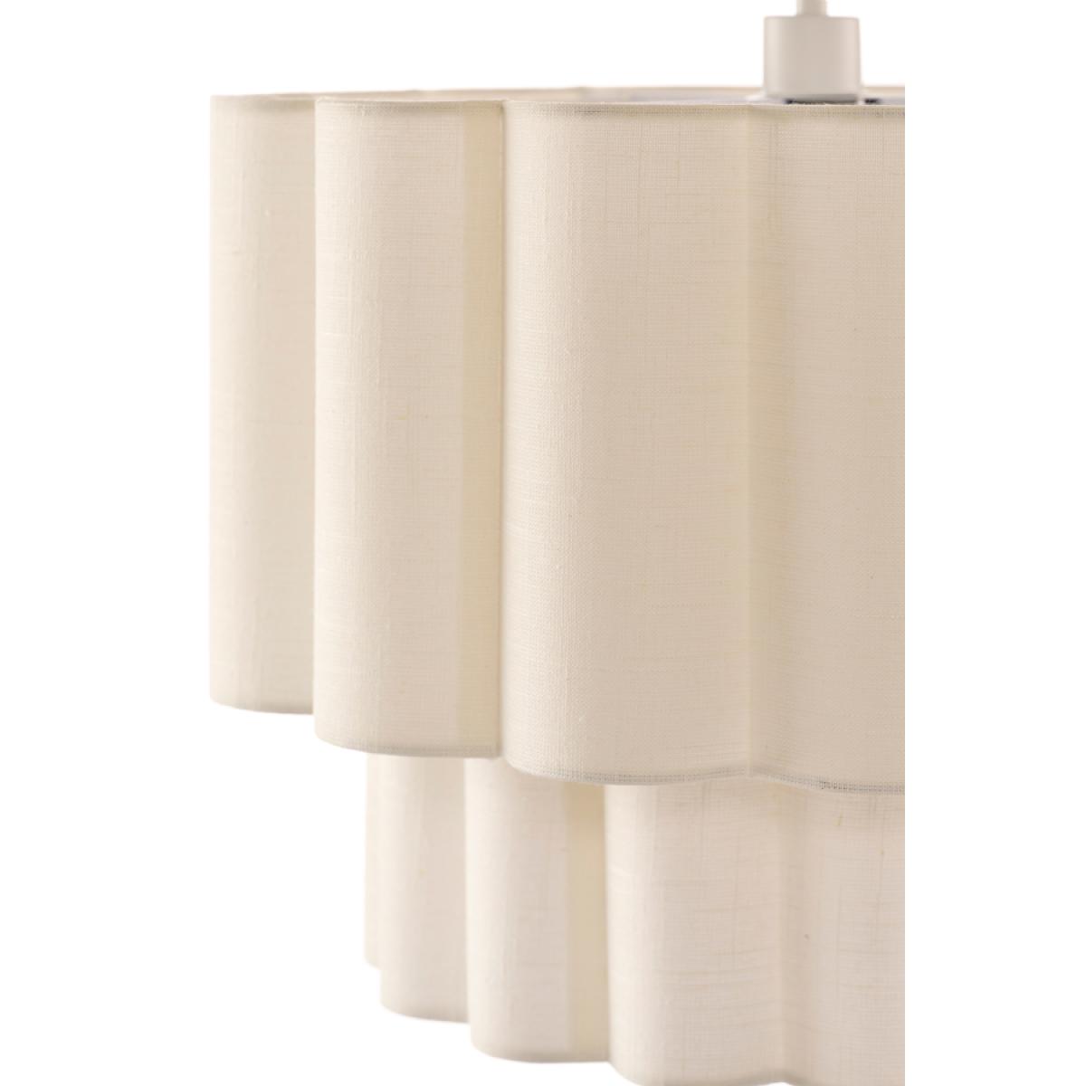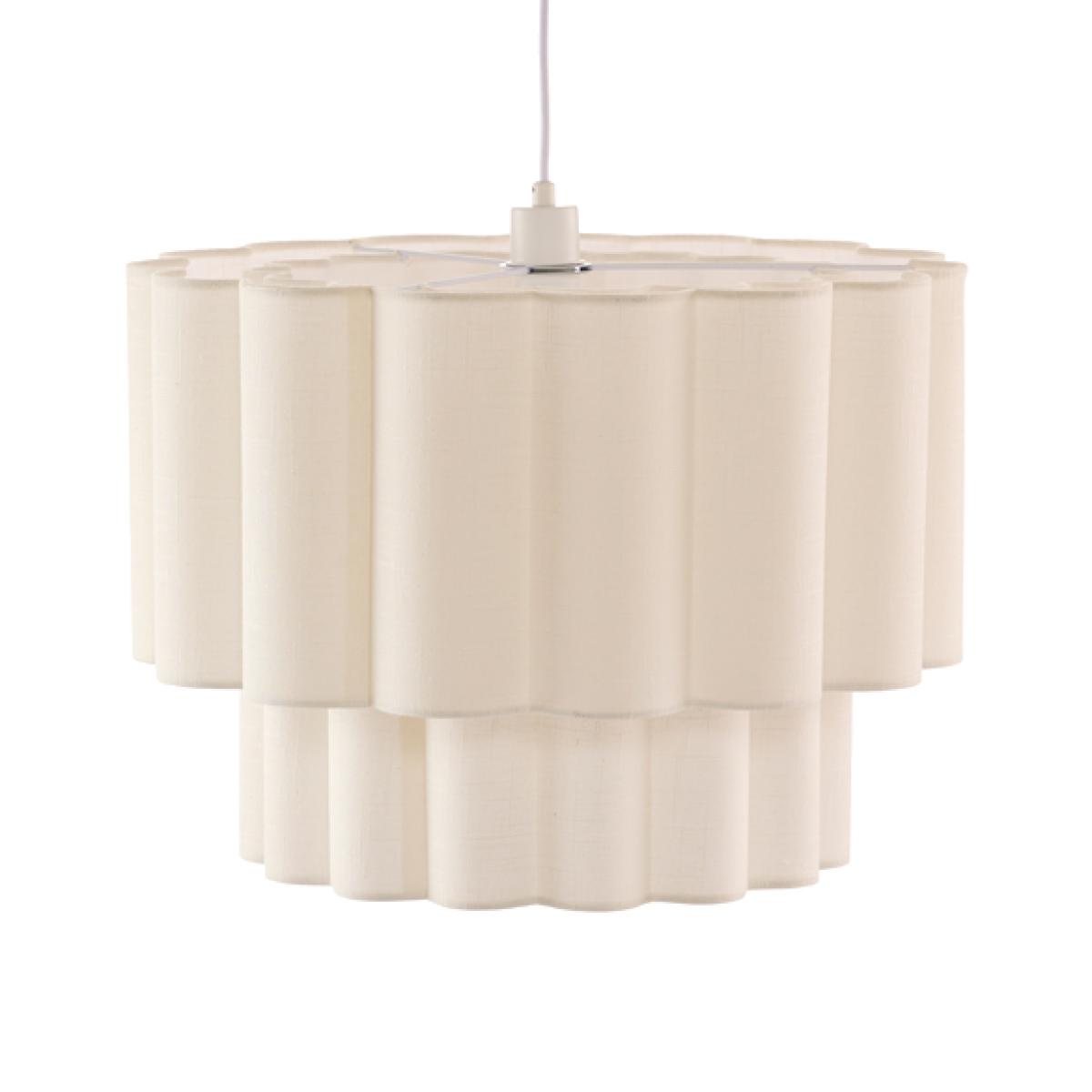 A contemporary, sculptural ceiling light featuring a scalloped, layered drum shade. Ivory linen-effect fabric. Ivory woven cable. Ivory metal ceiling rose and bulb holder. Supplied complete with E27 40W bulb. Height adjustable prior to installation.