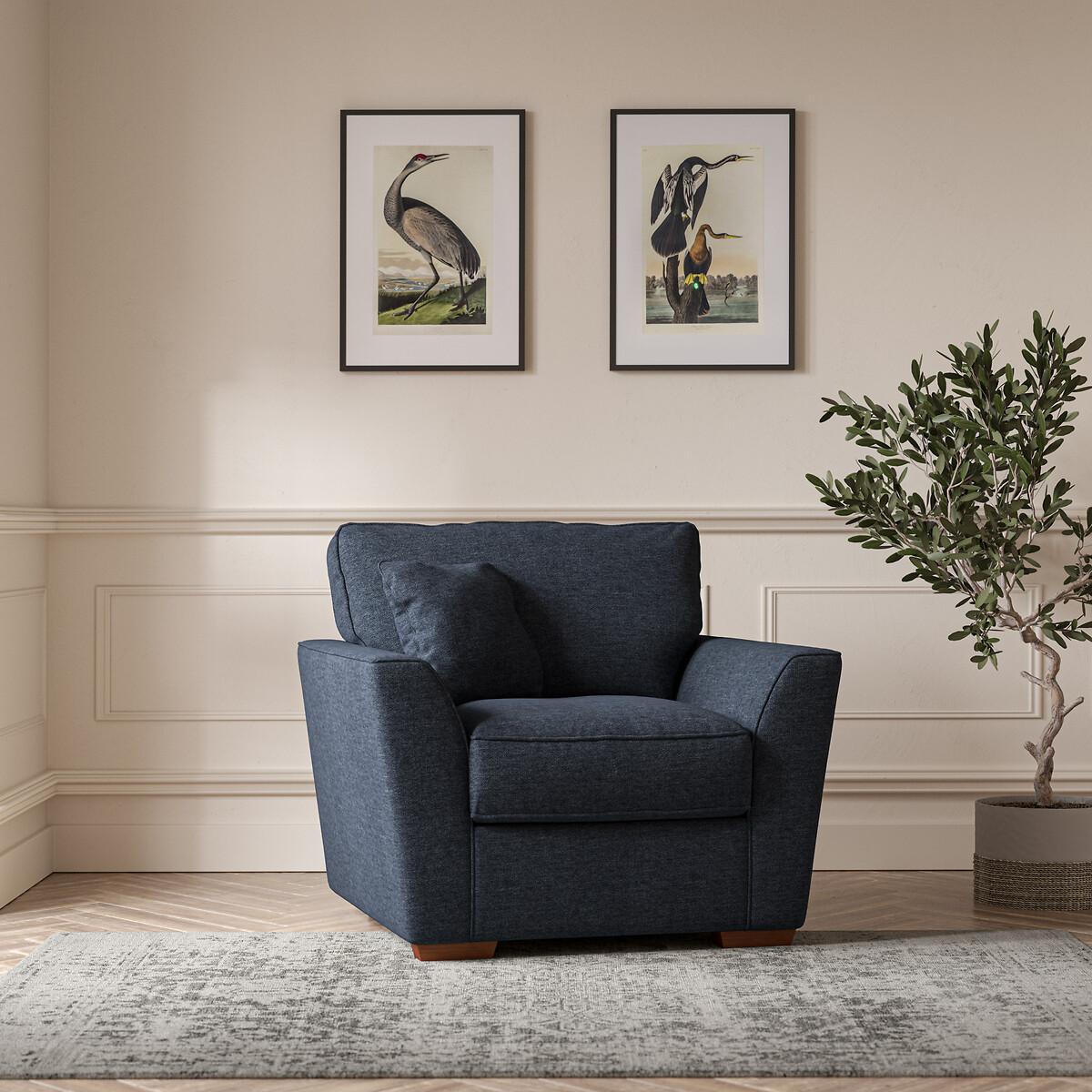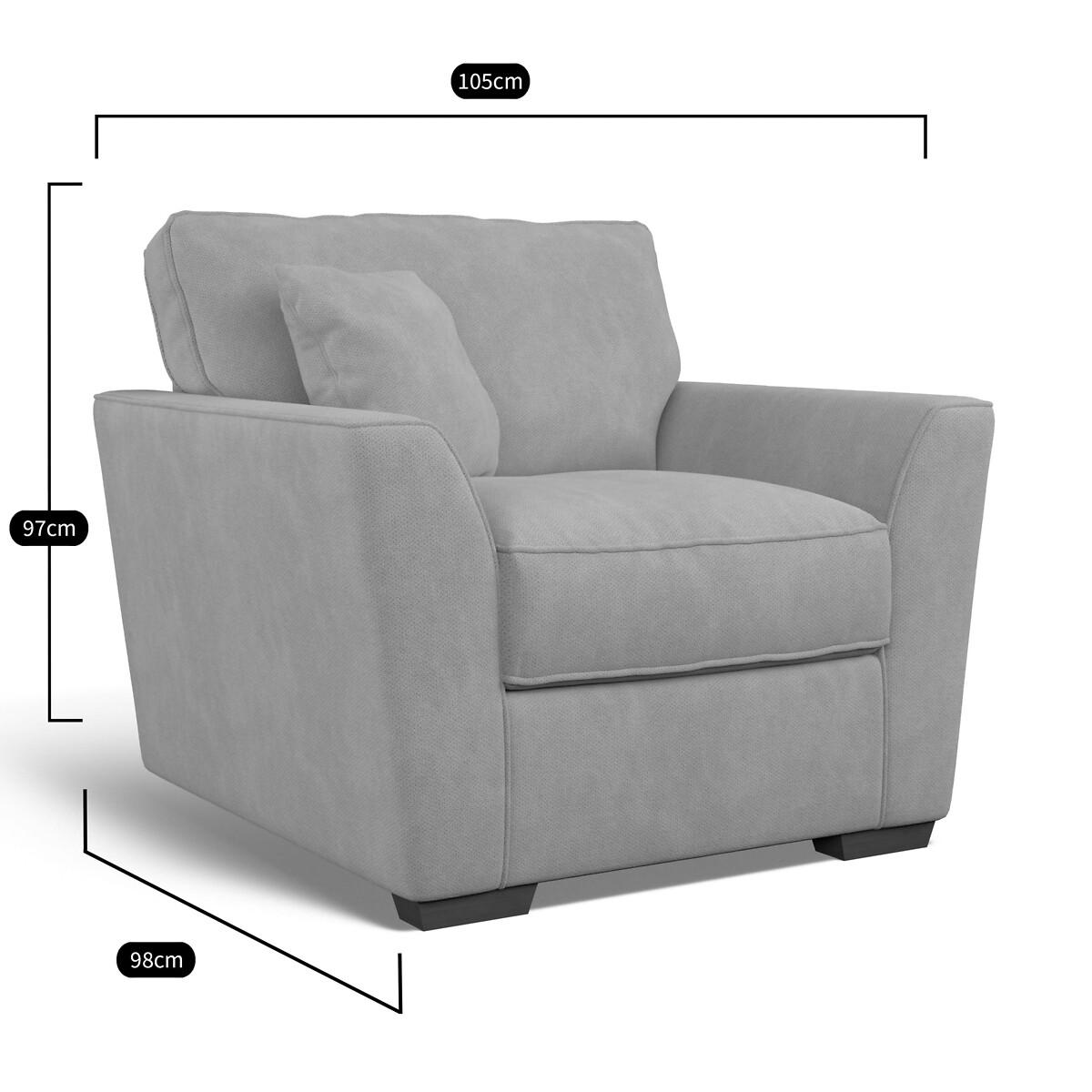 Lean back and relax….the Florence is the ultimate deep armchair with a supportive high back, classic in design and never out of style. Sturdy flared arms with a flattened top are perfect for perching a cup of tea. The high-comfort foam seat fillings are not only comfy but have great durability, keeping their shape over time with little care needed. Choose from our soft brushed fabric for ultimate cosiness, or woven for a textured look. Match with the Florence footstool, or choose a bigger size with the 2 seater, 3 seater, or L-shape corner sofa. Product details• Soft Brushed - A cosy and practical flat and soft weave featuring a gently brushed handle for a superbly snuggly seat. Check it's right for you - order a FREE swatch above.• A supportive seat with medium comfort level, underpinned by a spring frame for durability.• Extraflex© high comfort seat cushions have a special hybrid filling made up of a thick layer of resilient foam, topped with a generous layer of super soft aerated fibre, meaning they are firm in the centre but have a pillowy comfortably layer of softness. • Back cushions full of aerated fibres provide softness and give you that "sink in" feeling.• Scatter cushions included as pictured in matching fabric. Fibre filled (x3). • Solid beech wood feet.• Serpentine seat springs & silent wire.• Superloop back springs.• Solid hardwood frame.• Removable covers (both seat and back)• Removable feet.• Lovingly handmade in the UK.All our made to order sofas are carefully manufactured in the UK.Each hardwood frame is dowelled, glued, and screwed before being paired with the finest fabrics and fillings. And it doesn't stop there - for customer peace of mind and safety, all frames and fabrics are rigorously examined, inspected, and tested to the highest standards. All filling material(s) and covering fabric(s) meet the requirements for resistance to cigarette and match ignition in the 1988 safety regulations. A 2 year manufacturers warranty from date of delivery (guarantee of replacement of any faulty goods subject to the product having been used under normal conditions for its intended purpose)Product composition• Fabric- Soft Brushed (100% polyester)• Seat Fillings - Extraflex foam• Back Fillings - Blown fibre• Feet - solid beech wood• Frame - solid hardwood Product Dimensions Overall width: 105 cm. Overall depth: 98 cm. Overall height: 97 cm. Seat height: 56 cm. Seat depth: 55 cm. Seat width between the arms: 60 cm. Back height (from base): 93 cm. Back height (from seat): 42 cm. Arm height (from floor): 68 cm. Arm height (from seat): 13 cm Clearance to floor (leg height): 4.5 cm. Small scatter cushion: 45 cm x 45 cm. Please remember to measure your available space before ordering to be sure your sofa will fit. Don't forget to measure accessways and corners, and consider any obstacles. Package DimensionsL10. 7 cm x W100 cm x H99 cm, Weight 36.5 kg. This product will be dispatched by one of our trusted suppliers. You’ll be contacted by their selected courier about your delivery. Your product will be delivered to your room of choice. The feet of the Florence are fitted with cardboard packaging and Travel Glide protectors to keep them intact in transit. Travel Glide feet require removal on arrival. No additional tools are required. BUOYA01