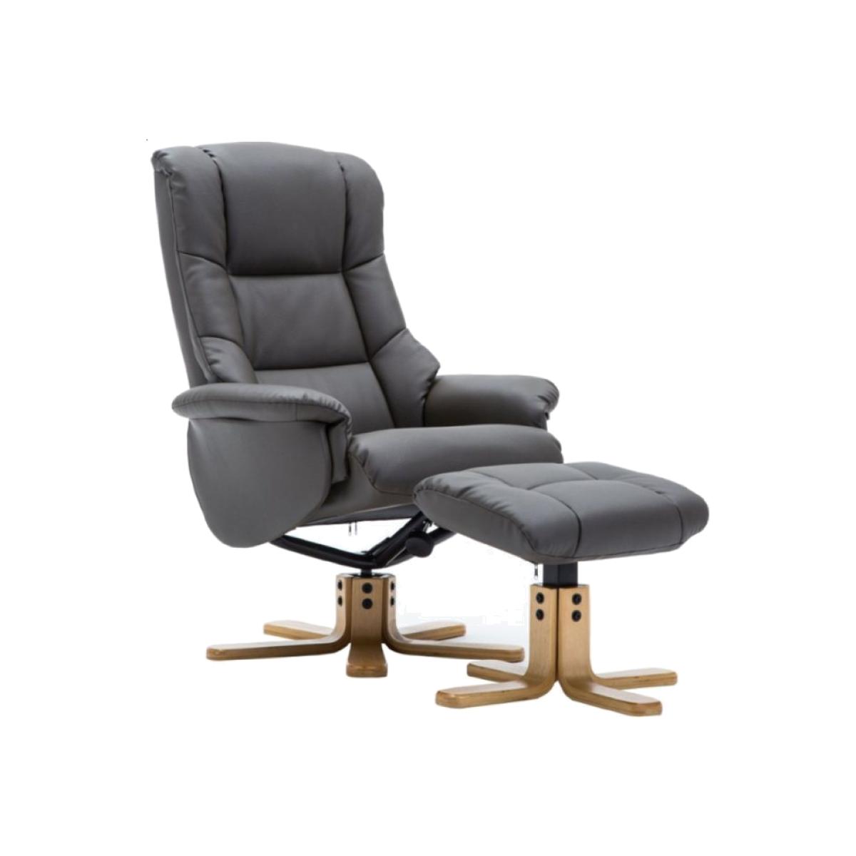 GFA’s best-selling design! The Florence swivel recliner and footstool has a touch of rich, traditional and contemporary look and feel to it. It benefits from a 360-degree swivel and an easy to use recline mechanism. Available in a selection of soft faux leather along with its plush sit, the Florence is an impressive addition to any home!. Material: Plush PU. Colour: Charcoal/Mid Oak. Weight Limit KG: 115.