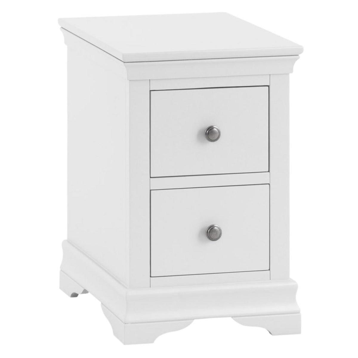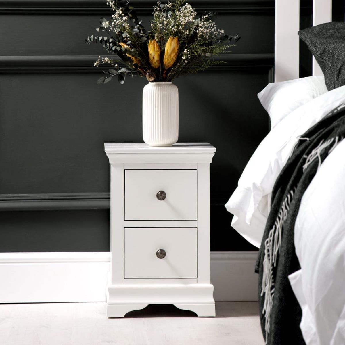 Everything has its place when night falls with one of our handy Florence white painted bedside tables. Place this small but perfectly formed cabinet within arm’s reach of bed as a spot for your lamp, glasses and current favourite read. Its delicate painted white finish means it will blend into your space and provide a sense of calm. With a solid pine frame, pewter-style round handles and subtle cornice detailing, it mixes old-school and modern furnishing styles. The cabinet comprises two narrow drawers just over 18cm wide that are just the size for stashing a journal, phone charger and sleep spray.