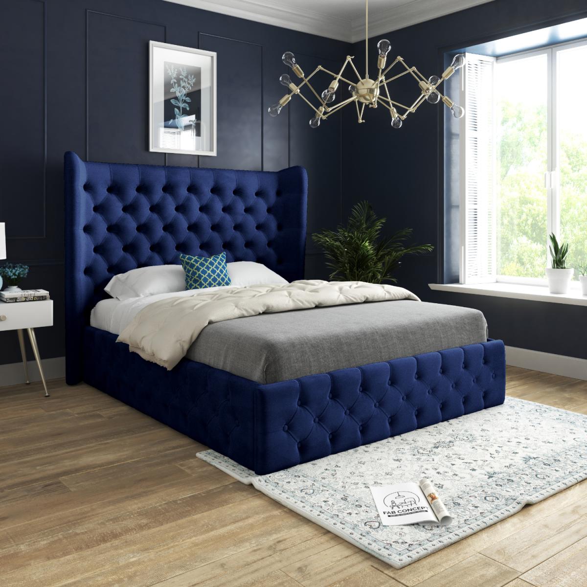 I’m a fan of this velvet winged bed for the way it combines a statement headboard with a soft, tactile finish - perfect if you want to introduce a jewel-tone pop without overwhelming the room. The deep blue velvet works equally well in a contemporary scheme with crisp white walls and black-metal bedside tables, or in a more traditional setting layered with brass accents and patterned rugs. To style it, keep bedding in neutral shades - think soft greys or off-whites - and add texture with a chunky knit throw or velvet cushions in complementary tones. Position the bed against a feature wall (painted or papered) to really show off those wings, and balance the look with pared-back lighting, such as wall-mounted lamps or a simple pendant.