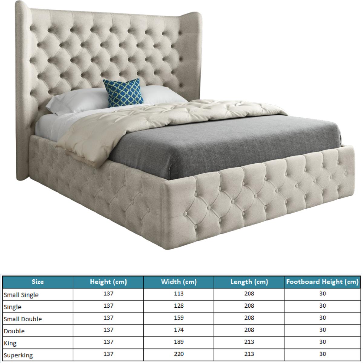 This Glorious Winged bed is the epitome of opulence. Classic Chesterfield design with Pleated headboard upholstery and pleated siderails with matching footboard. The delicate button detailing provides you with a sumptuous padded surface to help you relax whilst reading in bed. The bed comes with a solid slatted base for mattress longevity and and supreme ventilation.
