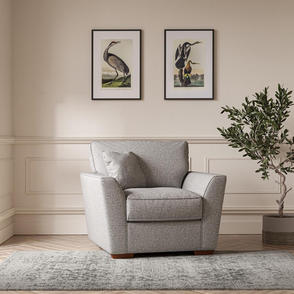 Lean back and relax….the Florence is the ultimate deep armchair with a supportive high back, classic in design and never out of style. Sturdy flared arms are perfect for perching a cup of tea. The high-comfort foam seat fillings are not only comfy but have great durability, keeping their shape over time with little care needed. Choose from our soft brushed fabric for ultimate cosiness, or woven for a textured look. Match with the Florence footstool, or choose a bigger size with the 2 seater, 3 seater, or L-shape corner sofa. Product details• Woven - A practical, hardwearing fabric perfect for standing up to the demands of family life. Heavy-weighted and tight weave fabrics are known for their durability, whilst a slightly grainy two-toned weave is forgiving of any small marks! Check it's right for you - order a FREE swatch above.• A supportive seat with medium comfort level, underpinned by a spring frame for durability.• Extraflex© high comfort seat cushions have a special hybrid filling made up of a thick layer of resilient foam, topped with a generous layer of super soft aerated fibre, meaning they are firm in the centre but have a pillowy comfortably layer of softness. • Back cushions full of aerated fibres provide softness and give you that "sink in" feeling.• Scatter cushions included as pictured in matching fabric. Fibre filled (x3). • Solid beech wood feet.• Serpentine seat springs & silent wire.• Superloop back springs.• Solid hardwood frame.• Removable covers (both seat and back)• Removable feet.• Lovingly handmade in the UK.All our made to order sofas are carefully manufactured in the UK.Each hardwood frame is dowelled, glued, and screwed before being paired with the finest fabrics and fillings. And it doesn't stop there - for customer peace of mind and safety, all frames and fabrics are rigorously examined, inspected, and tested to the highest standards. All filling material(s) and covering fabric(s) meet the requirements for resistance to cigarette and match ignition in the 1988 safety regulations. A 2 year manufacturers warranty from date of delivery (guarantee of replacement of any faulty goods subject to the product having been used under normal conditions for its intended purpose)Product composition• Fabric- Woven (100% polyester)• Seat Fillings - Extraflex foam• Back Fillings - Blown fibre• Feet - solid beech wood• Frame - solid hardwood Product Dimensions Overall width: 105 cm. Overall depth: 98 cm. Overall height: 97 cm. Seat height: 56 cm. Seat depth: 55 cm. Seat width between the arms: 60 cm. Back height (from base): 93 cm. Back height (from seat): 42 cm. Arm height (from floor): 68 cm. Arm height (from seat): 13 cm Clearance to floor (leg height): 4.5 cm. Small scatter cushion: 45 cm x 45 cm. Please remember to measure your available space before ordering to be sure your sofa will fit. Don't forget to measure accessways and corners, and consider any obstacles. Package DimensionsL10. 7 cm x W100 cm x H99 cm, Weight 36.5 kg. This product will be dispatched by one of our trusted suppliers. You’ll be contacted by their selected courier about your delivery. Your product will be delivered to your room of choice. The feet of the Florence are fitted with cardboard packaging and Travel Glide protectors to keep them intact in transit. Travel Glide feet require removal on arrival. No additional tools are required. BUOYA01