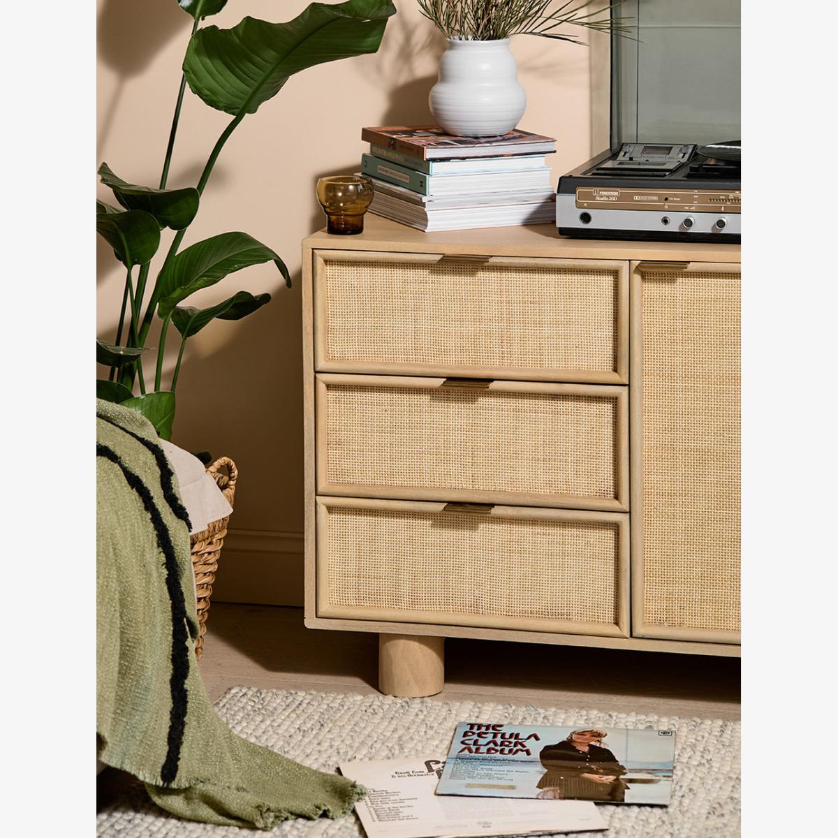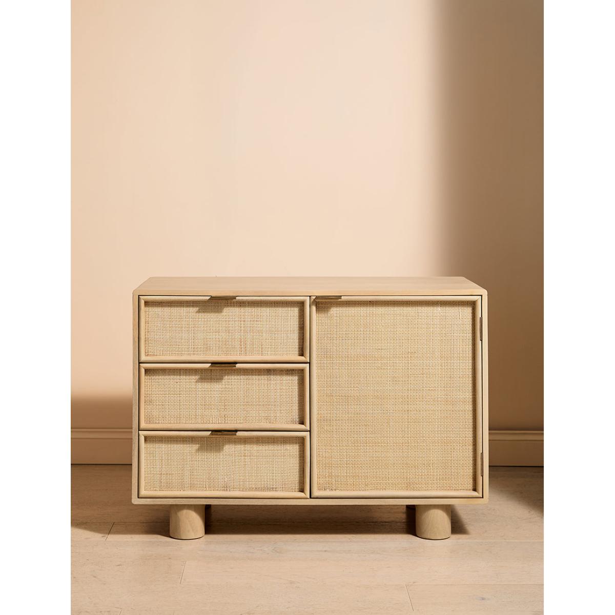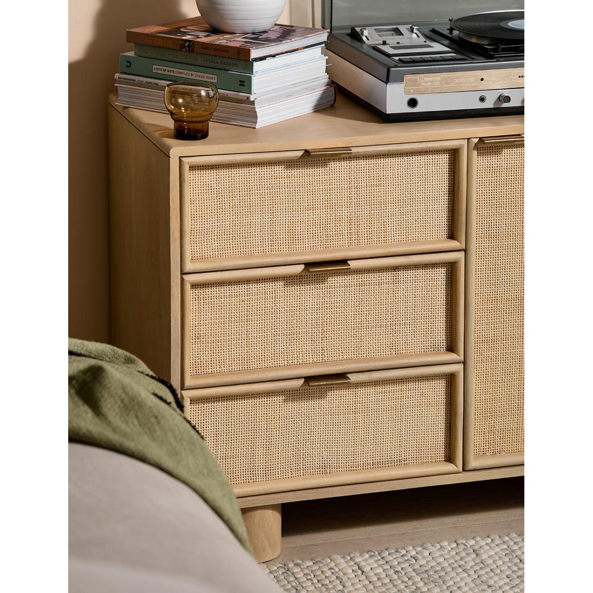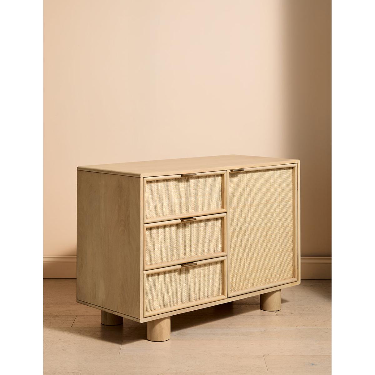 This collection features intricately woven cane set within a modern, minimal mango wood frame - think calm straight lines, perfect proportions and pared back details. We love the (almost) hidden brass handles. This sideboard features 1 door and 3 drawers - perfect for stacking anything from serving dishes and desert bowls to your lovely linen stash and board games. The drawers are excellent for organising cutlery, table linens and if you're like us, your collection of colourful dinner candles!This would also be a great office piece - perfect for stashing printers, paper, folders and files. Also available as a bedside table, large sideboard, wide chest of drawers, slim chest of drawers and a console table
