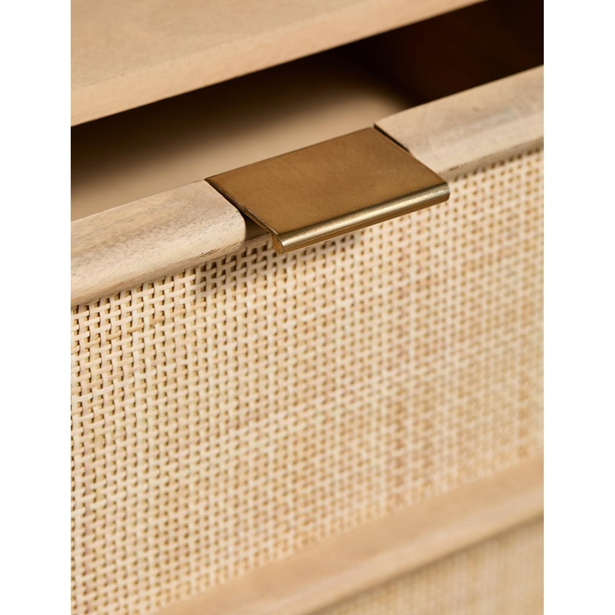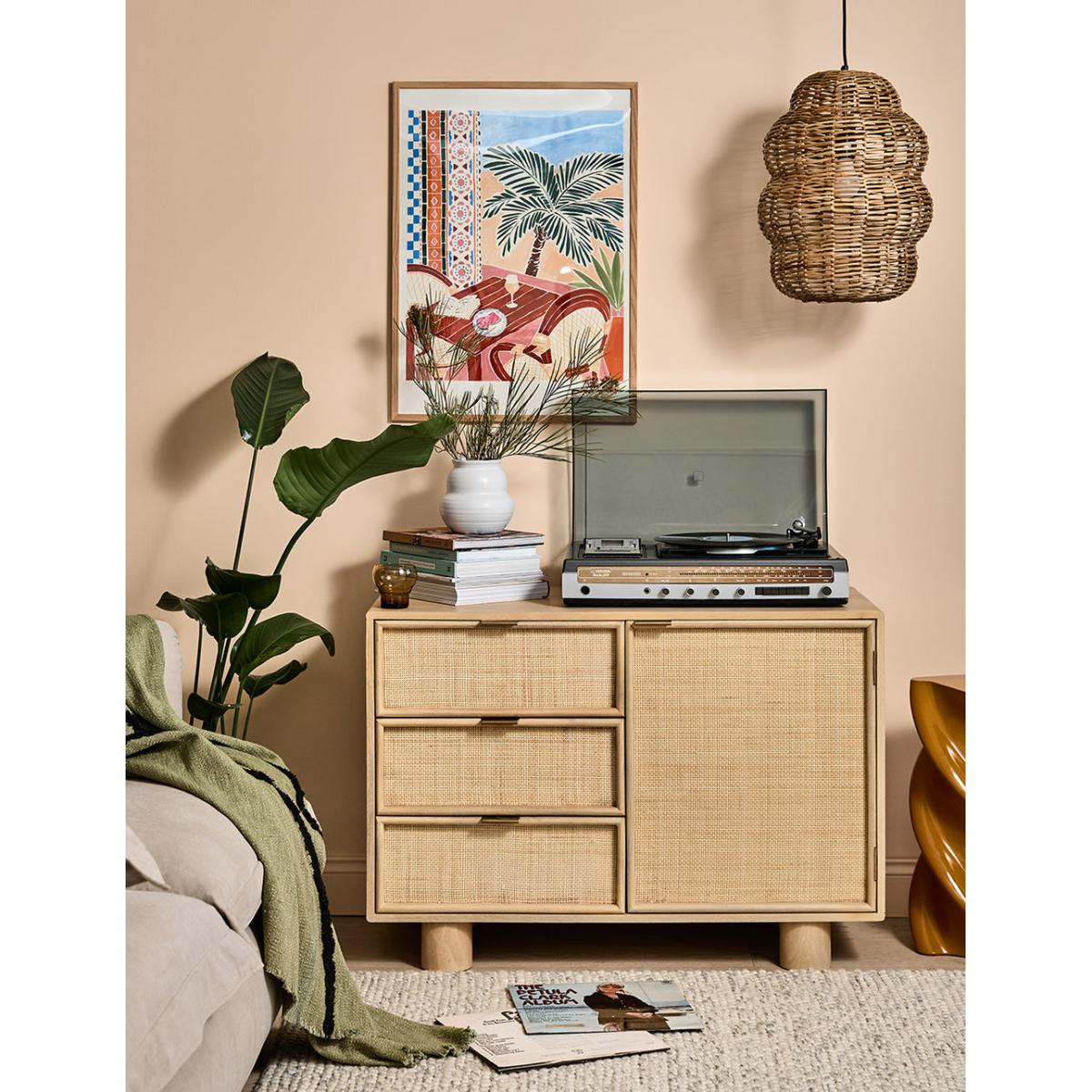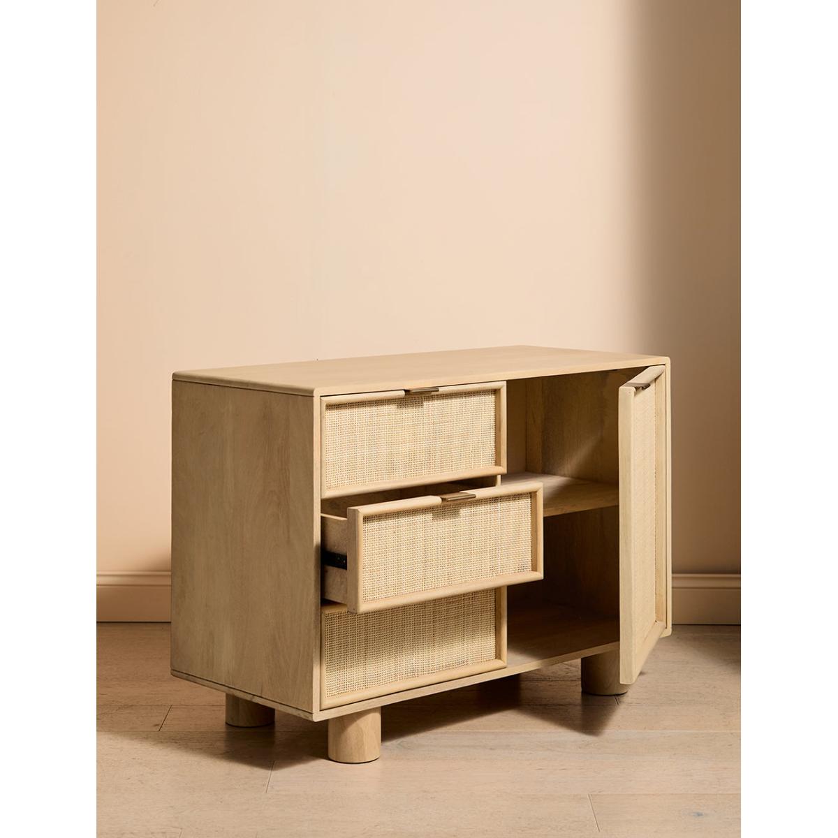 This collection features intricately woven cane set within a modern, minimal mango wood frame - think calm straight lines, perfect proportions and pared back details. We love the (almost) hidden brass handles. This sideboard features 1 door and 3 drawers - perfect for stacking anything from serving dishes and desert bowls to your lovely linen stash and board games. The drawers are excellent for organising cutlery, table linens and if you're like us, your collection of colourful dinner candles!This would also be a great office piece - perfect for stashing printers, paper, folders and files. Also available as a bedside table, large sideboard, wide chest of drawers, slim chest of drawers and a console table