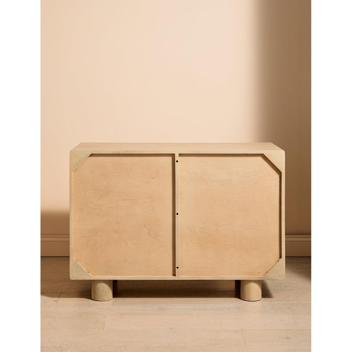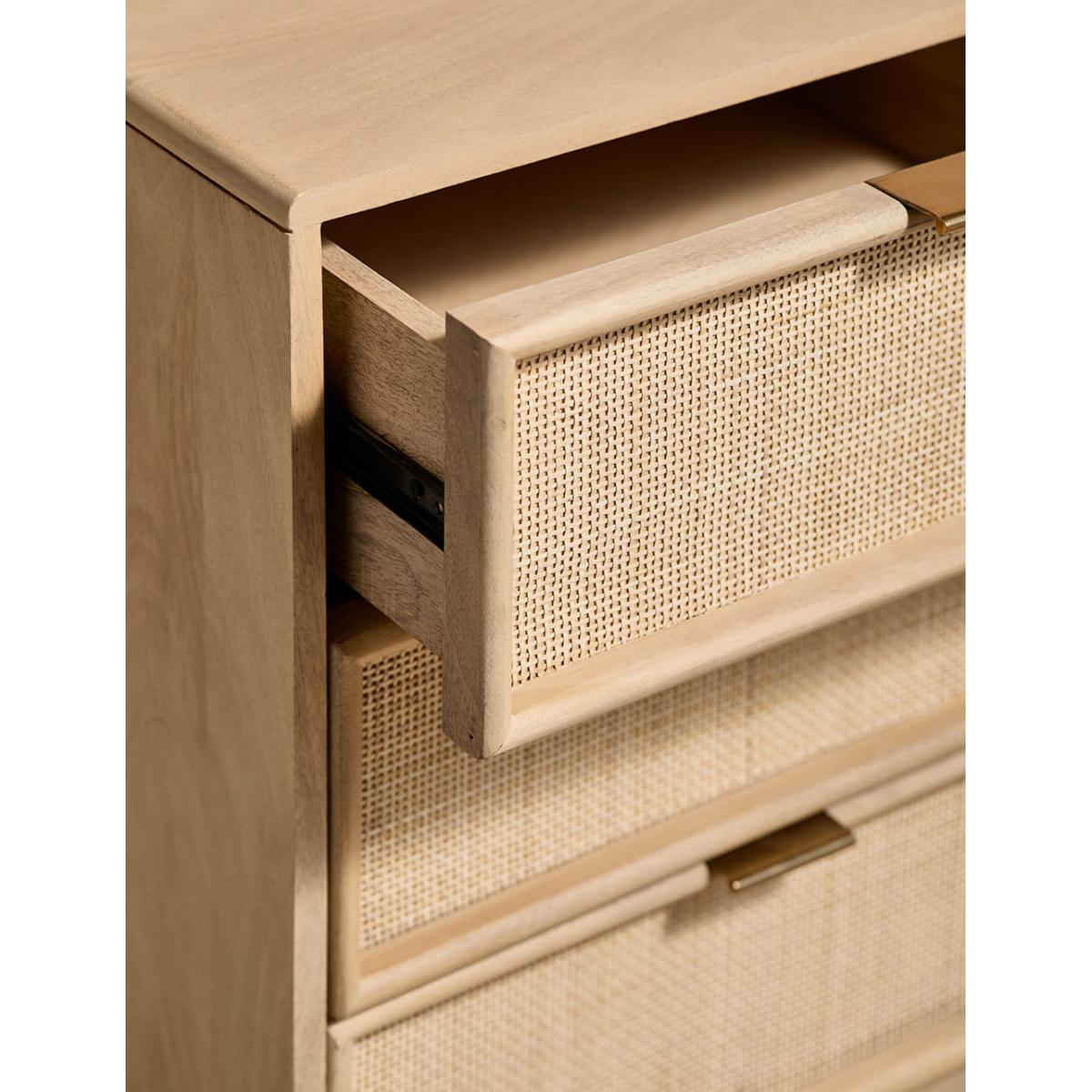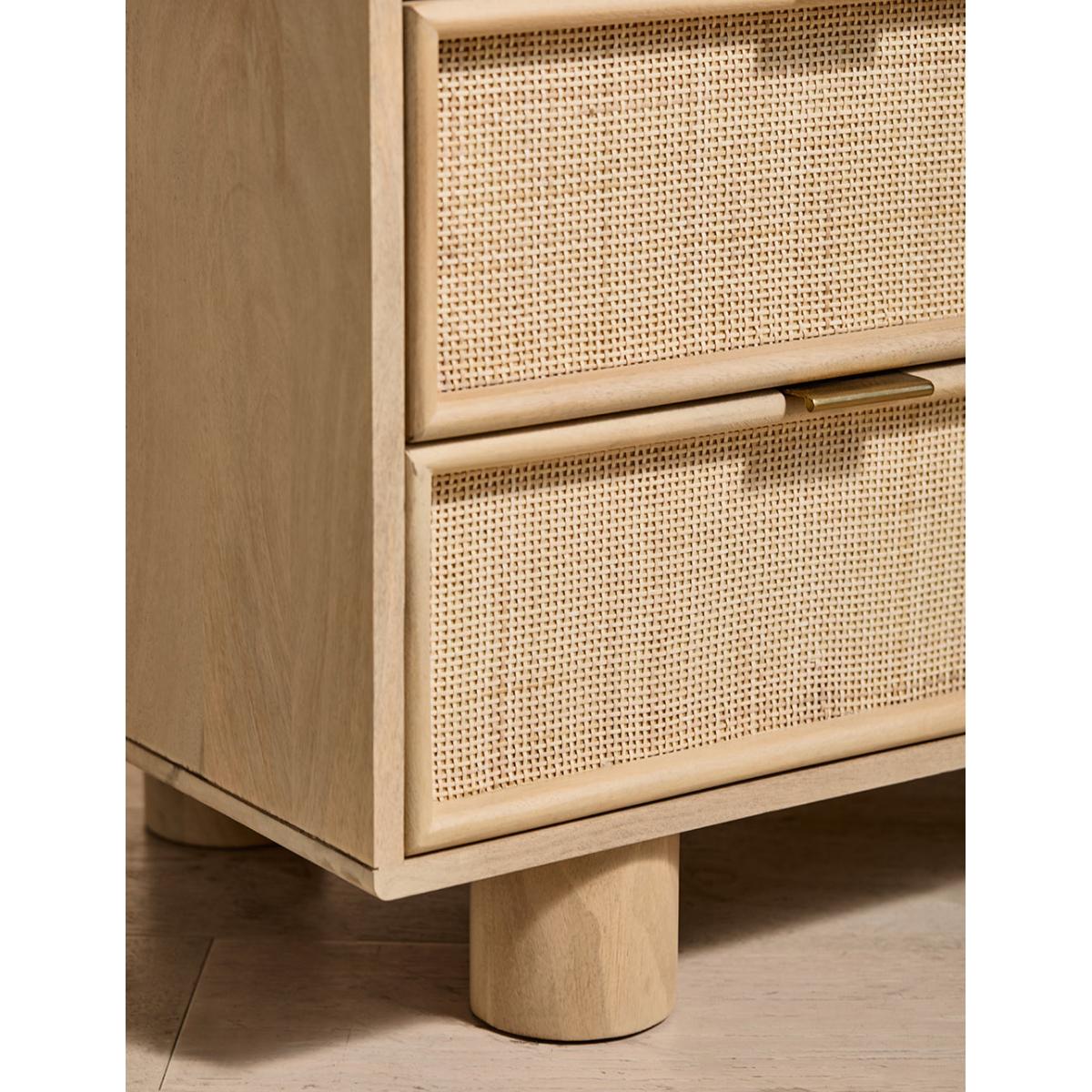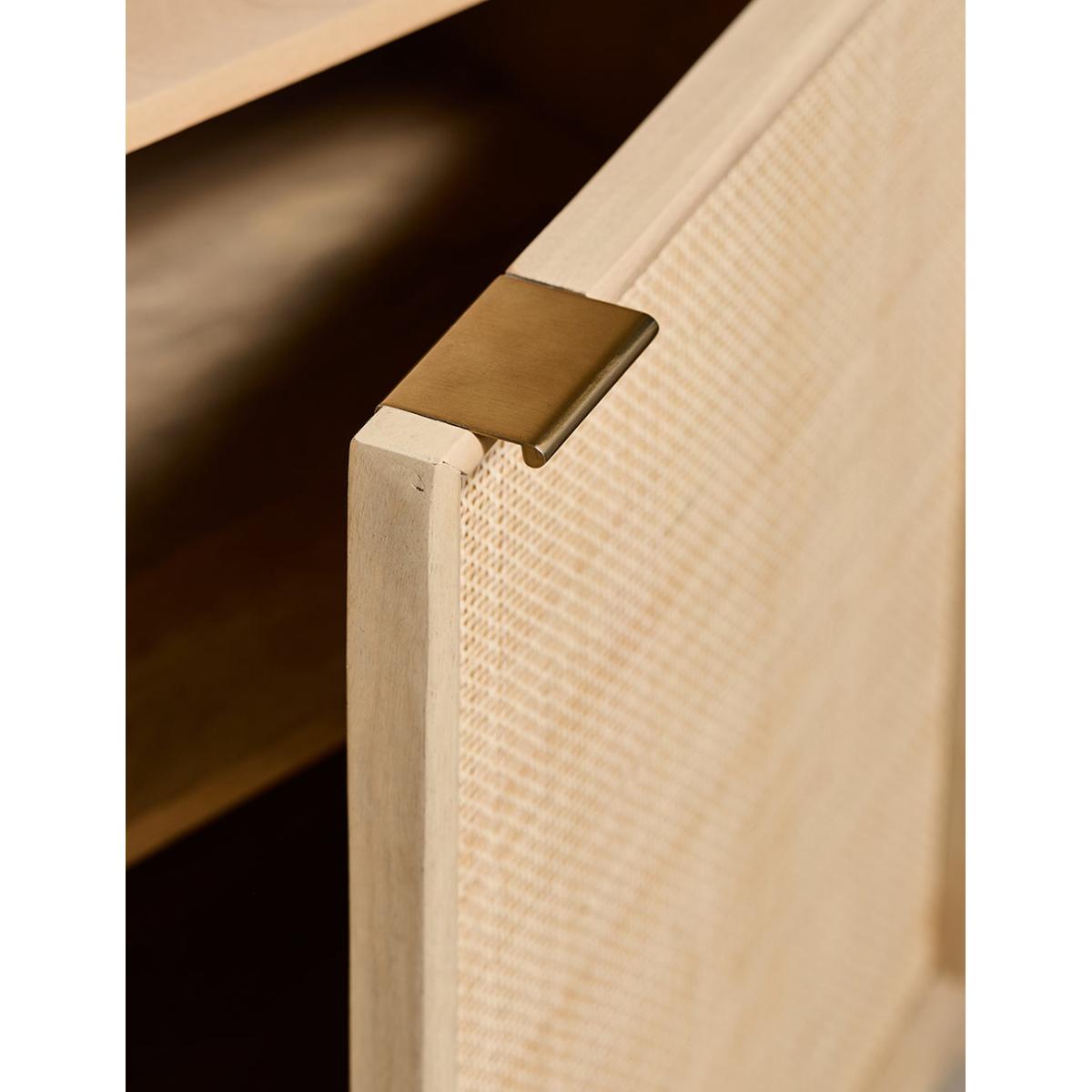 This collection features intricately woven cane set within a modern, minimal mango wood frame - think calm straight lines, perfect proportions and pared back details. We love the (almost) hidden brass handles. This sideboard features 1 door and 3 drawers - perfect for stacking anything from serving dishes and desert bowls to your lovely linen stash and board games. The drawers are excellent for organising cutlery, table linens and if you're like us, your collection of colourful dinner candles!This would also be a great office piece - perfect for stashing printers, paper, folders and files. Also available as a bedside table, large sideboard, wide chest of drawers, slim chest of drawers and a console table