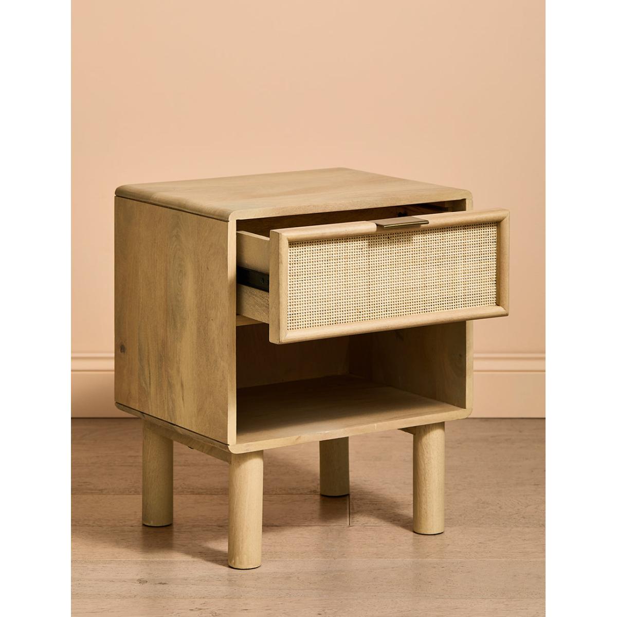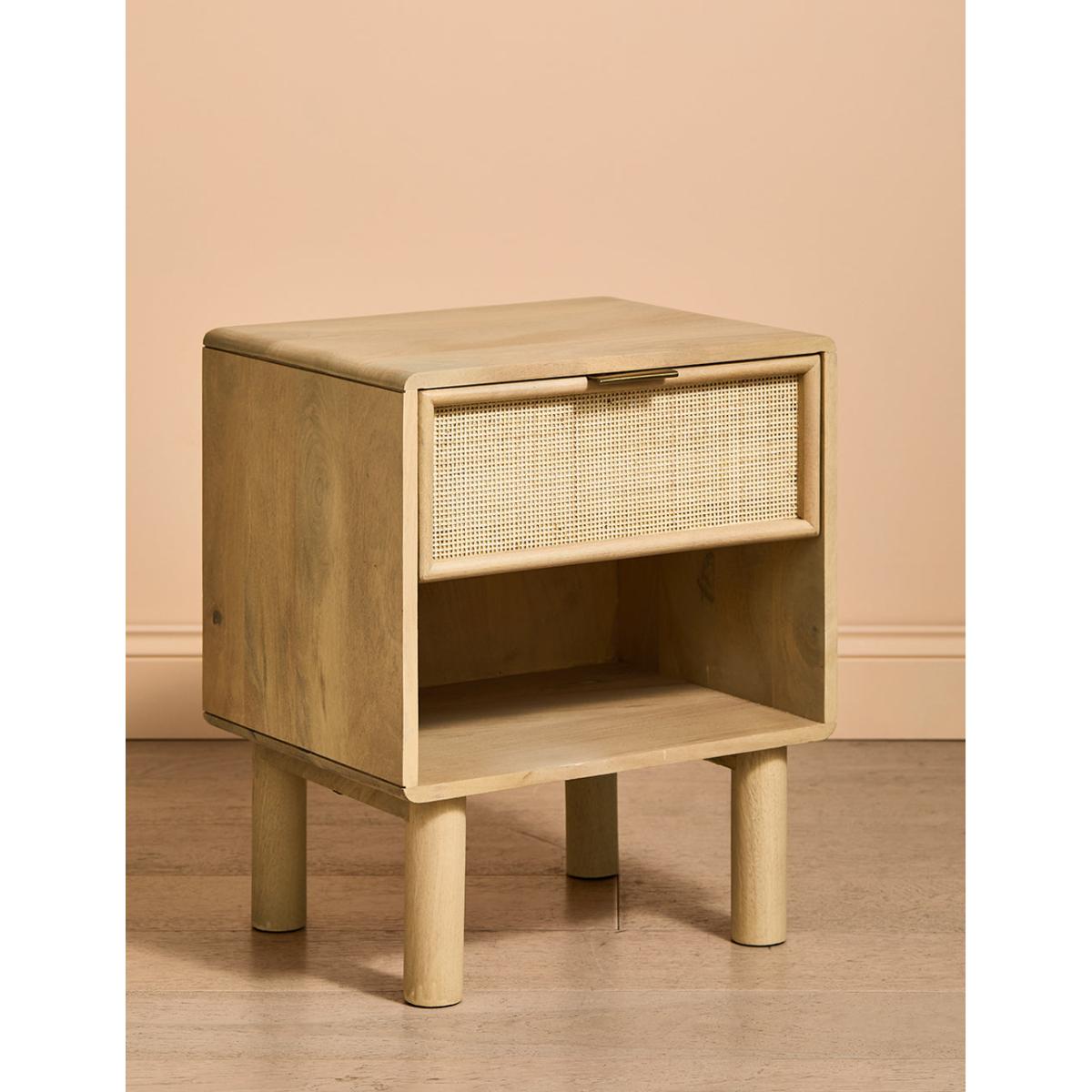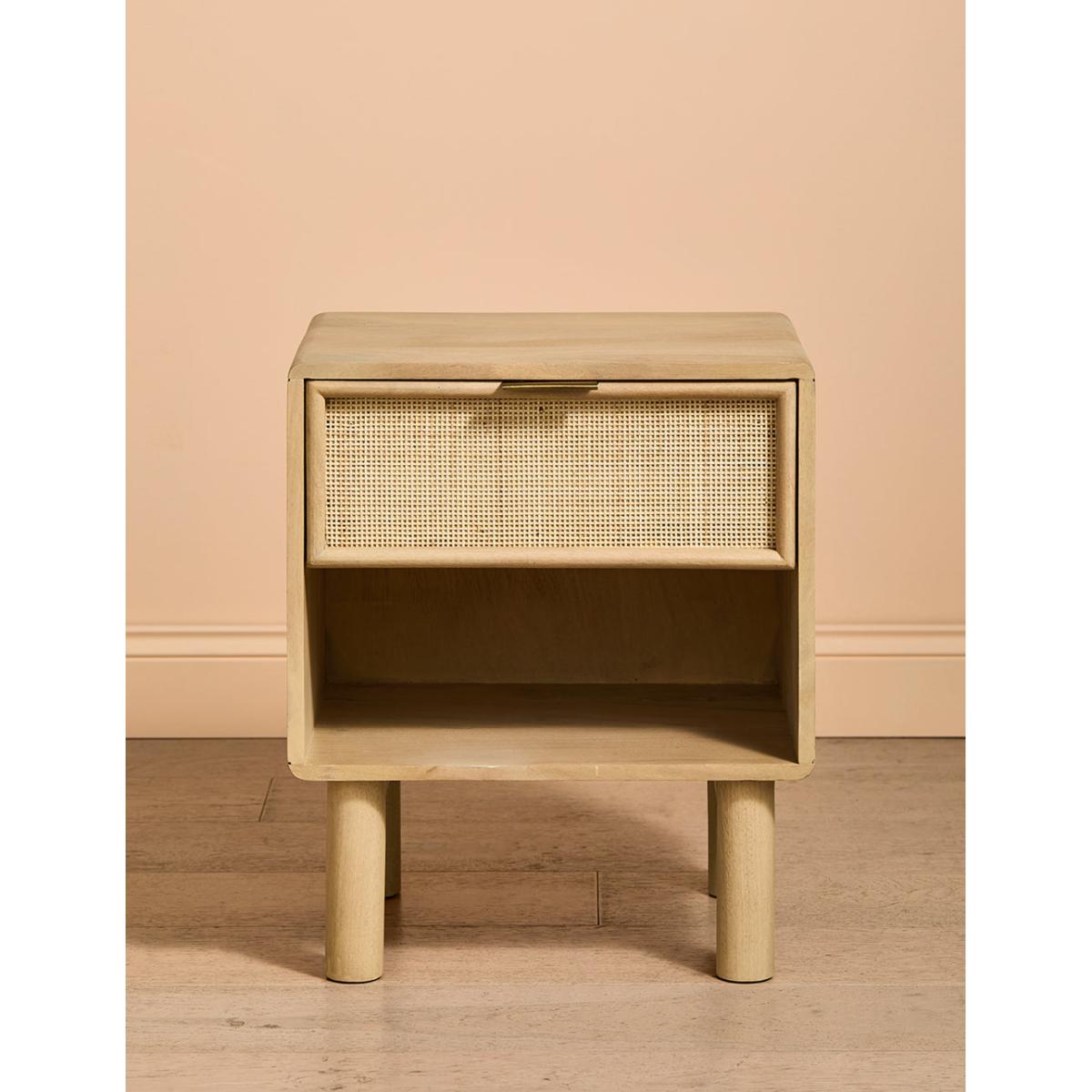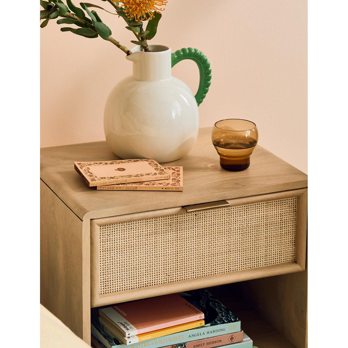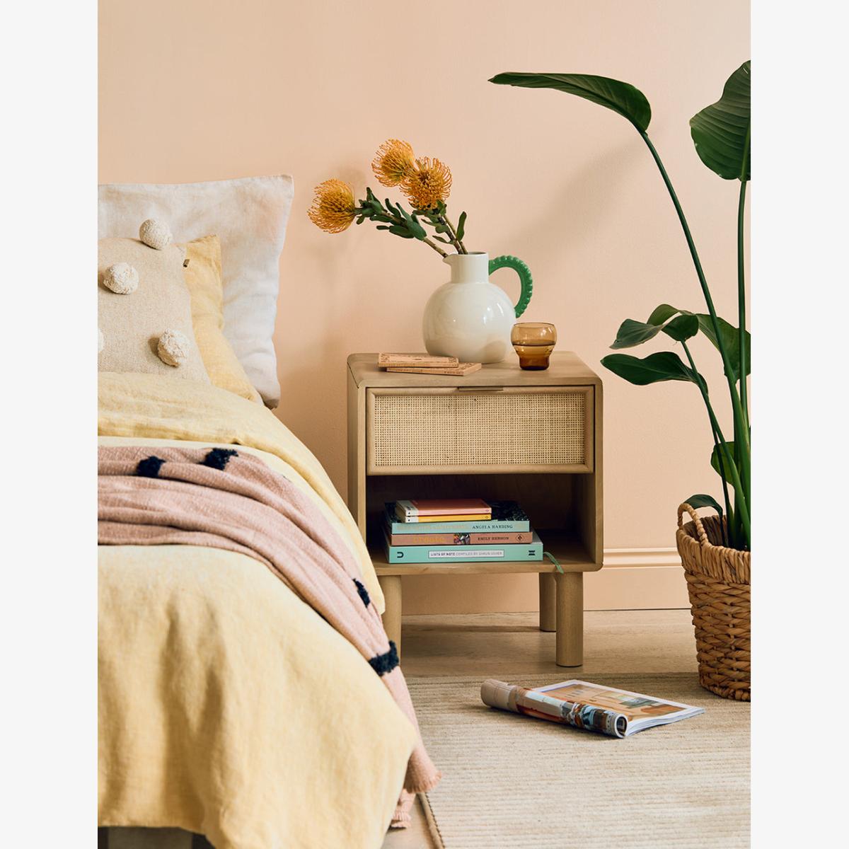 This collection features intricately woven cane set within a modern, minimal mango wood frame - think calm straight lines, perfect proportions and pared back details. We love the (almost) hidden brass handles. The bedside features an 'easy to stash your book' cubby hole and a generous drawer on runners for all of your hand creams, dream journals and sleep sprays. We also think this could be a super side table for a lounge. Also available as a console table, large sideboard, small sideboard, wide chest of drawers and a slim chest of drawers