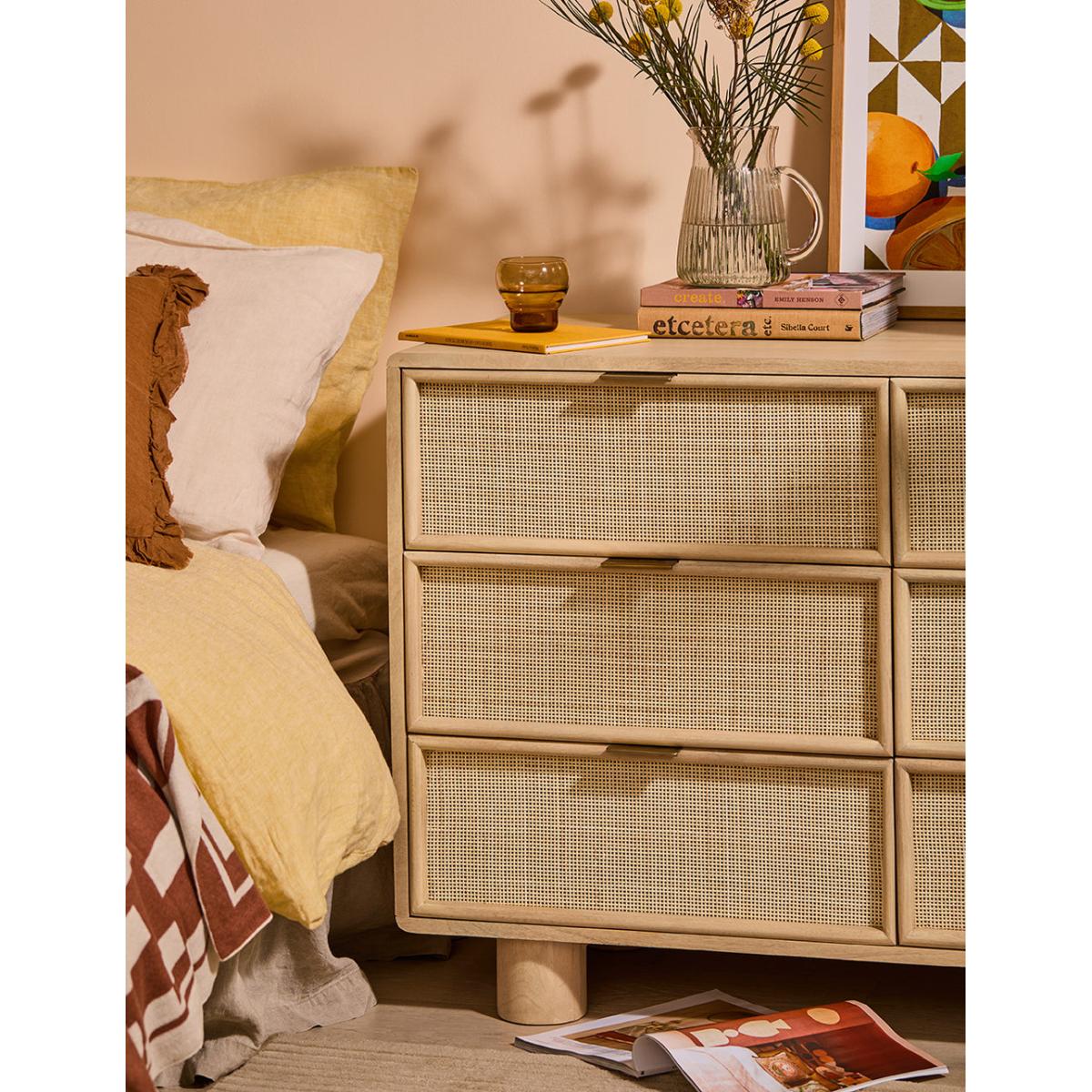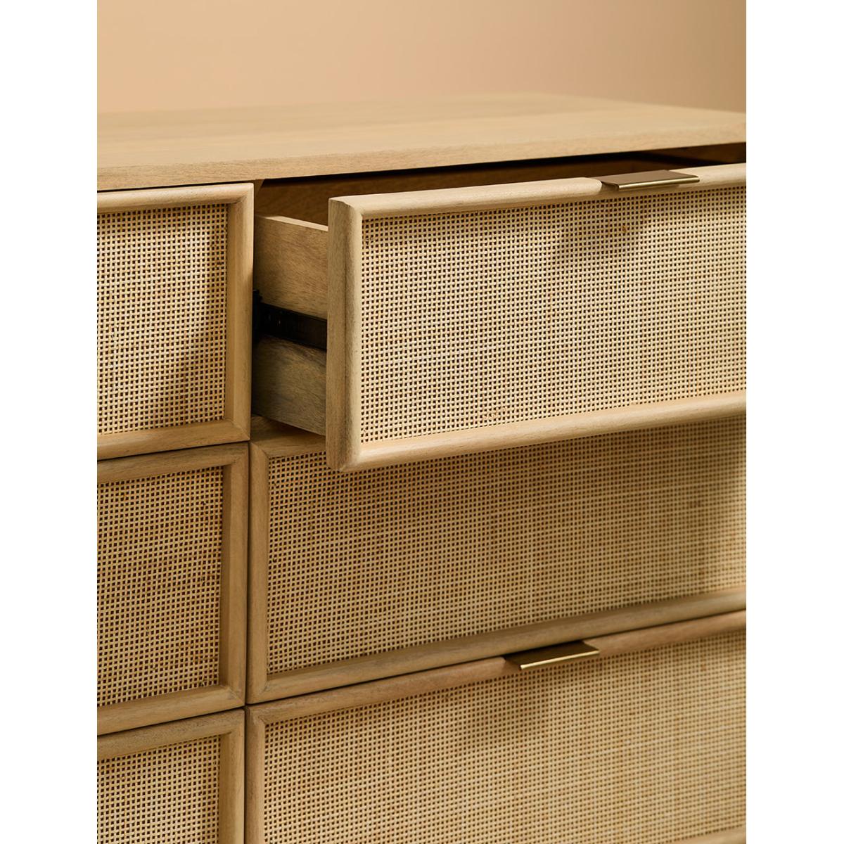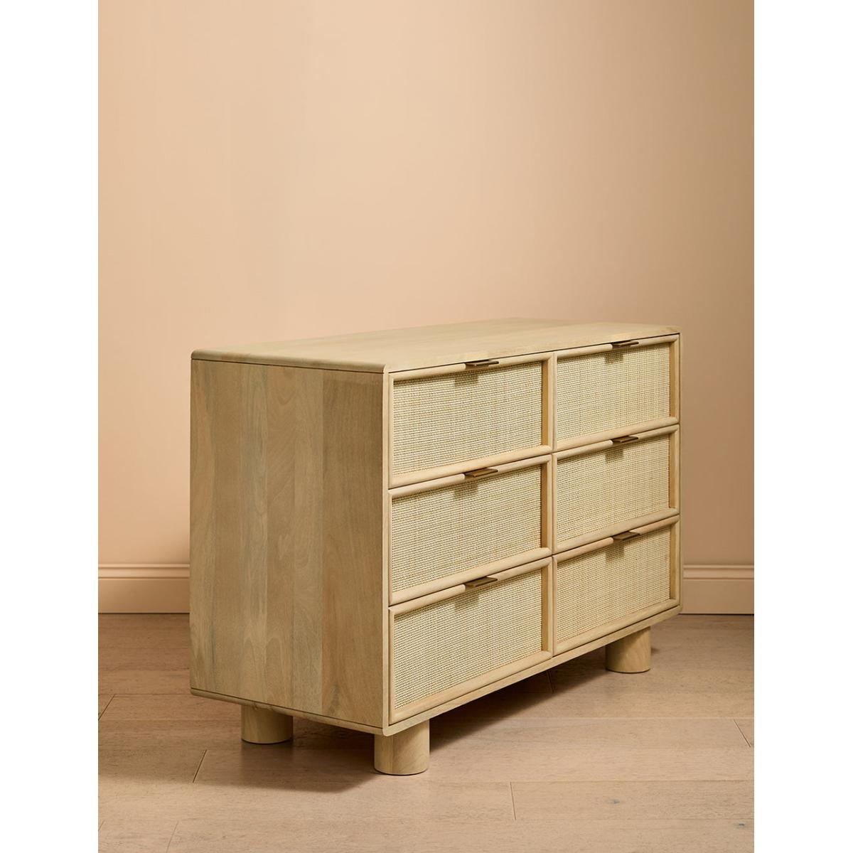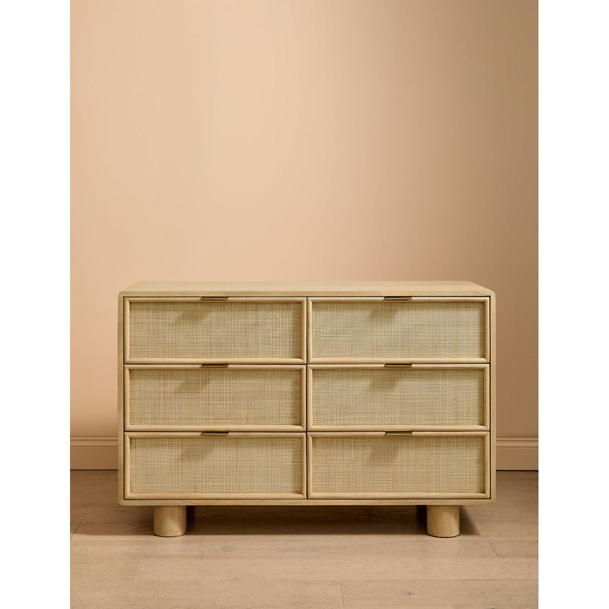 This collection features intricately woven cane set within a modern, minimal mango wood frame - think calm straight lines, perfect proportions and pared back details. We love the (almost) hidden brass handles. The wide chest of drawers features 6 deep drawers on runners and simple, elegant legs so youve got a little extra room underneath for more organising. A beautiful bedroom piece but will sit just as happily in a lounge (think of all those toys you could tidy) and even a kitchen space. Also available as a slim 3 drawer version, a large sideboard, small sideboard , bedside table and a console table