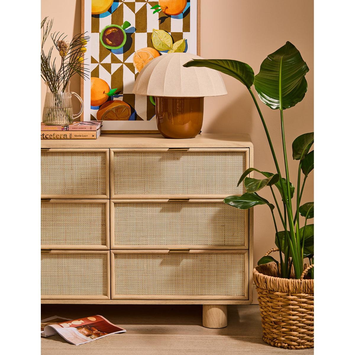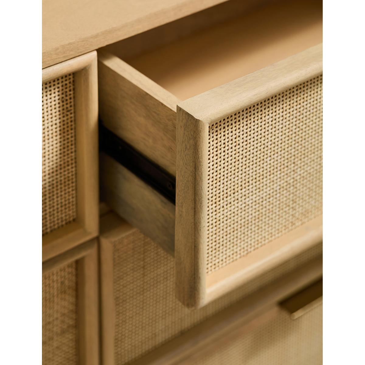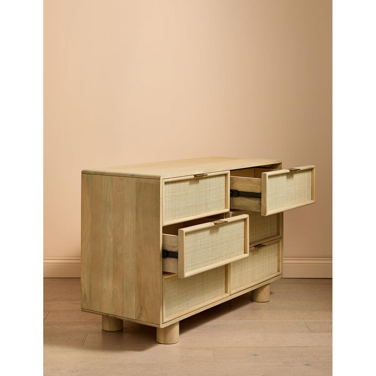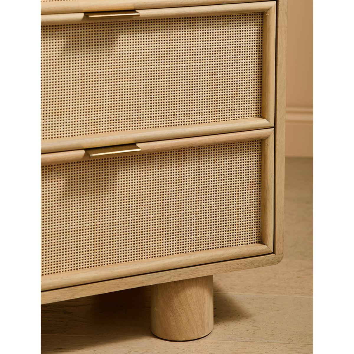 This collection features intricately woven cane set within a modern, minimal mango wood frame - think calm straight lines, perfect proportions and pared back details. We love the (almost) hidden brass handles. The wide chest of drawers features 6 deep drawers on runners and simple, elegant legs so youve got a little extra room underneath for more organising. A beautiful bedroom piece but will sit just as happily in a lounge (think of all those toys you could tidy) and even a kitchen space. Also available as a slim 3 drawer version, a large sideboard, small sideboard , bedside table and a console table