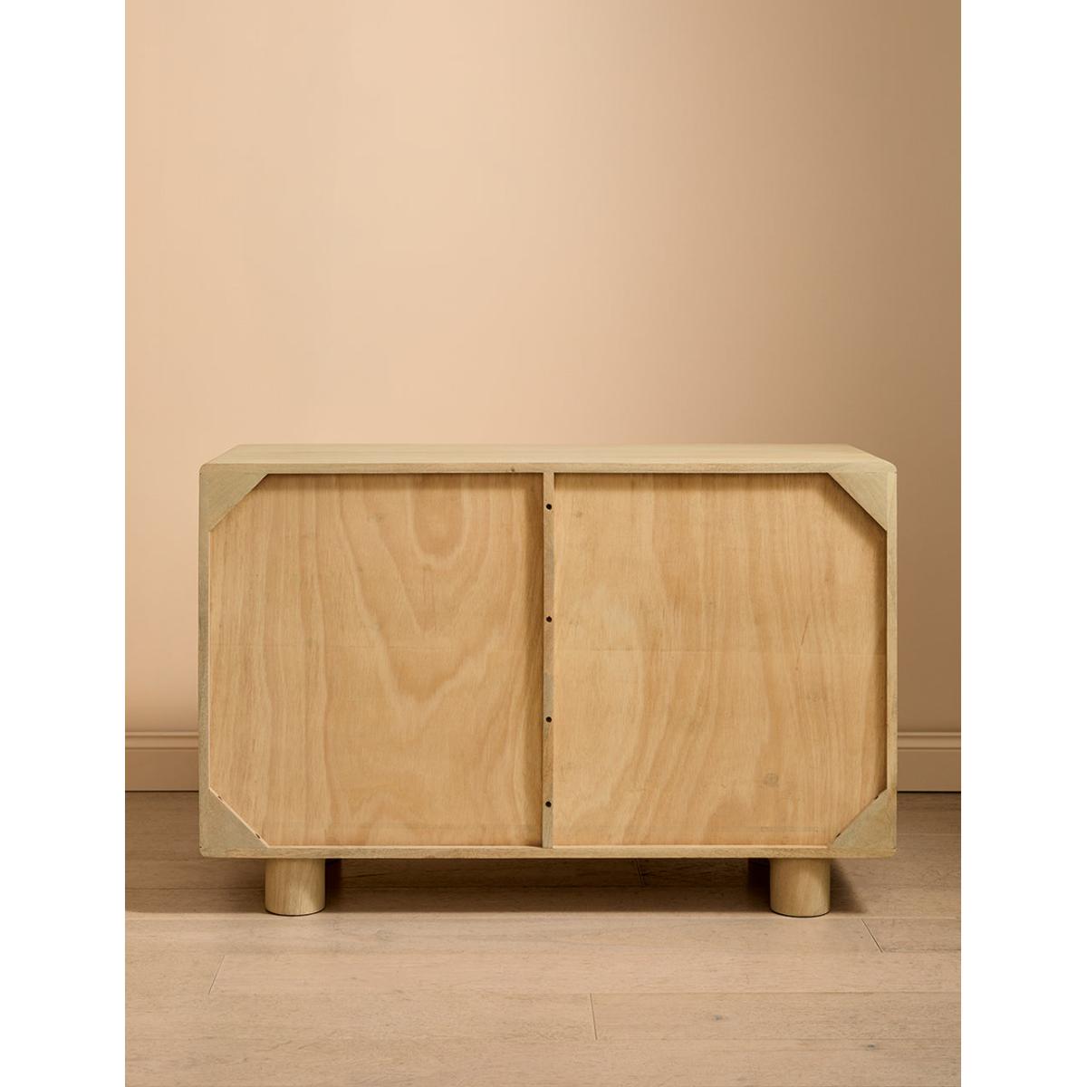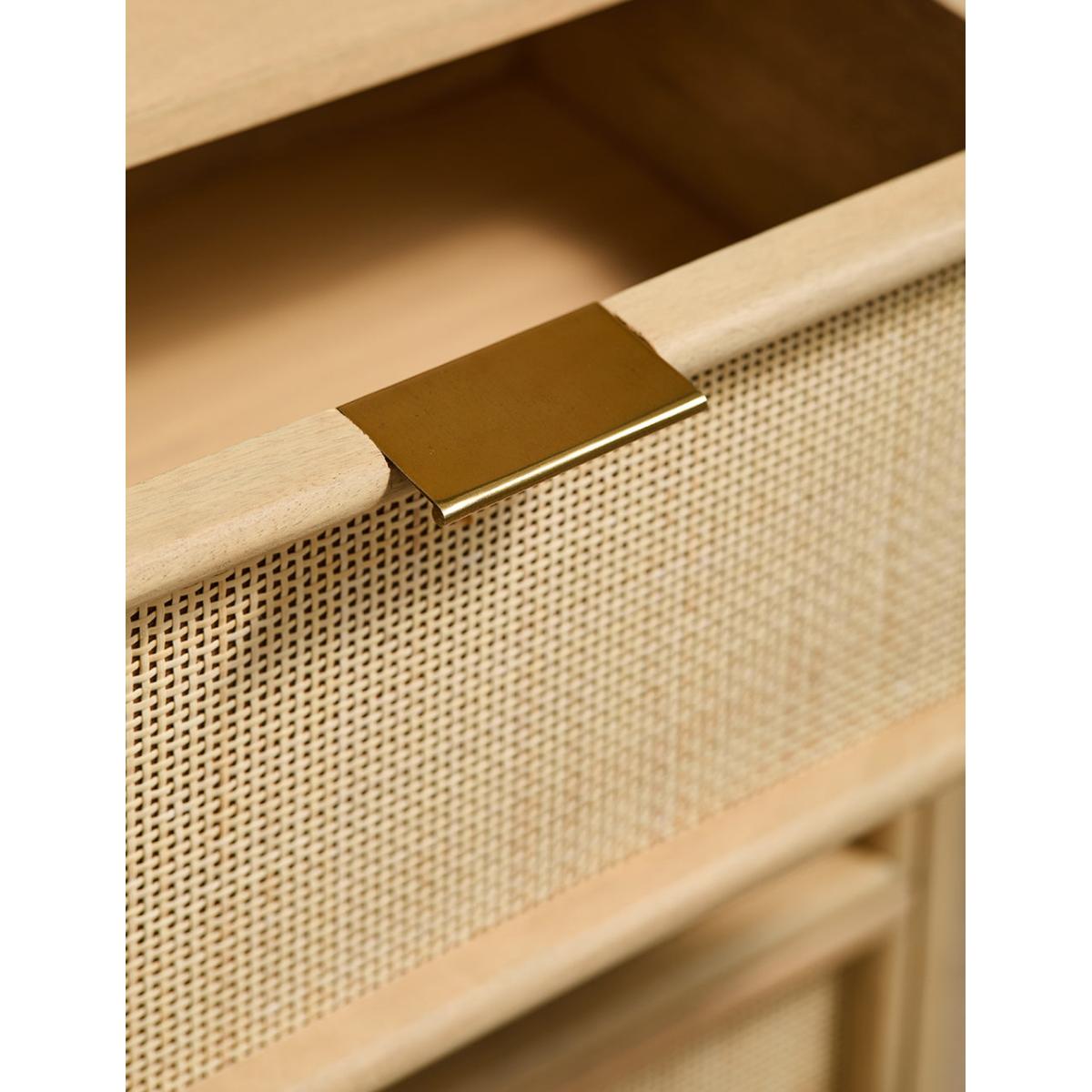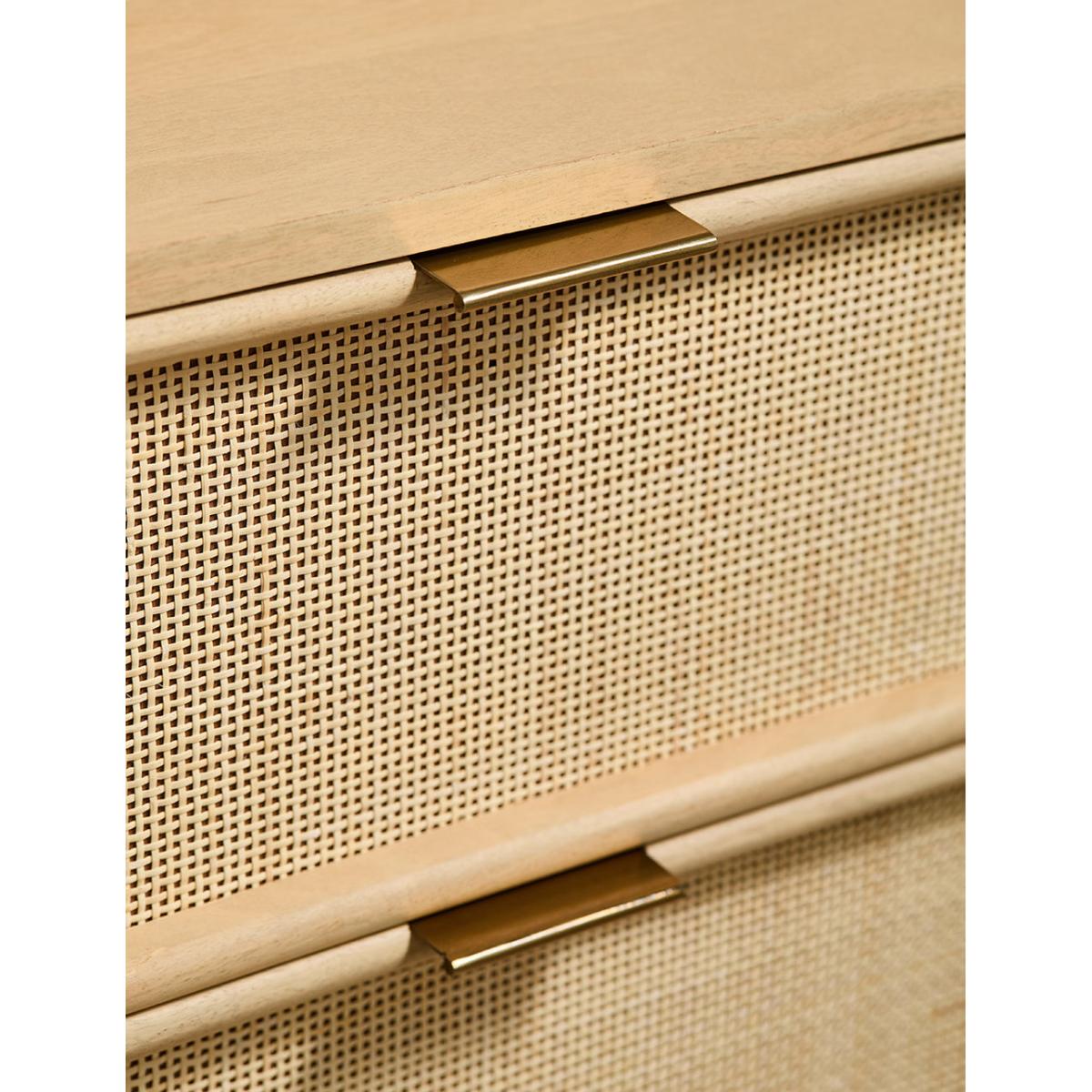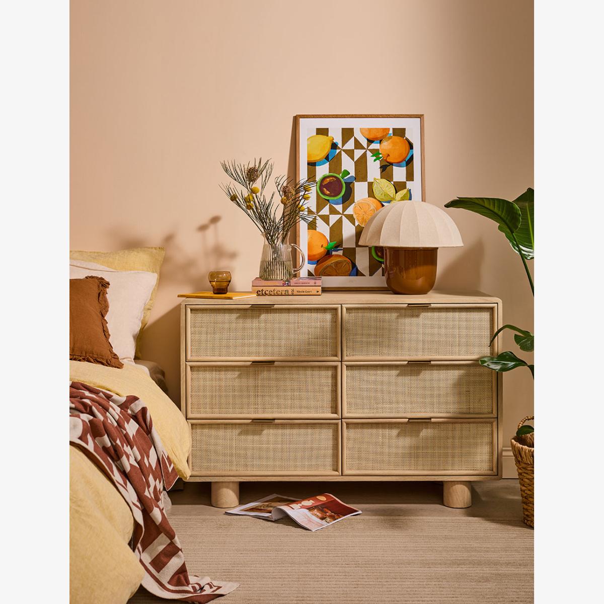 This collection features intricately woven cane set within a modern, minimal mango wood frame - think calm straight lines, perfect proportions and pared back details. We love the (almost) hidden brass handles. The wide chest of drawers features 6 deep drawers on runners and simple, elegant legs so youve got a little extra room underneath for more organising. A beautiful bedroom piece but will sit just as happily in a lounge (think of all those toys you could tidy) and even a kitchen space. Also available as a slim 3 drawer version, a large sideboard, small sideboard , bedside table and a console table