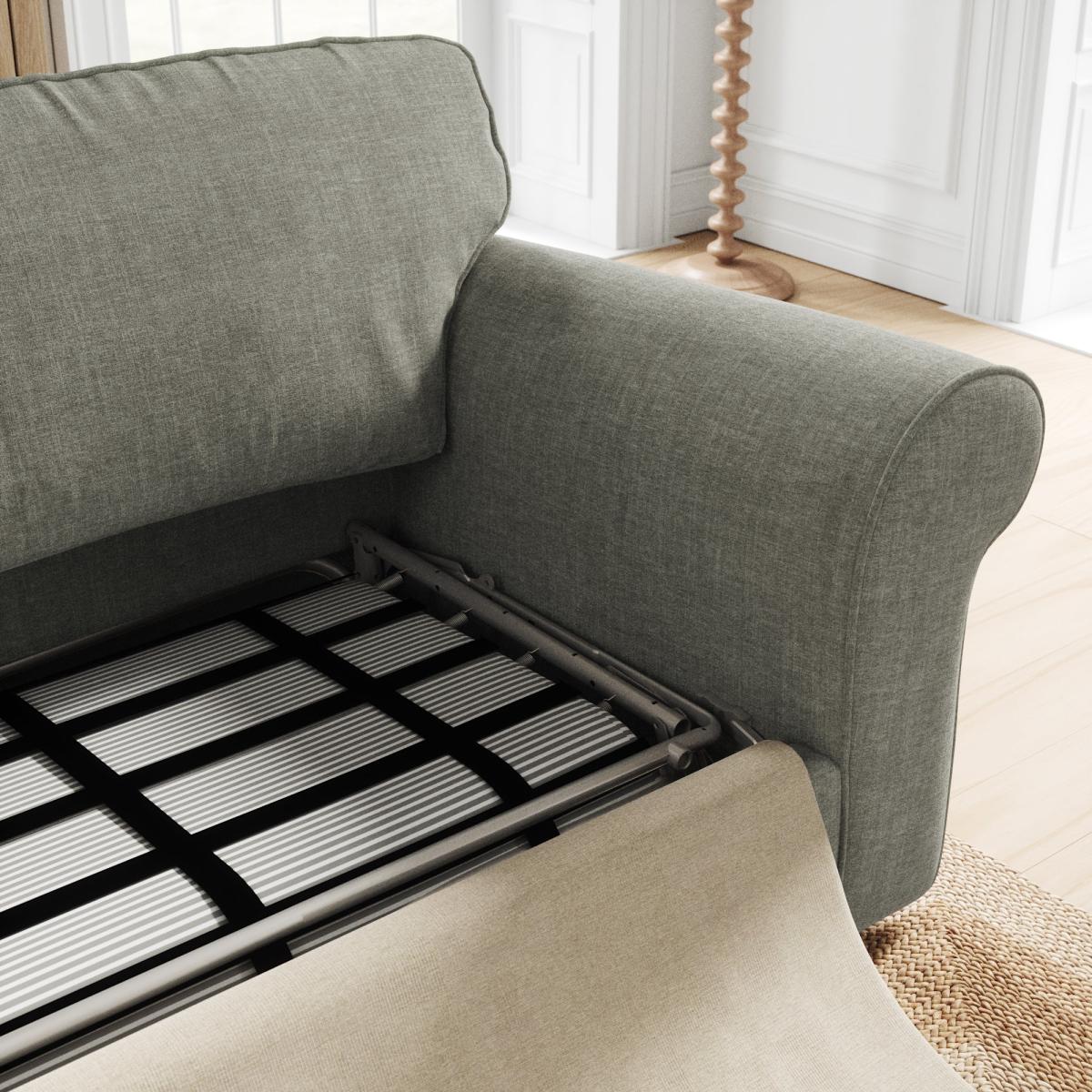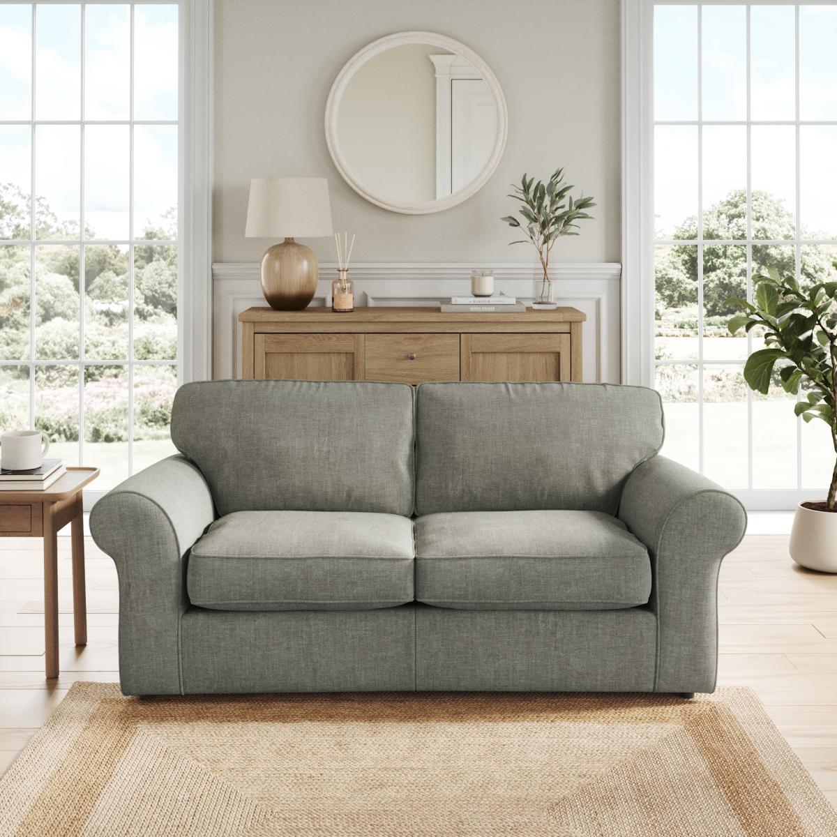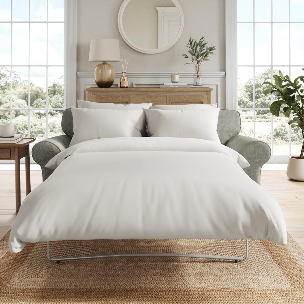 * Classic shape* Curved arms* Double mattress* Foam and fibre filled cushions Featuring gracefully curved arms and sturdy wooden legs, this sofa bed seamlessly blends timeless elegance with practical functionality. Upholstered in plush tonal plush chenille, it offers a cosy seating experience during the day and transforms effortlessly into a comfortable bed for overnight guests. Enhanced with brand-new foam cushions, it ensures enduring comfort and support whether lounging or sleeping. This product has fibre filled seat cushions. This means they require vigorous plumped by shaking and redistributing the fibres daily. This will add air back into the fibres and preventing clumping, flattening and the seat dipping.