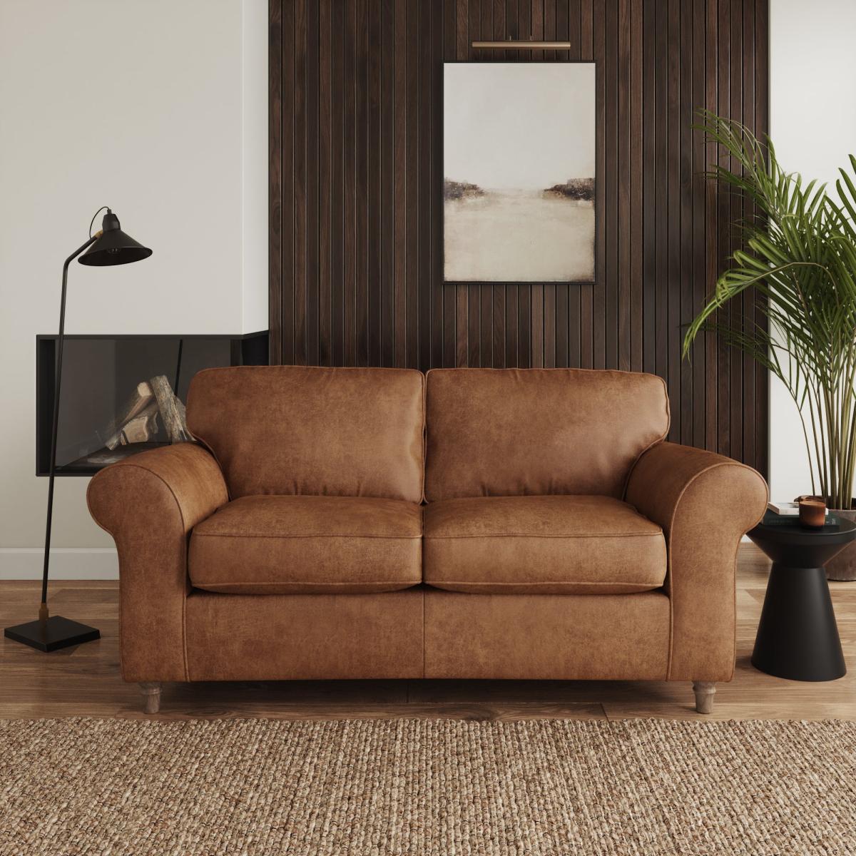 I’m a big fan of this tan two-seater sofa - its warm leather tone and gently rolled arms give it a timeless feel without looking fussy. It sits equally well in a Scandi-inspired space with pale woods and grey textiles or in an industrial loft alongside black metal accents and exposed brickwork. To style it, layer in a couple of soft, textured cushions (linen or boucle work nicely) and a lightweight throw over one arm for contrast. Anchor it with a natural-fibre rug, position a slim side table at one end for a lamp or plant, and you’ll have a welcoming focal point that’s both practical and effortlessly chic.